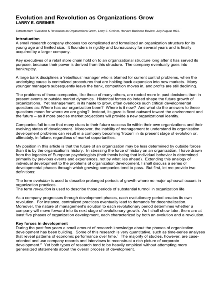 Evolution and Revolution as Organizations Grow LARRY E. GREINER _________________________________________________________________________ Extracts from ‘Evolution & Revolution as Organizations Grow’, Larry E. Greiner, Harvard Business Review, July/August 1972. Introduction A small research company chooses too complicated and formalized an organization structure for its young age and limited size. It flounders in rigidity and bureaucracy for several years and is finally acquired by a larger company. Key executives of a retail store chain hold on to an organizational structure long after it has served its purpose, because their power is derived from this structure. The company eventually goes into bankruptcy. A large bank disciplines a ‘rebellious’ manager who is blamed for current control problems, when the underlying cause is centralized procedures that are holding back expansion into new markets. Many younger managers subsequently leave the bank, competition moves in, and profits are still declining. The problems of these companies, like those of many others, are rooted more in past decisions than in present events or outside market dynamics. Historical forces do indeed shape the future growth of organizations. Yet management, in its haste to grow, often overlooks such critical developmental questions as: Where has our organization been? Where is it now? And what do the answers to these questions mean for where we are going? Instead, its gaze is fixed outward toward the environment and the future – as if more precise market projections will provide a new organizational identity. Companies fail to see that many clues to their future success lie within their own organizations and their evolving states of development. Moreover, the inability of management to understand its organization development problems can result in a company becoming ‘frozen’ in its present stage of evolution or, ultimately, in failure, regardless of market opportunities. My position in this article is that the future of an organization may be less determined by outside forces than it is by the organization’s history. In stressing the force of history on an organization, I have drawn from the legacies of European psychologists (their thesis being that individual behavior is determined primarily by previous events and experiences, not by what lies ahead). Extending this analogy of individual development to the problems of organization development, I shall discuss a series of developmental phases through which growing companies tend to pass. But first, let me provide two definitions: The term evolution is used to describe prolonged periods of growth where no major upheaval occurs in organization practices. The term revolution is used to describe those periods of substantial turmoil in organization life. As a company progresses through development phases, each evolutionary period creates its own revolution. For instance, centralized practices eventually lead to demands for decentralization. Moreover, the nature of management’s solution to each revolutionary period determines whether a company will move forward into its next stage of evolutionary growth. As I shall show later, there are at least five phases of organization development, each characterized by both an evolution and a revolution. Key forces in development During the past few years a small amount of research knowledge about the phases of organization development has been building. Some of this research is very quantitative, such as time-series analyses that reveal patterns of economic performance over time.1 The majority of studies, however, are caseoriented and use company records and interviews to reconstruct a rich picture of corporate development.2 Yet both types of research tend to be heavily empirical without attempting more generalized statements about the overall process of development. A notable exception is the historical work of Alfred D. Chandler, Jr., in his book Strategy and Structure.3 This study depicts four very broad and general phases in the lives of four large US companies. It proposes that outside market opportunities determine a company’s strategy, which in turn determines the company’s organization structure. This thesis has a valid ring for the four companies examined by Chandler, largely because they developed in a time of explosive markets and technological advances. But more recent evidence suggests that organization structure may be less malleable than Chandler assumed; in fact, structure can play a critical role in influencing corporate strategy. It is this reverse emphasis on how organization structure affects future growth which is highlighted in the model presented in this article. From an analysis of recent studies,4 five key dimensions emerge as essential for building a model of organization development: 1. 2. 3. 4. 5. Age of the organization. Size of the organization. Stages of evolution. Stages of revolution. Growth rate of the industry. I shall describe each of these elements separately, but first note their combined effect as illustrated in Figure 1. Note especially how each dimension influences the other over time; when all five elements begin to interact, a more complete and dynamic picture of organizational growth emerges. Evolution Large Revolution stages Company in high-growth industry Company in medium-growth industry Size of organisation Company in low-growth industry Small Young Mature Age of FIGURE 1 Model of organization development After describing these dimensions and their interconnections, I shall discuss each evolutionary/revolutionary phase of development and show (a) how each stage of evolution breeds its own revolution, and (b) how management solutions to each revolution determine the next stage of evolution. Age of the organization The most obvious and essential dimension for any model of development is the life span of an organization (represented as the horizontal axis in Figure 1
