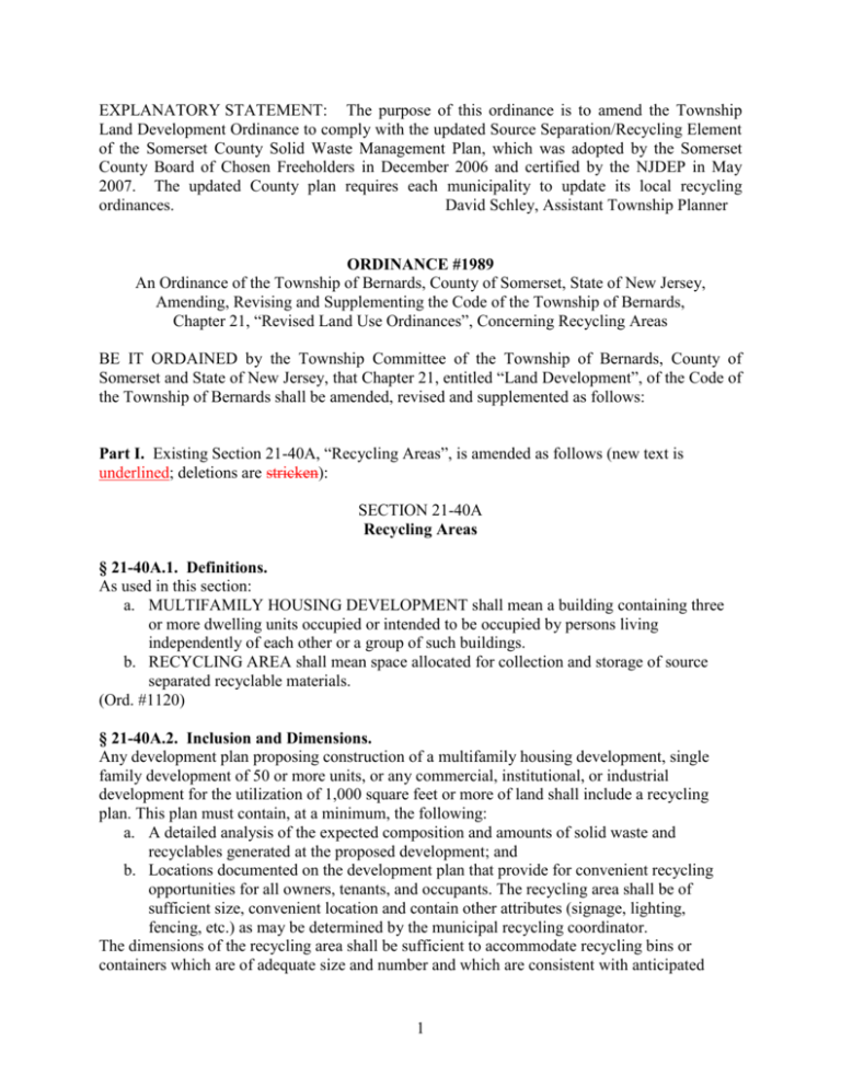 EXPLANATORY STATEMENT: The purpose of this ordinance is to amend the Township Land Development Ordinance to comply with the updated Source Separation/Recycling Element of the Somerset County Solid Waste Management Plan, which was adopted by the Somerset County Board of Chosen Freeholders in December 2006 and certified by the NJDEP in May 2007. The updated County plan requires each municipality to update its local recycling ordinances. David Schley, Assistant Township Planner ORDINANCE #1989 An Ordinance of the Township of Bernards, County of Somerset, State of New Jersey, Amending, Revising and Supplementing the Code of the Township of Bernards, Chapter 21, “Revised Land Use Ordinances”, Concerning Recycling Areas BE IT ORDAINED by the Township Committee of the Township of Bernards, County of Somerset and State of New Jersey, that Chapter 21, entitled “Land Development”, of the Code of the Township of Bernards shall be amended, revised and supplemented as follows: Part I. Existing Section 21-40A, “Recycling Areas”, is amended as follows (new text is underlined; deletions are stricken): SECTION 21-40A Recycling Areas § 21-40A.1. Definitions. As used in this section: a. MULTIFAMILY HOUSING DEVELOPMENT shall mean a building containing three or more dwelling units occupied or intended to be occupied by persons living independently of each other or a group of such buildings. b. RECYCLING AREA shall mean space allocated for collection and storage of source separated recyclable materials. (Ord. #1120) § 21-40A.2. Inclusion and Dimensions. Any development plan proposing construction of a multifamily housing development, single family development of 50 or more units, or any commercial, institutional, or industrial development for the utilization of 1,000 square feet or more of land shall include a recycling plan. This plan must contain, at a minimum, the following: a. A detailed analysis of the expected composition and amounts of solid waste and recyclables generated at the proposed development; and b. Locations documented on the development plan that provide for convenient recycling opportunities for all owners, tenants, and occupants. The recycling area shall be of sufficient size, convenient location and contain other attributes (signage, lighting, fencing, etc.) as may be determined by the municipal recycling coordinator. The dimensions of the recycling area shall be sufficient to accommodate recycling bins or containers which are of adequate size and number and which are consistent with anticipated 1 usage and with current methods of collection in the area in which the project is located. The dimensions of the recycling area and the bins or containers shall be determined in consultation with the municipal recycling coordinator and shall be consistent with the district recycling plan adopted pursuant to Section 3 of P.L. 1987, c. 102 (N.J.S.A. 13:1E-99.13) and any applicable requirements of the Municipal Master Plan, adopted pursuant to section 26 of P.L. 1987, c. 102. (Ord. #1120) § 21-40A.3. Location. The recycling area shall be conveniently located for the disposition of source separated recyclable materials, preferably near, but clearly separated from, a refuse dumpster. (Ord. #1120) § 21-40A.4. Accessibility. The recycling area shall be well lit and shall be safely and easily accessible by recycling personnel and vehicles. Collection vehicles shall be able to access the recycling area without interference from parked cars or other obstacles. Reasonable measures shall be taken to protect the recycling area, and the bins or containers placed therein, against theft of recyclable materials, bins or containers. (Ord. #1120) § 21-40A.5. Design of Containers. The recycling area or the bins or containers placed therein shall be designed so as to provide protection against adverse environmental conditions which might render the collected materials unmarketable. Any bins or containers used for the collection of recyclable paper or cardboard, and which are located in an outdoor recycling area, shall be equipped with a lid, or otherwise covered, so as to keep the paper or cardboard dry. (Ord. #1120) § 21-40A.6. Signs. Signs clearly identifying the recycling area and the materials accepted therein shall be posted adjacent to all points of access to the recycling area. Individual bins or containers shall be equipped with signs indicating the materials to be placed therein. (Ord. #1120) § 21-40A.7. Screening. Landscaping and/or fencing shall be provided around any outdoor recycling area and shall be developed in an aesthetically pleasing manner. (Ord. #1120) Part II. Existing Subsection 21-54.4, “Details Required for Preliminary Development Plans”, paragraph a.27, is hereby amended as follows (new text is underlined): 27. A solid waste management plan and a recycling plan, including locations and details of outdoor refuse and recycling storage areas and means of screening, in accordance with Sections 21-40 and 21-40A. Part III. Existing Appendix B, Article III, “Checklist, Application for Preliminary Approval of a Major Subdivision or Site Plan”, item #28, is hereby amended as follows (new text is underlined): 2 28. A solid waste management plan and a recycling plan, including locations and details of outdoor refuse and recycling storage areas and means of screening, in accordance with Sections 21-40 and 21-40A. The Township Clerk is directed to give notice at least ten days prior to hearing on the adoption of this ordinance to the Somerset County Planning Board and to all other persons entitled thereto pursuant to N.J.S. 40:55D-15 and N.J.S. 40:55D-63 (if required). Upon the adoption of this ordinance after public hearing thereon, the Township Clerk is further directed to publish notice of the passage thereof and to file a copy of the ordinance as finally adopted with the Somerset County Planning Board as required by N.J.S. 40:55D-16. The Clerk shall also forthwith transmit 