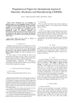 Preparation of Papers for International Journal of Materials, Mechanics and Manufacturing (IJMMM) First A. Author, Second B. Author, and Third C. Author Abstract—These instructions give you guidelines for preparing papers for the International Journal of Materials, Mechanics and Manufacturing (IJMMM). Use this document as a template if you are using Microsoft Word 6.0 or later. Otherwise, use this document as an instruction set. The electronic file of your paper will be formatted further at International Journal of Materials, Mechanics and Manufacturing. Define all symbols used in the abstract. Do not cite references in the abstract. Do not delete the blank line immediately above the abstract; it sets the footnote at the bottom of this column. Index Terms—About four key words or phrases in alphabetical order, separated by commas. B. Final Stage When you submit your final version, after your paper has been accepted, prepare it in two-column format, including figures and tables. C. Figures As said, to insert images in Word, position the cursor at the insertion point and either use Insert | Picture | From File or copy the image to the Windows clipboard and then Edit | Paste Special | Picture (with “Float over text” unchecked). The authors of the accepted manuscripts will be given a copyright form and the form should accompany your final submission. I. INTRODUCTION Highlight a section that you want to designate with a certain style, then select the appropriate name on the style menu. The style will adjust your fonts and line spacing. Do not change the font sizes or line spacing to squeeze more text into a limited number of pages. Use italics for emphasis; do not underline. To insert images in Word, position the cursor at the insertion point and either use Insert | Picture | From File or copy the image to the Windows clipboard and then Edit | Paste Special | Picture (with “Float over text” unchecked). INTERNATIONAL JOURNAL OF MATERIALS, MECHANICS AND MANUFACTURING reserves the right to do the final formatting of your paper. II. PROCEDURE FOR PAPER SUBMISSION A. Review Stage Submit your manuscript electronically for review. Manuscript received October 9, 2001. (Write the date on which you submitted your paper for review.) This work was supported in part by the U.S. Department of Commerce under Grant BS123456 (sponsor and financial support acknowledgment goes here). Paper titles should be written in uppercase and lowercase letters, not all uppercase. Avoid writing long formulas with subscripts in the title; short formulas that identify the elements are fine (e.g., "Nd–Fe–B"). Do not write "(Invited)" in the title. Full names of authors are preferred in the author field, but are not required. Put a space between authors' initials. F. A. Author is with the National Institute of Standards and Technology, Boulder, CO 80305 USA (e-mail: author@ boulder.nist.gov). S. B. Author was with Rice University, Houston, TX 77005 USA. He is now with the Department of Physics, Colorado State University, Fort Collins, CO 80523 USA (e-mail: author@lamar. colostate.edu). T. C. Author is with the Electrical Engineering Department, University of Colorado, Boulder, CO 80309 USA, on leave from the National Research Institute for Metals, Tsukuba, Japan (e-mail: author@nrim.go.jp). III. MATH If you are using Word, use either the Microsoft Equation Editor or the MathType add-on (http://www.mathtype.com) for equations in your paper (Insert | Object | Create New | Microsoft Equation or MathType Equation). “Float over text” should not be selected. IV. UNITS Use either SI (MKS) or CGS as primary units. (SI units are strongly encouraged.) English units may be used as secondary units (in parentheses). This applies to papers in data storage. For example, write “15 Gb/cm2 (100 Gb/in2).” An exception is when English units are used as identifiers in trade, such as “3½ in disk drive.” Avoid combining SI and CGS units, such as current in amperes and magnetic field in oersteds. This often leads to confusion because equations do not balance dimensionally. If you must use mixed units, clearly state the units for each quantity in an equation. The SI unit for magnetic field strength H is A/m. However, if you wish to use units of T, either refer to magnetic flux density B or magnetic field strength symbolized as µ0H. Use the center dot to separate compound units, e.g., “A·m2.” V. HELPFUL HINTS A. Figures and Tables Because the final formatting of your paper is limited in scale, you need to position figures and tables at the top and bottom of each column. Large figures and tables may span both columns. Place figure captions below the figures; place table titles above the tables. If your figure has two parts, include the labels “(a)” and “(b)” as part of the artwork. Please verify that the figures and tables you mention in the text actually exist. Do not put borders around the outside of your figures. Use the abbreviation “Fig.” even at the beginning of a sentence. Do not abbreviate “Table.” Tables are numbered with Roman numerals. Include a note with your final paper indicating that you request color printing. Do not use color unless it is necessary for the proper interpretation of your figures. Figure axis labels are often a source of confusion. Use words rather than symbols. As an example, write the quantity “Magnetization,” or “Magnetization M,” not just “M.” Put units in parentheses. Do not label axes only with units. As in Fig. 1, for example, write “Magnetization (A/m)” or “Magnetization (A m1),” not just “A/m.” Do not label axes with a ratio of quantities and units. For example, write “Temperature (K),” not “Temperature/K.” Multipliers can be especially confusing. Write “Magnetization (kA/m)” or “Magnetization (103 A/m).” Do not write “Magnetization (A/m) 1000” because the reader would not know whether the top axis label in Fig. 1 meant 16
