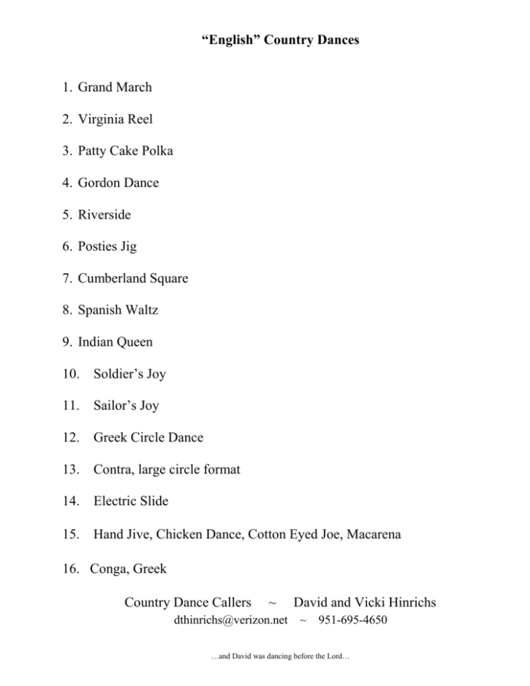 “English” Country Dances 1. Grand March 2. Virginia Reel 3. Patty Cake Polka 4. Gordon Dance 5. Riverside 6. Posties Jig 7. Cumberland Square 8. Spanish Waltz 9. Indian Queen 10. Soldier’s Joy 11. Sailor’s Joy 12. Greek Circle Dance 13. Contra, large circle format 14. Electric Slide 15. Hand Jive, Chicken Dance, Cotton Eyed Joe, Macarena 16. Conga, Greek Country Dance Callers ~ dthinrichs@verizon.net David and Vicki Hinrichs ~ 951-695-4650 …and David was dancing before the Lord… W-M W-M Grand March 4/4 W-M W-M 1. Start – Couples in a line, or circle if the room is not large enough, (ladies on inside left, men on outside right) march in circle, holding hands. 2. Transition from couples to line, ladies look back, and lady’s L takes man’s R W-M W-M W-M 3. Spiral into center, (lead couple man breaks from women on his right) W-M 4. Reverse spiral and fill room, remain single file until all unwound. W-M 5. Go back to couples after unwinding out of spiral W-M 6. Arch/tunnel – begin arch at location with room to complete it W-M A. lead couple joins hands above heads facing each other W-M B. next couple goes under arch and forms same arch. C. remaining couples follow suit 7. When last couple comes through - First couple follows last couple under arch, man first, and upon exiting the arch forms single line, circling the room with rest of group behind. 8. When arch is undone, go to couples and lead couple leads to location where group can come up middle of room 9. Come up middle and couples split off to back, one couple left, one couple right One leader should stay up front, and direct couples to the back, and another leader receives and instructs couples at the back. 10. At back two couples, (one from each side) join to become four and march front 11. At front one four turns and goes back to the left, and the next four turns and goes back to the right 12. At back fours join to become eights and march forward 13. At front eights stop and march in place until all eights have come forward Summary; couples - line – spiral – reverse spiral – arch/tunnel – line – couples – up middle – 2’s to 4’s to 8’s Grand March 1 Virginia Reel 4/4 1. Start with lines of eight couples, partners facing each other about 4 feet apart Head couple at top. (Give room for movement down the line, and from the next line.) 2. Couples (with your partner) A. bow/curtsey (salute your partner) B. Right hand swing C. Left hand swing M1 – W1 M2 – W2 M3 – W3 D. Both hand swing E. Do Si Do 3. Head couple sachet down the line and back 4. Head couple right arm swing (1½ turn) 5. Head couple weaves the line (repeating partner to non partner) -Left arm swings (½ turn) head couple to non partners -Right arm swing (½ turn) when head couple together. -At end of line head couple swings right hand with each other to put each other on the proper gender side 6. Head couple sachet up when finished weaving M4 – W4 M5 – W5 M6 – W6 M7 – W7 M8 – W8 7. Head couple cast off to end and line follows respective head 8. Head couple forms arch at bottom 9. All couples go through arch, and back to line formation 10. Next couple is now head couple, and dance begins again with step 2. Video links http://www.youtube.com/watch?v=l-_GgqY8q_g (An extra do-si-do is added on this one) Summary; 2 lines – bow/salute – right hand turn – left hand turn – both hand turn – do-si-do – sachet –1½ turn - weave – sachet up – cast off – arch and up – start over with new head couple Virginia Reel 2 L M M 7:46 in the recording, provides for 30 partner connections. L M L Patty Cake Polka L M M L This recording consists of 5 plays of a song back to back, (each about 1:30 long.) Each play consists of 6 partner connections. M M L Each partner connection consists of 32 beats divided into the M following 4 sections of 8 counts each. L L 1. Start – couples in circle (concentric with men on inside, women on out, (facing each other) Movement begins counter clock wise (men to left, women to right) 2. Heel/toe twice – “heel toe, heel toe” man left, woman right 1,2,3,4 3. Slide 4 steps, “slide, slide, slide, slide” – man left, woman right 5,6,7,8 4. Heel/toe twice – man right, woman left 1,2,3,4 5. Slide 4 steps, “slide, slide, slide, slide” 5,6,7,8 clockwise - man right, woman left 6. Couples face each other A. Thigh clap, 3 claps 1and, 2and B. Both hand clap, 3 claps, (man receives clap from woman) 3and, 4and C. Right hand clap, 3 claps 5and, 6and D. Left hand clap, 3 claps 7and ,8and 7. Spin away 1,2,3,4 Man’s right hand takes woman’s right hand and woman goes under man’s arm with a full turn to next man 8. Greet your partner 5,6,7,8 9. Repeat from step 2 continuously until rejoined with original partner. Summary; heal toe, heal toe, slide slide slide slide - heal toe, heal toe, slide slide slide slide, - thighs, both hands, rh, lh spinaway, greet your partner Patty Cake Polka 3 L L M L Gordon Dance M M The recording has 2 different versions; Version 1 is ”straight” about 7:40 long L M and contains 24 partner connections. M L Version 2 contains an interlude with M M “Freak Out.” It is 3:45 long and contains 12 partner connections. L M 1. Start – couples in circle holding partner’s hand (concentric with men on inside, women on out) all face counter clock wise. L L 2. Three steps forward (counter clockwise) followed by a ½ turn in place “step, step step and turn” After the turn grasp hands (4counts) 3. Three steps backward (counter clockwise) followed by a stop “back, back, back, stop” (4 counts) 4. Three steps forward (clockwise) followed by a ½ turn in place “step, step step and turn” After the turn grasp hands (4 counts) 5. Three steps backward (clockwise) followed by a stop “back, back, back, and stop” (4 counts) 6. Step together (shoulder to shoulder with partner) - Step apart. “together, apart” (4 counts) 7. Woman does ½ turn counter clockwise 
