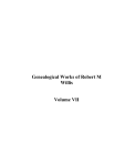 Genealogical Works of Robert M Willis Volume VII NOTE; Taken from disk #7 The Rucker Family The Willis Family From: The Genealogical Helper, Sep 1959 page 67 paragraph C-79 (p) CLARK, CLARK, Mrs Rogers M , 3216 Carrington, Memphis 11, Tenn. Wanted: Diary of George Willis b 1754 VA, Rev Sol GA, Was he father Stephan WILLIS of NC or VA? Mar Susannah DABNEY? The Genealogical Helper, Sep 1958 Page 60 B 175 BROOM $10.00 reward; Documentary proof of b place & parentage of James BROOM whose w was Esther WILLIS, father of Jacob BROOM 1752-1810 Signer of Constitution of United States. I am wondering if you already have these two WILLIS items. They came from the 1958 & 1959 Gen H. I had some more but they were from the 1962 copy. I saw your name in the 1962 issue of Sep so I knew it was not necessary to send them. 4783 Lubbock Ave Ft Worth 15, Texas July 3, 1961 Mr Robert Willis Route 1, Box 1 Ironton, Ohio Dear Mr Willis, A friend and fellow researcher, Miss Virginia Wilson of Lexington, KY, had seen your name at KY Hist Lib and that you are a Willis searcher; hence, my letter to you. I have so many Willis lines, not my own, while my own particular James remains elusive. James Willis was b 1755 m Elizabeth Wilson (Bible), d 1796 Chatham Co, NC, leaving will naming ch: Sukey; Jemima; Wilson (eldest son); Larkin b 1777 m Mary Reese; Molley m perhaps Walton; Nanney; youngest sons Elisha & Elijah; Rebecca Caudle; Salley Crow. Witness: Mechuel Wilson Jr & Samuel Wilson; Exers; Wilson Willis & Thomas Bell. Old Bible says “relatives lived on Richland Creek in KY”. Sons Wilson, Elijah & Elisha went to Robertson Co, Tenn by ca 1815; son Larkin (mine) went to Hawkins Co, Tenn by ca 1804 where he d 1859. I have the desc of Larkin in Tenn, Ala, Mo & Texas up to ca 1900. Now, for 3 years, I have been trying to find the parents of James & Elizabeth (Wilson) Willis, both “said” to have been b in VA. If by some vast miracle, you know anything of this Willis line, I would appreciate any information at all, references, addresses or just anything. Sincerely, Nancy T Samuels (Mrs I Neal) 2 1727 Thomas Road Medford, Oregon April 18, 1962 Mr Robert M Willis R F D 1, Box 1 Ironton, Ohio Dear Mr Willis, It is nice to hear from you. I will be interested to hear how you are progressing with your family research. In Genealogy I have what I call my “wanted list”. Since I heard from you I have your Susanna on my list. I am not a professional genealogist. My search has been on my two families…the Lloyd and Wren families. I become discouraged at times but I keep on and I do make some progress. The next time that I go to the Library I shall look for your Susanna Rucker. I hope that I can help you find her parents. In your last letter you wrote that you would sell your copy of the RUCKER Family Genealogy with Ancestors, Descendants and Connections….compiled by Sudie RUCKER Wood. I am not financially able to pay 25 dollars but I can give you twelve dollars plus the cost of mailing the book if the book is in good condition. Recently I saw a notice of one being sold by some Book Company. It was priced for nine dollars, I believe it was. Let me know please what you decide to so. You can address the book to me C O D, “Collect on Delivery” at the Medford, Oregon U S Post Office. Then I will pay for the book at the U S Post Office in Medford, Oregon and they will send you the money. There is a rate on mailing books. I think the book can be insured for its value. I make and error: I should have said “Put my name and address on the book but have it come C O D so the Post Office will hold the book and then they will notify me so I can pay them the cost at the U S Post Office. Thanks for your special good wishes. My health has improved and I am very thankful. I send real good wishes to you in your family search. Sincerely yours, Mrs Anna Diahl 1727 Thomas Road Medford, Oregon 3 1114 6th St 5 May 1962 Prosser, Wash Robert Willis RUCKER” RFD 1, Box 1 Ironton, Ohio OHIO RECORDS AND PIONEER FAMILEIS “WILLIS- Dear Mr Willis: Enclosed is a pedigree chart showing our connection to the RUCKER family. I have been unable to locate a WILLIS-RUCKER marriage in my records, but many of my records on the RUCKER family are not complete. (Opal Fellows is my wife’s mother.) We are trying to make our information as complete as possible so would like very much to correspond with everyone interested in the RUCKERS. I am now trying to substantiate the lineage as given on the enclosed chart as there are some discrepancies between different sources. My information is from the book HISTORY OFR THE RUCKER FAMILY AND THEIR DESCENDANTS (or) RUCKERS AND CONNECTIONS by Edythe Johns Rucker Whitley, pub 1927. John RUCKER b abt 1794 in Virginia md ______ . In early youth he moved to Monroe Co, Ohio with his parents and ( there evidently married) and had Ruth who married Uriah Hague in Ohio. Their daughter, Mary Jane Hague, was born 18 Feb 1856 in Lawrence Co, Ohio. We believe Ruth RUCKER died in Lawrence Co, Ohio about 1860. Uriah Hague married a 16 year old German girl who raised his family and also bore Uriah 3 or 4 more sons. Uriah moved to Missouri and Mary Lane Hague married Samuel Wesley Lilly at Stanberry, Gentry Co, MO. Many of these RUCKERS were from Culpeper Co, VA. The only Susan (Susannah) I have found that would be about the same time of your Susanna is: Susannah (Peter 3, Thomas 2, Peter 1) b Culpeper Co, VA 1776 (Probably 1766) d in Pine Ridge, Miss on 12 Dec 1835 md 10 July 1784 to John Bisland b in Scotland March of 1742 and d in Pine Ridge on April 17, 1821. Many of the RUCKERS from VA went into Ohio, Georgia and Mississippi. From the Gallia Co, marriage records: Uriah RUCKER md Polly Stewart Aug 25, 1842, and Robert RUCKER married Elizabeth Vermillion 27 Feb 1814. They are father and son and may be connected to our RUCKERS as the name is scarce in that part of Ohio. Larkin RUCKER, a cousin of Ruth RUCKER (who married Uriah HA