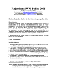 Rajasthan SWM Policy 2005 [Draft prepared on 23.9.2005 by Mrs Almitra Patel almitrapatel@rediffmail.com, 98443 02914, Mrs Ragini Jain jainj@rediffmail.com, 98212 80214 and Mr Gurudatta Tendulkar ecodesigns@vsnl.net, 98906 16547 Mission: Rajasthan shall be the first State with garbage-free cities Mission Structure: Start a State Technology Mission for Solid Waste Management (SWM) headed by a dynamic officer of top integrity with enthusiasm for the subject, on 3-5year deputation, to work full-time with No Other Responsibilities, plus a small full-time support team, to implement all the suggestions and recommendations of the Supreme Court Committee Report on SWM for Class 1 Cities as fully as possible, as fast as possible. The team leadership will make all the difference. The SWM Technology Mission should have adequate autonomy and discretionary powers for flexible financial and policy decisions to achieve rapid time-bound progress. It should encourage and interact with an SWM policy cell in each LSG for giving effect to the Action Plan below. SWM Action Plan: Top Eight Objectives: 1, MINIMISE WASTE TO LANDFILLS through separate collection streams and clear Policies and Strategies for productive use of: 2, “Wet Waste” = Uncooked and cooked kitchen waste, flower and fruit wastes 3, “Dry Waste” = Recyclables (paper, plastics, metals, glass, rubber, foam, rags…) 4, Inerts =Construction & Demolition wastes, Drain Silt, road diggings & sweepings 5, Nuisance &Household Hazardous wastes (multifilms, tubelights, pesticide spray cans, batteries, paint cans, oils, etc) 6, Policy for Waste Processing Options 7, Development of Engineered Landfills for Ultimate unavoidable disposal 8, Administrative policy changes, SWM training and capability development at all levels of service delivery. 1, Minimize wastes to landfills as per Schedule II (5) of MSW Rules. Target: No annual increases in volumes of waste to landfill despite increasing urban population or per-capita waste generation, and preferably some target annual reductions of waste weights/volumes, e.g. 5% less per annum. 1.1 Keep inerts out of garbage. 1.2 Separate collection, transport and handling streams for different wastes. 1.3 “Mera Aangan Saaf” byelaws esp for commercial areas, to keep mixed wastes out of drains and service lanes adjoining specific properties. Byelaws should include both rewards for good performance as well as penalties for waste in drains or on roads. “Carrying charges” should initially be levied only for Trade Wastes. 1.4 Area greening and beautification through Wardwise use of compost. 1.5 Nala Gardens to create beautiful recreational ribbons throughout the town and discourage waste-dumping (and annual heavy desilting costs), while allowing surge flow of rainwater through these storm drains as designed. [Pune model, contact PMC Horticulture Supt Yashwant Khaire 98230 73622 or his asst Vikram Gaekwad 94223 58622 for design concepts & technology, and Lt Col Patil, 020-3103 1617 res, 2249 1286 or 2249 2588 at plant nursery, greenthumbpatil@yahoo.co.in for actual planting implementation of a model demonstration stretch]. 1.6 Progressively minimise transport distances and costs through above policies. Also ensure space in town plans for waste transfer stations if processing and landfilling sites are too far away. 1.7 Have a benefit-sharing policy for transport or SWM cost savings with the neighbourhood groups or slums responsible for the savings. (E.g. 1/3 to group, 1/3 to LSG, 1/3 to transport contractor who delivers waste to decentralized composting bio-bins instead of taking it to centralized weighbridge point for transport payment). 1.8 Encourage minimization of Trade Wastes through Carrying Charges. 2. Wet Waste Management 2.1 Daily doorstep collection of ‘Wet’ waste (kitchen wastes, flowers). Door-to-door segregated waste collection services should ideally be provided by an entrepreneur (e.g. Muskan Jyoti Samiti in Lucknow, claiming to service 1.5 lakh households) or a professional team with SWM experience (e.g. Kerala’s Waste Business of Kerala’s Kudumbashree self-help groups in many towns). 2.2 Decentralised composting of wet waste, preferably in bio-bins [Ragini Jain] especially in unmanned areas and hard-to-access slums. Decentralised composting services should also be provided by a specialist group (e.g. Vatavaran in Delhi claiming to cover 5 lakh population) as dependence on the sustained enthusiasm of individual residents does not prove viable long-term. 2.3 Replace dumper-placers and containers with bio-bins (2 per 100 households or 100 kg wet waste). Each collection-cum-bio-bin composting onsite, provides an hour-a-day additional income to three BPL persons. Costs are more than met by savings in transport costs (currently averaging a few hundred rupees per ton for collection and transport). Household payments, if any extra funds are required, should only be direct to the service provider, not to the LSG. 2.4 Use compost locally for city greening, including service lanes. This provides additional part-time gardening income to one more BPL person per bio-bin unit. 2.5 Building construction bye-laws must make it compulsory for all new buildings / apartments to have on-site bio-bins for decentralized sanitizing of wet wastes and separate group storage of dry wastes, ensured when giving completion cert. 2.6 Green Line eatery wastes can also be composted in a decentralized way, if not transported and delivered out of town to encourage relocation of piggeries etc. 2.7 Follow best practices of other cities for special attention to waste collection in slums without waste touching the streets. [Almitra Patel]. 2.8 Policies for Minimisation and Management of Special Wastes [Almitra Patel]: Slaughter waste, Market waste, Eatery waste, Trade waste, Stable waste, Street food etc. [Specific suggestions can be given to SWM Mission Head from time to time as prioritised, since everything cannot and should