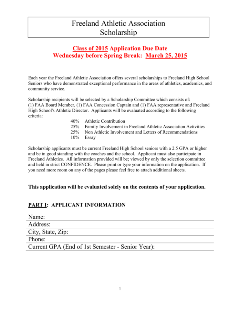 Freeland Athletic Association Scholarship Class of 2015 Application Due Date Wednesday before Spring Break: March 25, 2015 Each year the Freeland Athletic Association offers several scholarships to Freeland High School Seniors who have demonstrated exceptional performance in the areas of athletics, academics, and community service. Scholarship recipients will be selected by a Scholarship Committee which consists of: (1) FAA Board Member, (1) FAA Concession Captain and (1) FAA representative and Freeland High School's Athletic Director. Applicants will be evaluated according to the following criteria: 40% Athletic Contribution 25% Family Involvement in Freeland Athletic Association Activities 25% Non Athletic Involvement and Letters of Recommendations 10% Essay Scholarship applicants must be current Freeland High School seniors with a 2.5 GPA or higher and be in good standing with the coaches and the school. Applicant must also participate in Freeland Athletics. All information provided will be; viewed by only the selection committee and held in strict CONFIDENCE. Please print or type your information on the application. If you need more room on any of the pages please feel free to attach additional sheets. This application will be evaluated solely on the contents of your application. PART I: APPLICANT INFORMATION Name: Address: City, State, Zip: Phone: Current GPA (End of 1st Semester - Senior Year): 1 PART II: ATHLETIC INFORMATION Freshman Year: Team Activity, Achievements, etc...... Fall: Winter: Spring: Summer: Sophomore Year: Team Activity, Achievements, etc...... Fall: Winter: Spring: Summer: Junior Year: Team Activity, Achievements, etc...... Fall: Winter: Spring: Summer: Senior Year: Team Activity, Achievements, etc...... Fall: Winter: Spring: Summer: 2 PART III: Family Involvement in the Freeland Athletic Association Name of Parents/Guardians: Names and Ages of other children in family: Describe all family members’ involvement (including yourself) in the Freeland Athletic Association in detail. We are looking for participation details that help our Athletic Association run smoothly. For example: involvement in the Millionaire Party, Fish Fry, Concession Stand, Ball Drop fundraiser, Field Maintenance/worker, attendance at FAA meetings, Team Parent, FAA Board position, etc. Freshman Year Family Member Name FAA Activity/Role Approximate Hrs Family Member Name Sophomore Year FAA Activity/Role Approximate Hrs Family Member Name Junior Year FAA Activity/Role Approximate Hrs Family Member Name Senior Year FAA Activity/Role Approximate Hrs 3 PART IV: NON-ATHLETIC INVOLVEMENT - List extracurricular activities, clubs, organizations, and/or positions held during high school. Also include any awards or honors you have received. Freshman Year Activity, Offices held, etc Participation/Involvement/Approximate Hrs. Activity, Offices held, etc Sophomore Year Participation/Involvement/Approximate Hrs. Activity, Offices held, etc Junior Year Participation/Involvement/Approximate Hrs. Activity, Offices held, etc Senior Year Participation/Involvement/Approximate Hrs. 4 PART V: RECOMMENDATION LETTERS Please submit TWO letters of recommendation. One must be by a coach and the second from a non-family member. The TWO cannot be from the same teacher you are asking for an evaluation from. PART VI: TEACHER EVALUATION Please ask two Freeland teachers from your Junior or Senior year to complete an attached CONFIDENTIAL evaluation form. These will be turned into the FAA; not returned to the applicant. Make sure you have each teachers sign the checklist below when you ask them to fill out the evaluation form. This will be proof that you completed your part of the task. PART VII: ESSAY (200 - 500 words typed) What are your educational goals? Application Checklist: _____ Completed scholarship form _____ Applicant and Parent signatures on application below _____ Two letters of recommendations included _____ Typed Essay attached _____ Teacher's evaluations given to: Print Teacher's name Teacher's Signature 1. ______________________________________ __________________________________ 2. ______________________________________ __________________________________ All the information on this form is true and complete to the best of my knowledge. Signature of Applicant: ______________________________________ Date: ____________ Signature of Parent or Guardian: ______________________________ Date: ___________ If you receive the FAA scholarship would you be available to help at the Millionaire party this year (held in June)? ____________________ June 21st (set up) and June 22nd (party) 5 FAA SCHOLARSHIP TEACHER EVALUATION Name of Applicant: ______________________________________________________ 1. How long have you known this applicant? 2. What course(s) have you taught this applicant? 3. Do you think the applicant has the ability and determination to complete his/her educational goals? 4. Please rate this applicant in the categories indicated using the following scale: 1-Poor 2-Below Average 3-Average 4-Good 5-Excellent _____ Class Participation _____ Maturity _____ Influence on peers _____ Initiative in studies _____ Responsibility _____Integrity _____Attendance/Promptness _____Cooperation with school regulations _____Respect for persons in authority _____Treatment of classmates Do you have any reason for believing that this applicant should not be granted a scholarship? If so, please explain. Please add any additional comments you feel would be helpful in evaluating this applicant. Signature of Reference Printed Name of Reference Date Once complete, please secure in a sealed envelope and put this CONFIDENTIAL form in the FAA mailbox in the main office (before Spring Break). Attention: FAA Scholarship Committee The above named applicant is applying for a Freeland Athletic Association Scholarship. Your evaluation is needed as part of the application process. The applicant has authorized you to release any information SCHO