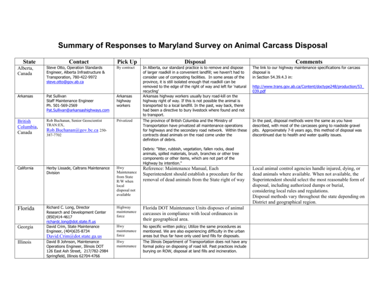 Summary of Responses to Maryland Survey on Animal Carcass Disposal State Alberta, Canada Contact Steve Otto, Operation Standards Engineer, Alberta Infrastructure & Transporation, 780-422-9972 steve.otto@gov.ab.ca Pick Up By contract Arkansas Pat Sullivan Staff Maintenance Engineer Ph. 501-569-2569 Pat.Sullivan@arkansashighways.com Arkansas highway workers British Columbia, Canada Rob Buchanan, Senior Geoscientist TRAN:EX, Rob.Buchanan@gov.bc.ca 250387-7702 Privatized Disposal In Alberta, our standard practice is to remove and dispose of larger roadkill in a convenient landfill; we haven't had to consider use of composting facilities. In some areas of the province, it is still isolated enough that roadkill can be removed to the edge of the right of way and left for 'natural recycling' Arkansas highway workers usually bury road-kill on the highway right of way. If this is not possible the animal is transported to a local landfill. In the past, way back, there had been a directive to bury livestock where found and not to transport. The province of British Columbia and the Ministry of Transportation have privatized all maintenance operations for highways and the secondary road network. Within these contracts dead animals on the road come under the definition of debris. Comments The link to our highway maintenance specifications for carcass disposal is in Section 54.39.4.3 in: http://www.trans.gov.ab.ca/Content/doctype248/production/53_ 039.pdf In the past, disposal methods were the same as you have described, with most of the carcasses going to roadside gravel pits. Approximately 7-8 years ago, this method of disposal was discontinued due to health and water quality issues. Debris: "litter, rubbish, vegetation, fallen rocks, dead animals, spilled materials, brush, branches or other tree components or other items, which are not part of the Highway by intention." California Herby Lissade, Caltrans Maintenance Division Hwy Maintenance from State R/W when local disposal not available Reference: Maintenance Manual, Each Superintendent should establish a procedure for the removal of dead animals from the State right of way Florida Richard C. Long, Director Research and Development Center (850)414-4617 richardc.long@dot.state.fl.us David Crim, State Maintenance Engineer, (404)635-8734 Highway maintenance force Florida DOT Maintenance Units disposes of animal carcasses in compliance with local ordinances in their geographical area. Hwy maintenance force No specific written policy; Utilize the same procedures as mentioned. We are also experiencing difficulty in the urban areas but thus far have only used land fills for disposals. The Illinois Department of Transportation does not have any formal policy on disposing of road kill. Past practices include burying on ROW, disposal at land fills and incineration. Georgia David.Crim@dot.state.ga.us Illinois David B Johnson, Maintenance Operations Engineer, Illinois DOT 126 East Ash Street, 217/782-2984 Springfield, Illinois 62704-4766 Hwy maintenance Local animal control agencies handle injured, dying, or dead animals where available. When not available, the Superintendent should select the most reasonable form of disposal, including authorized dumps or burial, considering local rules and regulations. Disposal methods vary throughout the state depending on District and geographical region. State Iowa Kentucky Contact JOHNSONDB@dot.il.gov William Zitterich, Assistant Maintenance Director, Iowa DOT William.Zitterich@dot.iowa.gov 515-239-1396 Mike A. Smith Roadside Environment Consultant (502) 564-4556 MikeA.Smith@ky.gov Pick Up [DOT State Highway Disposal They are buried in the Right of Way or taken to a unseen part of the Right of Way or taken to a landfill. They may also be brought to a rendering plant or an installation furnishing incineration in urban areas. Like many states, the KY. Dept of Highways is struggling with the issue of how to dispose of the tens of thousands of road kill animals we must pick up each year. 95% of our work involves deer. We currently use a variety of methods to dispose of road kill animals. When possible, we try to dispose of them on the ROW either by burial or if they are out of the view of traffic in a rural area-- we will lime them and allow natural decomposition to occur. In one district, they are taken to a municipal incinerator. We only have one district that is composting at this time and this is used to handle the overflow from weekends since landfills and municipal incinerators are closed then. Our people are using wood chips as a composting medium and the composting bin was constructed using obsolete barrier wall segments. They report no problems with odors and the process Bury the carcasses on state owned right of way or dispose of them at county landfills. First we try to ascertain the name of the owner because of liability and legal issues plus knowing who to bill for the removal. Bury on state r/w, landfill where available and compost in 1 district Louisiana Karl Finch KarlFinch@dotd.louisiana.gov State Maryland Charles Bull Office of Maintenance Hanover, MD cbull@sha.state.md.us Bob Wryk, Northwest Region Superintendent, Metro Division 651-775-0369 robert.wryk@dot.state.mn.us Hwy maintenance staff Hwy maintenance staff If the deer is in a urban area, as most of them are, we have three options: #1 load them up and take them to a couple designated Truck Stations were we compost them with wood chips and then use the compose out on the roadside in some of our landscape areas. #2 Load them up and take them to a designated landfill. We don't do this very often it is quite expensive and the haul time also adds to the cost. #3 is something that we are just experimenting with, it is called "The Dutch Composter". It looks like a silo which can hold up to 2000 pounds of material What the machine does is it heats, grinds , and mixes any road kill with wood chips and straw and in 48 to 96 hours you end up with a very fine dir