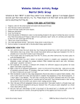 Webelos Scholar Activity Badge Mental Skills Group Scholars do their “BEST” in what they commit to do. Scholars - Believe it can happen, Expect success, Set their mind, and Try, try, try. These steps to do their best can be used at school and in everything that they do. IDEAS FOR DEN ACTIVITIES 1. 2. 3. 4. 5. 6. Prepare a chart of the school system and explain and discuss with boys. Have the boys create a word search. Stretch the boys’ minds with brain teasers. Make your own puzzle. Scout Scattergories. Invite the parents of Webelos to come to a den meeting dressed in the type of clothes they wore to school. Have them bring along such things as class pictures, yearbooks, report cards, etc. and allow each ample time to share his/ her school days with the den. 7. Take a tour of your local library. 8. Tour some specialized schools – like karate, flying school, scuba diving, etc. 9. Invite a teacher to come and talk to the den about being a good scholar. HOMEWORK HOW‐ TOS 10. Set a definite study time each school day. Your study period should have a start and an end time. If you finish before time is up, review. Take a break from school before you begin your homework. It’s O.K. to schedule one or more short breaks in your study period. 11. Find a proper place for studying away from the TV, stereo, and other distractions. You need a place to write and adequate light. 12. Be prepared before you start. Gather all materials needed to complete your assignments. (Pencils, sharpener, eraser, and paper for younger students. Older students may need a pen, ruler, dictionary, graph paper, calculator, and more.) 13. Get organized. For starters, a notebook with dividers for different subjects and pockets for loose papers could make a big difference. 14. Make a daily list of homework assignments - check it at the end of the school day - make sure you take all necessary materials home. If necessary show your teacher your assignment sheet before you leave for home to make sure you’ve got it all right. 15. Work backwards to plan for long-range assignments. Record due dates on a special blank calendar...then write in what needs to be done each day/week to complete the assignment on time. Work backwards - if a short paper is due Monday - the last step is writing the final draft. Estimate when the first draft must be completed, including time for revisions and the final draft. Next estimate when to start writing the outline for the first draft. Last, when to start reading and note-taking. 16. Start the most difficult assignment when you are most alert. Save easier tasks for off-peak times, and tackle more difficult assignments during your sharpest time. (Try using an easier assignment as a break from a more difficult one.) 17. Get your feet wet...then plunge in! Start a big project at the easiest part, or schedule just a 10 or 15 minute work session for starters. Even getting together all the supplies you’ll need is a start. Santa Clara County Council -- 1 -- 2008 Pow Wow & University of Scouting Webelos Scholar Activity Badge ACTIVITIES BRAIN TEASERS 1. I walked up the street to the top of a hill and counted 50 windows on my right. I turned around and walked back and counted 50 windows on my left. How many windows did I count? [Fifty; The windows on my right going up were the same as my left coming back] 2. Papa duck, mama duck and baby duck went for a swim. Baby duck said, “Aren’t we four having a lot of fun?” Why did baby duck say four instead of three? [Baby duck couldn’t count] 3. Take the number of toes on both feet. Multiply by the number of pints in a quart. Add the number of months in half a year. Subtract the number of thumbs on two hands. Divide by a dozen oranges. [2] 4. Two cars start from Denver to drive to Colorado Springs, a distance of 80 miles. They are the same make of car, and both are being driven at the same speed. One of the cars makes the trip in 80 minutes while it takes the other car one hour and twenty minutes. Can you explain the reason? [Eighty minutes = one hour and twenty minutes.] NAME THE STATES GAME Give each boy a piece of paper and pencil and have them write down all 50 states. The first one that has all 50 yells STOP and other boys count up how many they have. SCHOOL OF THE FUTURE You will need lots of old magazines, construction paper, scissors, glue markers and pencils. Have the boys discuss what they think school will be like 25 years from now. Will the students all be at computers? Will they interact with their teachers from a TV hook-up at home? Will they travel to Mars for mathematics and Saturn for science? Will someone have invented a “smart pill” for each subject? In the future, will we do away with some of the subjects that are taught now? Which ones? Can they imagine any new subjects that might be taught instead? Which ones? After the discussion, divide the boys into two or three project groups to make posters of their view of education in the future. INKWELL AND QUILL PEN Materials: baby food jar, cardboard circle the size of the jar top, self-drying clay, turkey feather, utility knife (for adults to use) ink The baby food jar is our inkwell. Cover the top with a circle of cardboard with a hole poked through the center for the pen point. Cover the jar on the outside with the clay and let dry. Decorate the inkwell and spray with acrylic to seal. A turkey feather will be our quill pen. Trim off the rounded tip of the feather. Split through the middle of the shaft for about half an inch, using the utility knife. Cut away one side. Sharpen the remaining part of the tip into a point. Dip pen into ink, shake off excess ink carefully, and write. Do not press down too hard or point will get dull quickly or could break. Point can be sharpened again with the utility knife. THE EDUCATIONAL SYSTEM – CAREERS IN EDUCATION Materials needed: Lots of old magazines, glue Construction paper, scissors Santa Clara County Council -- 2 -- 2008 Pow Wow & Un