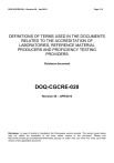 DOQ-CGCRE-020 – Revision 06 – Apr/2013- Page 1/12 DEFINITIONS OF TERMS USED IN THE DOCUMENTS RELATED TO THE ACCREDITATION OF LABORATORIES, REFERENCE MATERIAL PRODUCERS AND PROFICIENCY TESTING PROVIDERS Guidance document DOQ-CGCRE-020 Revision 06 – APR/2013 Disclaimer: In case of doubts in translation the Portuguese version prevails. The version given below may not reflect the translation of the most recent version of the document. Please visit http://www.inmetro.gov.br/credenciamento/sobre_lab.asp to make sure you have the most up-to-date version of the applicable document. DOQ-CGCRE-020 – Revision 06 – Apr/2013 Page 2/12 TABLE OF CONTENTS 1 2 3 4 5 6 7 8 Objective Application Field Responsibility Revision background and implementation deadline Reference documents Acronyms General considerations Definitions 1 OBJECTIVE This document aims to present the definitions of terms used in Cgcre documents related to the activity of accreditation of laboratories, reference material producers and proficiency testing providers. 2 APPLICATION FIELD This document applies to Dicla and to the following conformity assessment bodies, accredited or applying for accreditation: laboratories, proficiency testing providers and reference material producers. This document also applies to assessors and experts working in the accreditation processes of these conformity assessment bodies and members of the advisory Technical Committees of Cgcre. 3 RESPONSIBILITY Dicla is responsible for revising this document. 4 REVISION BACKGROUND AND IMPLEMENTATION DEADLINE 4.1 The definition of the term “subcontracting of laboratories” has been changed and the terms "working as an agent” and “outsourcing” have been deleted. These changes have been made with the purpose of eliminating mistaken interpretations about the requirements established in the standards NIE-Cgcre-009 and NIT-Dicla-031. 4.2 The definition of the term “updating the scope” has been changed, so as to clarify the cases in which the updating can be made. A clarification was made about the impossibility of updating scopes to include tests in products, properties or analytes. 4.3 Examples for the term “accreditation extension” have been included so as to clarify the cases in which it is necessary to apply for the accreditation extension. 4.4 Terms whose definitions are mentioned in other documents have been included. 4.5 Small changes have been made so as to improve the definitions of a few terms. 4.6 The definitions from VIM have been updated. 4.7 The most significant changes are marked in yellow. 4.8 This document comes into force on its publication date. DOQ-CGCRE-020 – Revision 06 – Apr/2013 Page 3/12 5 REFERENCE DOCUMENTS Standardization and related activities – general vocabulary. General requirements for the competence of testing and calibration laboratories ISO/IEC 17000:2005 Conformity assessment – Vocabulary and general principles ISO/IEC 17011:2005 Conformity assessment - General requirements for accreditation bodies accrediting conformity assessment bodies ISO/IEC 17043:2011 Conformity assessment -- General requirements for proficiency testing ISO 15189 Medical laboratories - Particular requirements for quality and competence ILAC P14:11/2010 Policy for Uncertainty in Calibration. ISO Guide 34:2009 General requirements for the competence of reference material producers. VIM: 2012 International vocabulary of metrology - Basic and general concepts and associated terms (VIM 2012). rd Conmetro Resolution 3, of July 23 , 2002 Approves the terms of reference – Revision of concepts and new guidelines for the organization of metrology activities in the country. ABNT ISO/IEC Guide 2:2006 ISO/IEC 17025:2005 6 ACRONYMS Cgcre Dicla Inmetro CAB General Coordination for Accreditation Laboratory Accreditation Division Brazilian National Institute of Metrology, Quality and Technology Conformity Assessment Body 7 GENERAL CONSIDERATIONS The definitions that do not refer to the Reference Documents mentioned in item 5 of the summary of this Guidance Document have been established by Cgcre. This document has definitions of terms widely used in many documents of Cgcre. The terms used only in a specific document of Cgcre are mentioned in this document making reference to the document which mentions its definition. 8 DEFINITIONS 8.1 Warning Action to notify the CAB about the non compliance with the standard requirements of the accreditation. Note: The character of the warning is eminently educative, not configuring a sanction. 8.2 Dicla´s clerical staff Dicla’s professional responsible for reviewing the application, selecting assessment teams, requesting costs billing and other clerical activities. Note: The financial and contractual matters are managed and operated by the Accreditation Support Section Secre/Cgcre. DOQ-CGCRE-020 – Revision 06 – Apr/2013 Page 4/12 8.3 Fortified Sample, Spike Matrix See NIT-Dicla-057. 8.4 Sampling (ISO/IEC 17025) Defined procedure whereby a part of a substance, material or product is taken to provide for testing or calibration of a representative sample of the whole. Sampling may also be required by the appropriate specification for which the substance, material or product is to be tested or calibrated. In certain cases (e.g. forensic analysis), the sample may not be representative but is determined by availability. Note: See also NIT-Dicla-057. 8.5 Appeal (ISO/IEC 17011) Request by a CAB for reconsideration of any adverse decision made by the accreditation body related to the desired accreditation status. Note: Adverse decisions include the refusal to accept an accreditation application, the interruption of the assessment process, the request of corrective actions, the changes in the accredited scope, the decisions to refuse, suspend or cancel the accreditation and any other action that prevents obtaining the accreditation. 8.6 Activity Areas: Area including the economic activities in which testing 