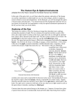 The Human Eye & Optical Instruments (adapted from the Pasco manual for the Model Human Eye 8/2008) In this part of the optics lab, you will learn about the anatomy and optics of the human eye and do experiments to understand how our eyes form images, and how eyeglasses correct refractive errors and astigmatism. In the final part, you will investigate the optics of microscopes and telescopes. You should read all of the background material, but you can choose to do only the eye experiments or only the optical instrument experiments in lab (if you have time you can do both.) Anatomy of the Eye The human eye achieves vision by forming an image that stimulates nerve endings, creating the sensation of sight. The eye consists of an aperture and lens system at the front, and a light-sensitive surface at the back. Light enters the eye through the aperturelens system, and is focused on the back wall. The lens system consists of two lenses: the corneal lens on the front surface of the eye, and the crystalline lens inside the eye. The space between the lenses is filled with a transparent fluid called the aqueous humor. Also between the lenses is the iris, an opaque, colored membrane. At the center of the iris is the pupil, a muscle-controlled, variable-diameter hole, or aperture, which controls the amount of light that enters the eye. The interior of the eye behind the crystalline lens is filled with a colorless, transparent material called the vitreous humor. On the back wall of the eye is the retina, a membrane containing lightsensitive nerve cells known as rods and cones. Rods are very sensitive to low light levels, but provide us only with low-resolution blackand-white vision. Cones allow us to see in color at higher resolution, but they require higher light levels. The fovea, a small area near the center of the retina, contains only cones and is responsible for the most acute vision. Surrounding the fovea is the sensitive region called the macula, which is responsible for central vision. Signals from the rods and cones are carried by nerve fibers to the optic nerve, which leads to the brain. The optic nerve connects to the back of the eye; there are no light-sensitive cells at the point where it attaches, resulting in a blind spot. Cameras share the same optical design as the human eye. Cameras of course have glass or quartz lenses that move mechanically back and forth rather than being fixed in place 2 Physics 211 Optical Instruments like the crystalline lens and cornea, and they sense light with electronic sensors or film rather than a retina, but the optical design issues you learn here will apply to cameras. The Model Eye Apparatus The PASCO Human Eye Model consists of a sealed plastic tank shaped roughly like a horizontal cross section of an eyeball. A permanently mounted, plano-convex, glass lens on the front of the eye model acts as the cornea. The tank is filled with water, which models the aqueous and vitreous humors. The crystalline lens of the eye is modeled by a changeable lens behind the cornea. A movable screen at the back of the model represents the retina. An optics caliper is provided for measuring images on the retina screen. The lenses of the eye model are equipped with handles, which allow them to be easily inserted into the water. The handles of the plastic lenses are marked with their focal lengths in air. Two of the lenses are cylindrical lenses for causing and correcting astigmatism in the model; these can be identified by notches on their edges that mark the cylindrical axes. WARNING: DO NOT wipe or rub the lenses with a cloth or tissues to dry or clean them. They are plastic and easily scratched. We will provide blow-off guns you can use to dry them off. The crystalline lens, which is supported in the slot labeled SEPTUM, can be replaced with different lenses to accommodate, or focus, the eye model at different distances. (The label refers to the septum, or partition, formed by the lens and other tissues, that separates the aqueous and vitreous humors.) Two other slots behind the 3 Physics 211 Optical Instruments cornea, labeled A and B, can hold additional lenses to simulate changing the power of the crystalline lens. A cylindrical lens can be placed in slot A or B to give the eye astigmatism. The pupil aperture can also be placed into slot A or B to demonstrate the effect of a round or “cat-shaped” pupil. Two slots in front of the cornea, labeled 1 and 2, can hold simulated eyeglasses lenses to correct for near-sightedness, far-sightedness, and astigmatism. A circle marked on the retina screen represents the fovea, and a hole in the screen represents the blind spot. The retina screen can be placed in three different positions (labeled NORMAL, NEAR, and FAR) to simulate a normal, near-sighted, or farsighted eye. Optics of the Eye The corneal lens and crystalline lens together act like a single, convergent lens. Light entering the eye from an object passes through this lens system and forms an inverted, real image on the retina. The eye focuses on objects at varying distances by accommodation, or the use of muscles to change the curvature, and thus the focal length, of the crystalline lens. In its most relaxed state, the crystalline lens has a long focal length, and the eye can focus the image of a distant object on the retina. The farthest distance at which the eye can accommodate is called the far point for distinct vision. For a normal eye, the far point is infinity. When muscles in the eye contract and squeeze the lens, the center of the lens bulges, causing the focal length to shorten, and allowing the eye to focus on closer objects. The nearest distance at which they eye can accommodate is called the near point for distinct vision. The near point of a normal eye is about 25 cm. Experiment 1: Image formation 1. Put the retina screen in the NORMAL slot and the +120 mm lens in the SEPTUM slot. 2. Fill the model with water. This simulates the effect of the aqueou
