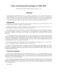 Fixed- and floating-point packages for VHDL 2005 David Bishop, Eastman Kodak Company, Rochester, NY Abstract The pending update to VHDL LRM contains several new packages and functions. The new packages include support for both fixed-point and floating-point binary math. These fully synthesizable packages will raise the level of abstraction in VHDL. DSP applications, which previously needed an independent processor core, or required very difficult manual translation, can now be performed within your VHDL source code. In addition, Schematic-based DSP algorithms can now be translated directly to VHDL. This paper will describe these packages and give examples of their use. Introduction: For the past 15 years we have been using HDL to increase the level of abstraction in our ASIC and FPGA designs. HDL was a major leap from schematics. What have we done sense? Little. Attempts have been made. E, System-C and System-Verilog are good examples. These are great ideas, but they do not give the designer the control and tool maturity that VHDL and Verilog provide. Why not simply increase the level of abstraction in a language that is already well known? The potential of VHDL has not yet been fully tapped. Designed from the ground up as a software language it is easily extendable and flexible. Constructed at a higher level then Verilog, it has the ability to provide higher levels of abstraction directly, with already mature tools. Typically designers use integer math in their RTL code. For fixed point they tend to just “remember” where the decimal point is. For floating point you use a DSP, which may even be off chip. Designers tend to use math solutions in order of “integer math”, “fixed point math” and “floating point math”, where 80% of designs are done in integer, of the next 20% 80 % of those are done in fixed point. Note that the complexity of fixed point math is not that much higher than integer math, but that floating point is about 3x as complex as integer math. The integer math problem has been effectively solved with the NUMERIC_STD packages (1076.3, now part of VHDL200X-FT). This package has been well adopted and been in use for many years. In this paper, I intend to describe a new set of packages, which are being added to the VHDL language in the VHDL2005 update. These packages include VHDL overloads that allow you to do fixed and floating point math directly, without the user having to perform any conversions. These packages raise the level of abstraction in VHDL AND give the user the flexibility and power of an HDL. Fixed-point package: Fixed-point math is basically integer math with numbers that can be less than 1.0. A fixed-point number has an assigned width and an assigned location for the decimal point. As long as the number is big enough to provide enough precision then fixed point is fine for most DSP applications. Since it is based on integer math it is extremely efficient as long as the long as the data does not very too much in magnitude. The fixed-point math packages are based on the VHDL 1076.3 numeric_std package and use the signed and unsigned arithmetic from within that package. This makes them highly efficient as the numeric_std package is well supported by simulation and synthesis tools. This package defines two new types “ufixed” which is unsigned fixed point, and “sfixed” which is signed fixed point. Usage model: use ieee.fixed_pkg.all; .... signal a, b : sfixed (7 downto -6); signal c: sfixed (8 downto -6); begin .... a <= to_sfixed (-3.125, 7, -6); b <= to_sfixed (inp1, b’high, b’low); c <= a + b; The two data types are defined as follows: type ufixed is array (integer range <>) of std_logic; -- base Unsigned fixed point type, downto direction assumed type sfixed is array (integer range <>) of std_logic; -- base Signed fixed point type, downto direction assumed This data type uses a negative index to show you where the decimal point is. The decimal point is assumed to be between the "0" and "-1" index. Thus is we can assume "signal y : ufixed (4 downto -5)" as the data type (unsigned fixed point, 10 bits wide, 5 bits of decimal), then y = 6.5 = "00110.10000", or simply: y <= "01011010000"; You can also say: y <= to_ufixed (6.5, 4, -5); where "4" is the upper index, and "-5" is the lower index, so you could also say: y <= to_ufixed (6.5, y'high, y'low); The signed version uses a two compliment to show represent a negative number, just like the "numeric_std" package. Any non-zero index range is valid. Thus: signal z : ufixed (-2 downto -3); z <= "11"; -- 0.375 = 0.011 signal x : sfixed (4 downto 1); y <= "111"; -- -2 = 1110.0 The data widths in the fixed-point package were designed (by Ryan Hilton) so that there is no possibility of an overflow. This is a departure from the “numeric_std” model which simply throws away underflow and overflow bits. For unsigned fixed point: ufixed(a downto b) + ufixed(c downto d) = ufixed(max(a,c)+1 downto min(b,d)) ufixed(a downto b) - ufixed(c downto d) = ufixed(max(a,c)+1 downto min(b,d)) ufixed(a downto b) * ufixed(c downto d) = ufixed(a+c+1 downto b+d) ufixed(a downto b) / ufixed(c downto d) = ufixed(a-d+1 downto b-c-1) reciprocal (ufixed(a downto b)) = ufixed(a-b+1 downto b-a-1) ufixed(a downto b) rem ufixed(c downto d) = ufixed(c downto d) ufixed(a downto b) mod ufixed(c downto d) = ufixed(a downto b) For signed fixed point: sfixed(a downto b) + sfixed(c downto d) = sfixed(max(a,c)+1 downto min(b,d)) sfixed(a downto b) - sfixed(c downto d) = sfixed(max(a,c)+1 downto min(b,d)) sfixed(a downto b) * sfixed(c downto d) = sfixed(a+c downto b+d) sfixed(a downto b) / sfixed(c downto d) = sfixed(a-d downto b-c) reciprocal (sfixed(a downto b)) = sfixed(a-b downto b-a) ufixed(a downto b) rem ufixed(c downto d) = ufixed(c downto d) ufixed(a downto b) mod ufixed(c downto d) = ufixed(a downto b) Unsigned Example: signal x : ufixed ( 7 downto –3); signal y : ufixed ( 2 downto –9); If we multiply x by y we wou