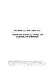 IND APPLICATION TEMPLATE: CHEMISTRY, MANUFACTURING AND CONTROL INFORMATION1 1Adapted from Guidance for Industry: Content and Format of Investigational New Drug Applications (INDs) for Phase 1 Studies of Drugs, Including Well-Characterized, Therapeutic , Biotechnology-Derived Products; Center for Drug Evaluation and Research (CDER) and Center for Biologics Evaluation and Research, U.S. Food and Drug Administration; November, 1995. 1 D. Chemistry, Manufacturing and Control Information 1. Introduction: 1.1 Potential human risk(s) Indicate if 1) the chemistry of either the investigational drug substance (i.e., the active ingredient) or the investigational drug product, or 2) the manufacturing process for either the investigational drug substance or investigational drug product, presents any signals of potential human risk. If so, discuss the signals of potential risks; to include a description of the steps proposed to monitor for such risk(s), or the reason(s) why the signals should be dismissed. 1.2 Chemistry and manufacturing: Pre-clinical versus clinical studies Describe any chemistry or manufacturing differences between the investigational drug product proposed for clinical research study use versus the investigational drug product that was used in the pre-clinical (i.e, animal) toxicology studies that formed the basis that it was safe to proceed with the clinical research study. If there are no differences in the investigational drug product, this should be specifically stated. If there are differences in the investigational drug product, discuss how these differences may affect the safety profile of the investigational drug product. 2. Investigational Drug Substance: 2.1 Description of investigational drug substance Provide a description of the investigational drug substance (i.e., the active drug substance); including its physical, chemical (e.g., chemical name and/or structure), or biological characteristics. 2.2 Manufacturer of the investigational drug substance Provide the name and full address of the manufacturer of the investigational drug substance. 2 Specify if the manufacture of the investigational drug substance was or was not (will or will not be) performed in full compliance with the FDA’s current Good Manufacturing Practice (cGMP) standards at 21 CFR Part 211. If so, include with the manufacturer’s address, its FDA Drug Establishment Registration Number. 2.3 Method of preparation of the investigational drug substance For an investigational drug substance manufactured in full compliance with the FDA’s current Good Manufacturing Practice (cGMP) standards: Provide a detailed flow diagram of the process for manufacture of the investigational drug substance; and incorporate a list of the components (i.e., reagents, solvents, excipients, catalysts, etc.) used in the manufacturing process. (Note: Step-by-step procedures for, and a listing of the specifications and quantities of the components used in, the manufacture of the investigational drug substance are ordinarily not required to be included in the IND application for the initial stage of drug development; as it is assumed that the manufacturer will establish such procedures and specifications consistent with cGMP compliance.) Alternately, if the cGMP manufacturer of the investigational drug substance has submitted, or will submit, a respective Drug Master File to the FDA (or if the manufacturer has in place a FDA-accepted IND for the investigational drug substance/product), incorporate (i.e., into a referenced appendix of the IND application) a letter or written notification from the manufacturer authorizing the FDA to access its Drug Master File (or IND) in support of the chemistry, manufacturing and control information required to be submitted under this IND application. If the investigational drug product is approved by the FDA for commercial marketing, specify such and incorporate (i.e., into a referenced appendix of the IND application) the corresponding FDAapproved product labeling (i.e., product insert). For an investigational drug substance not manufactured in full compliance with the FDA’s current Good Manufacturing Practice (cGMP) standards: Provide a flow diagram of the process for manufacture of the investigational drug substance. 3 Incorporate Drug Master Card(s) listing the components (i.e., reagents, solvents, excipients, catalysts, etc.) used currently in the manufacture of the investigational drug substance; to include, for each listed agent, its manufacturer or source, product specifications, and quantity used in the manufacture. (See Example Drug Master Card.1) (Note: the Drug Master Card(s) may provide for alternative manufacturers of inactive components used in the manufacture of the investigational drug substance.) (Note: for novel components [i.e., non-commercially available components manufactured specifically for use in the preparation of the investigational drug substance] additional manufacturing information may need to be provided.(See Example Drug Master Card.2) Incorporate Drug Master Card(s) listing the step-by-step procedures used currently for the manufacture of the investigational drug substance. (See Example Drug Master Card.1) 2.4 Acceptable limits and analytical methods use to assure the identity, strength, quality and purity of the investigational drug substance For an investigational drug substance manufactured in full compliance with the FDA’s current Good Manufacturing Practice (cGMP) standards: Specify the acceptable limits of identity, strength, quality and purity that will form the basis for the release/acceptance of the investigational drug substance for its use in the preparation of the investigational drug product. Provide a brief description of the various test (i.e., analytical) methods that are (will be) used to establish that the investigational drug substance meets the defined, acceptable limits of identity, strength, quality and purity. (Note: Validation procedu