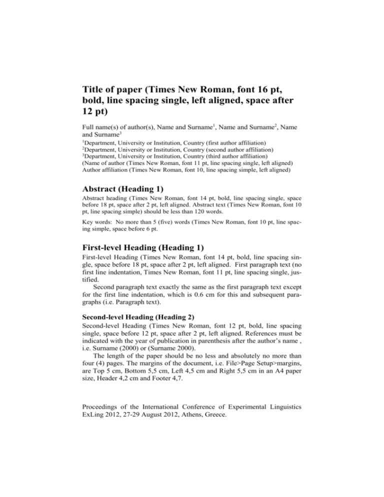 Title of paper (Times New Roman, font 16 pt, bold, line spacing single, left aligned, space after 12 pt) Full name(s) of author(s), Name and Surname1, Name and Surname2, Name and Surname3 1 Department, University or Institution, Country (first author affiliation) Department, University or Institution, Country (second author affiliation) 3 Department, University or Institution, Country (third author affiliation) (Name of author (Times New Roman, font 11 pt, line spacing single, left aligned) Author affiliation (Times New Roman, font 10, line spacing simple, left aligned) 2 Abstract (Heading 1) Abstract heading (Times New Roman, font 14 pt, bold, line spacing single, space before 18 pt, space after 2 pt, left aligned. Abstract text (Times New Roman, font 10 pt, line spacing simple) should be less than 120 words. Key words: No more than 5 (five) words (Times New Roman, font 10 pt, line spacing simple, space before 6 pt. First-level Heading (Heading 1) First-level Heading (Times New Roman, font 14 pt, bold, line spacing single, space before 18 pt, space after 2 pt, left aligned. First paragraph text (no first line indentation, Times New Roman, font 11 pt, line spacing single, justified. Second paragraph text exactly the same as the first paragraph text except for the first line indentation, which is 0.6 cm for this and subsequent paragraphs (i.e. Paragraph text). Second-level Heading (Heading 2) Second-level Heading (Times New Roman, font 12 pt, bold, line spacing single, space before 12 pt, space after 2 pt, left aligned. References must be indicated with the year of publication in parenthesis after the author’s name , i.e. Surname (2000) or (Surname 2000). The length of the paper should be no less and absolutely no more than four (4) pages. The margins of the document, i.e. File>Page Setup>margins, are Top 5 cm, Bottom 5,5 cm, Left 4,5 cm and Right 5,5 cm in an A4 paper size, Header 4,2 cm and Footer 4,7. Proceedings of the International Conference of Experimental Linguistics ExLing 2012, 27-29 August 2012, Athens, Greece. 2 Initial name(s) and full surname(s) For phonetic symbols the IPA fonts should be used and for other symbols the inventory of the standard MS Word ones is to be used (please mark with red colour all IPA special symbols). The present template should work properly in late MS Word for Windows versions. In practice, and the simplest way to use it, is the substitution of own text over this text. The name(s) initial(l) and surname(s) of author(s) in even page header and the title of paper in odd page header of the document. More than two names should be “ Name initial Surname et al.”. In case of longer title of paper, an odd page header running title of no more than a line should be used. Third-level Heading (Heading 3) Third-level Heading (Times New Roman, font 11 pt, bold, line spacing single, space before 6 pt, space after 2 pt, left aligned. Figures and Tables should be numbered in Arabic numerals and should be contained within the margins of this document. One empty line should be left before Figures and after Figure captions as well as before Table captions and Tables. Figure 1. This is the Figure caption. Text and numbers within Figures may be at a reasonable size, fairly close to font 11pt Times New Roman. Figure caption should be under the Figure and Table caption over the Table, both in First paragraph text. Table 1. This is the Table caption. Any text and numbers within Tables may be at a reasonable size, fairly close to 11pt Times New Roman. Vowels Duration F1 F2 i 60 350 2400 a 90 650 1200 u 70 350 1000 Title of paper 3 Bottom and Top borders of the Table may be in 1.1/2 pt whereas borders inside the Table may be in 1/2pt. Notes (Heading 1) 1. Notes Heading (Heading 1). Notes text (Times New Roman), font 10 pt, line spacing single, justified, 0,5 cm hanging indentation. 2. Notes, only if absolutely necessary, should be inserted manually. Acknowledgements (Heading 1) Papers are due by July 15, 2012, in both PDF and MS Word format, at the Workshop Secretariat (exling@phil.uoa.gr). Papers should be in accordance to the present guidelines, no more than four (4) pages; also, papers by not native speakers of English should be accordingly revised. References (Heading 1) References Heading in Heading 1. References text (Times New Roman, font 10 pt, line spacing single, justified, hanging 0.6 cm. References in an alphabetical list, then in chronological order for each author (fictional names are used in the examples below). Asurname, A. 2000. Linguistic Themes. Place, Publisher. Bsurname, B. 2002. Linguistic investigations. In Dsurname, A. and Esurname, B. (eds.) 2002, Linguistic Technologies, 100-120. Place, Publisher. Fsurname, A. and Gsurname, B. (eds.) 2003. Linguistic Structures. Place, Publisher. Msurname, Ch. 2004. The significance of experimental methodologies in the development of linguistic theory. Journal Name 40, 80-100. Nsurname, C. 2005. Concrete vs. abstract levels in speech production and perception. In Osurname, E. (ed.), Proc. of the 10th Intern. Congress of Interdisciplinary Linguistics, vol. 1, 100-103, Place, Country. Psurname, E. 2006. Semantics: the relation of sound to meaning. Working Papers 40, 80-100, Department of Experimental Linguistics, University Name. Registration At least one author per paper should be registered by 1 July 2012.