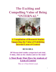 The Exciting and Compelling Value of Being "INTERNAL" A Compilation of Research Studies Supporting the Value of Exhibiting Internal Locus of Control RUSS HILL 387 Researched studies categorized and cited. E-links, click on the citation and see the study! A Must Read, Must Have for students of Locus of Control This is A Free Down Load. 1 The Exciting and Compelling Value of Being "INTERNAL" A Compilation of Research Studies Supporting the Value of exhibiting Internal Locus of Control RUSS HILL 2 The Exciting and Compelling Value of Being "INTERNAL". A Compilation of Research Studies Supporting the Value of exhibiting Internal Locus of Control Copyright O 2011 by Russ Hill ISBN 978-0-9833464-3-2 WILL TO POWER PRESS, Beach Have New Jersey All rights reserved. No part of this book may be reproduced (except for inclusion in reviews), disseminated or utilized in any form or by any means, electronic or mechanical, including photocopying, recording, or in any information storage and retrieval system, or on the Internet (World Wide Web) without written permission from the author or publisher. For more information please visit:www.teachinternalcontrol.com Psychology/Achievement/Academics/Internal 3 ACKNOWLEDGEMENTS I wish to gratefully acknowledge the research assistance of Marian Chapman and Rita Halpert. 4 WHY? Why should I or . . or why should you, want to be an "INTERNAL"? An internal is one who believes that that they can influence the course of their life as contrasted with those who are "externals". Externals believe that their life is controlled by other forces and other people. Why should you want to be an internal? Because internality is power. It is freedom. It is excitement! It leads to academic success, to self improvement, to better health, to worldly success, to significant accomplishment, to happiness, and more. In popular terms, we want to be self-directed rather than directed by others. We want to take responsibility for our actions rather than to attribute the reason for our behavior to others. We want to be empowered, rather than feel like victims and believe that the power belongs to others. We want to be thoughtful purposeful agents who act effectively and are successful out in the world. Psychological Research Quite a number of psychological studies report correlations between internal locus of control and desirable personal qualities. Again, note that I say “correlates,” which means that these behaviors are often found together with internality—that individual Internals may or may not display these desirable behaviors, but very likely will. So, when we say that internality correlates with the more frequent use of logical thinking, we mean that if you are an Internals you will probably think more logically than do most Externals. The desirable behaviors we’ll be discussing below are the result of a search through the psychological literature. Each statement is supported by at least one data-based research study, and, in some cases by extensive reviews of the research literature. In most cases, these studies are published in journals where a board of psychologists 5 (called “juried journals”) reviewed the quality of the reported research. Examples from these studies highlight some of the more impressive findings of this body of research. Further, citations to each study are listed immediately after the statement. The reference is in the form of an e-link. If you are on the internet and you depress CTRL and click on the e-link you will be taken directly to the study or its abstract. In this way you will be able to easily read the study yourself and make your own evaluation. For example, researchers in one study administered a test to measure the self-reported happiness of 171 university students and then administered a questionnaire to determine the students’ level of internality. Pannells & Claxton 2008) (Note the hyperlink. Depress CTRL and click on the link. See the abstract and how to access the original document.) When the scores of the students were correlated, the results showed conclusively that those who scored highly on the happiness scale also scored higher on the internality scale (see the section on “happiness,” below). This research is indeed impressive, but more impressive is the fact that seven other entirely separate data-based studies have found the same result, serving to statistically and psychologically support our thesis that Internals are simply happier than Externals. The number and quality of these studies significantly increase our confidence in the judgment that Internals are happier. Similarly, if you value school achievement, you will want to be an Internal. A large number of studies (some of them reviews of research studies) confirm that Internals do indeed do better in school, and the sheer volume of this work, which consistently presents data that Internals have more academic success, is both significant and convincing. Findley & Cooper 1983. Many of these studies are not simple, but well worth our attention. Consider the following study in which the investigator analyzed educational attainment, labor market experience, and collective bargaining affiliation and determined that Internals clearly earn higher hourly wages than do Externals. (Frantz 1980), In fact, Internals are found to earn more money for the same amount of time they work and earn more across a wide variety of employment situations. This is a stunning finding, one that 6 suggests what we all could suspect: that if you are an Internals you are a more desirable employee. Armed with this information, we can appreciate that the list of desirable behaviors that correlate with the quality of being an Internal would be extensive—and it is. IF YOU ARE AN INTERNAL YOU WILL PREDICTABLY: 1. Experience greater personal well-being 2. Display more motivation to innovate, complete tasks, and perform well 3. Exhibit superior cognitive functioning 4. Be more successful in learn