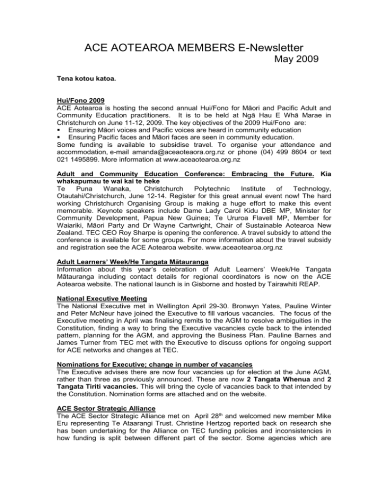 ACE AOTEAROA MEMBERS E-Newsletter May 2009 Tena kotou katoa. Hui/Fono 2009 ACE Aotearoa is hosting the second annual Hui/Fono for Māori and Pacific Adult and Community Education practitioners. It is to be held at Ngā Hau E Whā Marae in Christchurch on June 11-12, 2009. The key objectives of the 2009 Hui/Fono are: Ensuring Māori voices and Pacific voices are heard in community education Ensuring Pacific faces and Māori faces are seen in community education. Some funding is available to subsidise travel. To organise your attendance and accommodation, e-mail amanda@aceaoteaora.org.nz or phone (04) 499 8604 or text 021 1495899. More information at www.aceaotearoa.org.nz Adult and Community Education Conference: Embracing the Future. Kia whakapumau te wai kai te heke Te Puna Wanaka, Christchurch Polytechnic Institute of Technology, Otautahi/Christchurch, June 12-14. Register for this great annual event now! The hard working Christchurch Organising Group is making a huge effort to make this event memorable. Keynote speakers include Dame Lady Carol Kidu DBE MP, Minister for Community Development, Papua New Guinea; Te Ururoa Flavell MP, Member for Waiariki, Māori Party and Dr Wayne Cartwright, Chair of Sustainable Aotearoa New Zealand. TEC CEO Roy Sharpe is opening the conference. A travel subsidy to attend the conference is available for some groups. For more information about the travel subsidy and registration see the ACE Aotearoa website. www.aceaotearoa.org.nz Adult Learners’ Week/He Tangata Mātauranga Information about this year’s celebration of Adult Learners’ Week/He Tangata Mātauranga including contact details for regional coordinators is now on the ACE Aotearoa website. The national launch is in Gisborne and hosted by Tairawhiti REAP. National Executive Meeting The National Executive met in Wellington April 29-30. Bronwyn Yates, Pauline Winter and Peter McNeur have joined the Executive to fill various vacancies. The focus of the Executive meeting in April was finalising remits to the AGM to resolve ambiguities in the Constitution, finding a way to bring the Executive vacancies cycle back to the intended pattern, planning for the AGM, and approving the Business Plan. Pauline Barnes and James Turner from TEC met with the Executive to discuss options for ongoing support for ACE networks and changes at TEC. Nominations for Executive; change in number of vacancies The Executive advises there are now four vacancies up for election at the June AGM, rather than three as previously announced. These are now 2 Tangata Whenua and 2 Tangata Tiriti vacancies. This will bring the cycle of vacancies back to that intended by the Constitution. Nomination forms are attached and on the website. ACE Sector Strategic Alliance The ACE Sector Strategic Alliance met on April 28th and welcomed new member Mike Eru representing Te Ataarangi Trust. Christine Hertzog reported back on research she has been undertaking for the Alliance on TEC funding policies and inconsistencies in how funding is split between different part of the sector. Some agencies which are receiving their core funding from other Votes get access to the TEC ACE pool, while others, which have ACE as their core business, are not being funded, or receive very little funding. She pointed to very different definitions of ‘the ACE sector’ (TEC, PricewaterhouseCoopers etc). Alliance members noted the lack of a TEC policy direction for ACE and the need for the Alliance to help inform the TEC. There was discussion on the need for the Alliance to be united and work towards the most desirable funding model.James Turner briefed the Alliance on key changes at TEC. These include: Two teams of performance analysts will look at the performance of organisations that TEC fund. There will be a need to demonstrate performance and value for money. There will be a less prescriptive approach from the TEC; There may be an open market for EFTS. There is likely to be more aggregation of funds (eg combine the foundation learning and training opportunities pools) and fewer rules, perhaps with an emphasis on literacy and numeracy - combined with a student earning achievement factor. The concept of the investment plan won’t change, but there will be less discussion about what goes into the plan, and if the outcomes are not achieved, there will be consequences. The TEC will make sure that all key messages will go out to sector in a way that is clear, timely, and shows the rationale for restructuring rationale for restructuring. The Service Centre will be the place to contact for information. Launch of English Language Partners New Zealand English Language Partners New Zealand (formerly ESOL Home Tutors) new name was launched on May 15 at the annual conference in Auckland. The new name reflects the diverse range of programmes and services now offered by the organisation. Virtual Learning Planning Day Virtual learning enthusiasts are invited to participate in a planning day on 15th July 2009 at ACE House 192 Tinakori Rd, Thorndon, Wellington, 10am-3pm. The objectives are: to plan two Adult Community Education Courses to be offered nationally on the Virtual Learning Network in Term 1 and Term 2, 2010. A host school will be identified for each course. To plan for one Adult Community Education Professional Development opportunity to be offered nationally on the Virtual Learning Network in the first half of 2010. A ‘host’ body will be identified to facilitate this. Six to ten people would be an ideal working group. RSVP to Colin Wharton (cwharton@newlands.school.nz) for catering purposes before Friday 26th June. Professional Development Grants Second round of PD Grants closed 20 March. There were 51 applications from a very wider range of organisations involved in some form of adult community education. Applicants ranged from large national or regional organisations such as Youthline NZ to and REAP’s through to ACE Networks and social service organisation