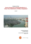 Background Paper Factors Pertaining to Building Resilience in Urban Slum Settlements of Dhaka, Bangladesh July 2012 Dr Esther Charlesworth Dr Iftekhar Ahmed Architects Without Frontiers (AWF) Melbourne, VIC Executive Summary This paper has been written to provide the background for an AusAID-funded project Building Resilience of Urban Slum Settlements: A Multi-Sectoral Approach to Capacity Building being implemented by Habitat for Humanity Australia in Dhaka, Bangladesh. Dhaka, Bangladesh’s capital, is a rapidly urbanising megacity in one of the world’s most densely populated and poorest countries. Almost 30% of its more than 14 million population lives in slum settlements. Slum settlements are characterised by tenure insecurity and evictions, and controlled by mastaans – ganglords who charge exorbitant rents and charges for basic services. Such a situation deters investments for improving living conditions by slum residents and agencies. Poor quality and densely built housing is typical in Dhaka’s slum settlements and basic public infrastructure for water, energy, sanitation and hygiene are non-existent or very limited. A combination of human and natural factors results in various urban hazards with serious impacts on the urban poor. Here some of the key urban hazards in Dhaka are discussed. Flooding and water-logging, due to poor drainage, are widespread; windstorms cause havoc in slum settlements because of the weak construction of houses; unplanned urbanisation and substandard building practices pose great risk in the event of a major earthquake; urban fires are common and are often believed to be ignited intentionally; Bangladesh is one of the countries most threatened by climate change and impacts such as erratic weather, increased flooding and temperature rise are already evident. Bangladesh has a large number of development agencies, but most do not engage extensively in urban areas. Here some of the key initiatives are discussed. The Urban Partnerships for Poverty Reduction (UPPR) program is unique and is a very large program in urban slum settlements targeted for 3 million people in 30 cities including Dhaka; WaterAid Bangladesh addresses water, sanitation and hygiene (WaSH) in urban slum settlements with a range of partners; the Coalition for the Urban Poor (CUP) is a network of more than 40 NGOs and advocates for the rights of slumdwellers, and supports community-based organisations in slum settlements. The challenges of building resilience in urban slums are many, but there are also opportunities. Particularly recent government policies on urban development and climate change, as well as emerging interest among agencies to address urban issues, offer potential for advocacy for building resilience in urban slum settlements,. 1 1. Introduction This paper has been written to provide the background for the project Building Resilience of Urban Slum Settlements: A Multi-Sectoral Approach to Capacity Building being implemented by Habitat for Humanity Australia (HFHA) in partnership with Habitat for Humanity International Bangladesh (HFHIB). Technical partners include Arup and Architects Without Frontiers (AWF) and the project is funded by AusAID under its NGO Cooperation Program Innovation Fund. The project is interested in building resilience of urban slum communities in Dhaka, Bangladesh with a specific focus on the built environment and will target communities in Mirpur in northwestern Dhaka. 2. Urbanisation in Dhaka and Implications for the Poor Dhaka is the capital city of Bangladesh, which is the 7th most populous country in the world with a population of more than 150 million people inhabiting an area of 147,570 square kilometres (BBS 2011; UNFPA 2011), that is, an average population density of more than 1,000 persons per square kilometre – among the highest in the world. It is also one of the world’s poorest nations with nearly one-third of its population living in extreme poverty (BBS 2010; UNDP 2011; UNFPA 2011) and almost half the population below the national poverty line, the highest among all the South Asian countries (Mahbub ul Haq Human Development Centre 2011). While still predominantly rural with 28% of its population living in urban areas, Bangladesh is urbanising rapidly and is expected to have more than 50% urban population by 2050 (UN 2012). Fig. 1: Dhaka is one of the fastest growing megacities of the world. The great bulk of the urban population is concentrated in Dhaka, comprising more than one-third the urban population of the whole country (World Bank 2012). Dhaka is among the fastest growing megacities in the world with a population of nearly 14 million (World Bank 2012) and projected to become the sixth largest megacity in the Asia-Pacific region by 2020 with a population approaching 20 million (UN-Habitat 2010) (see Figs. 1 and 2). It is estimated that density exceeds 18,000 persons per square kilometre within Dhaka’s municipal boundary (SDNP 2005), among the highest in the world. 300,000400,000 mostly poor rural migrants arrive in cities annually (WSUP 2007) due to various ‘push’ factors including frequent natural disasters, increasing pressure on land, rural unemployment and underem- 2 ployment and rural-urban income disparity, as well as ‘pull’ factors such as employment opportunities and better living standards in the city (UN-Habitat 2008; World Bank 2007). The bulk of urban growth, however, is from natural increase of the already large existing population and conversion of agricultural land and wetlands in rural areas on the fringes (Shafi and Payne 2007; UN-Habitat 2009). Fig. 2: Urbanisation and population growth in Dhaka (source: Stimson Center 2009). In absolute terms the average income in Dhaka is higher than the rest of the country, a reason that attracts migrants, but the cost of living is also higher. Inequality is higher in Dhaka than anywhere else in the country, and well over 90% of Dhaka’s urban poor lack secur