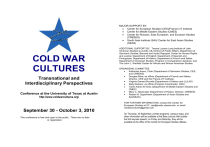 MAJOR SUPPORT BY: Center for European Studies (CES)/France-UT Institute Center for Middle Eastern Studies (CMES) Center for Russian, East European, and Eurasian Studies (CREEES) South Asia Institute (SAI)/ Center for East Asian Studies (SEAS) COLD WAR CULTURES Transnational and Interdisciplinary Perspectives Conference at the University of Texas at Austin http://www.coldwarcultures.org/ September 30 - October 3, 2010 This conference is free and open to the public. There are no fees or registration. ADDITIONAL SUPPORT BY: Teresa Lozano Long Institute of Latin American Studies (LLILAS); LBJ School of Public Affairs; Department of Germanic Studies; Bernard and Audre Rapoport Center for Human Rights and Justice; Department of English; Department of Spanish and Portuguese; Department of History; Department of French and Italian; Department of American Studies; Program in Comparative Literature; and The John L. Warfield Center for African and African American Studies ORGANIZING COMMITTEE: Katherine Arens, Chair (Department of Germanic Studies, CES, and CREEES) Douglas Biow, ex officio (Department of French and Italian; Director, CES and the France-UT Institute) Virginia Garrard Burnett (Department of History and LLILAS) Sally Dickson, ex officio (Program Coordinator, CES) Tarek Adnan El-Ariss (Department of Middle Eastern Studies and CMES) Mary C. Neuburger (Department of History; Director, CREEES) Robert M. Oppenheim (Department of Asian Studies and SAI/SEAS) FOR FURTHER INFORMATION, contact the Center for European Studies at UT, ces@austin.utexas.edu, or email coldwarcultures@gmail.com . On Thursday, 30 September, printed programs, campus maps, and other information will be available at the Bass Lecture Hall outside the first keynote speech; on Friday and Saturday, they will be available at the office of the Center for European Studies (Mezes 3.126, 512-232-3470). DAILY PROGRAM Sessions will be held in various buildings, most of them clustered around the centrally located UT Tower. Campus maps are available at <http://www.utexas.edu/maps/>. Batts (BAT), Mezes (MEZ), Parlin (PAR), Welch (WEL), and Will C. Hogg (WCH) are on the Tower Area map (#2), south and east of the Tower. Burdine (BUR) is in the sector north of the Tower (#1); Applied Computational Engineering and Sciences Building (ACES) is east of the Tower (#5), across Speedway from Welch; University Teaching Center (UTC) is south of the Tower (#3). Sid Richardson Hall (SRH) is on the eastern boundary of the main campus (map #7); the Bass Lecture Hall is in the LBJ Library/LBJ School of Public Affairs cluster. For the Thursday evening keynote and SRH sessions, participants may park in the LBJ Library parking lot off of Red River Street. THURSDAY, 30 SEPTEMBER SESSION 1: THURSDAY, 4:30-5:45 PM SRH 1.320 The Children's Hour: Youth under Threat as Cold War Images Paul Gansky, University of Texas at Austin Frozen Stiff: The Refrigerator and Cold War Media and Culture in the United States Molly Jessup, Syracuse University Teenage Popularity and the Creation of Consensus in the Early Cold War Meghan Vail, University of Texas at Austin The Lost Apple: Saving Cuban Children MODERATOR: Faith Parke, University of North Carolina, Wilmington SRH 3.124 What Has The Cold War Wrought?: A View From The Humanities David V. Edwards, University of Texas at Austin The Intellectual Legacy of the Cold War: The Limits and Promise of Foreign Policy Theory and Practice Thomas Palaima, University of Texas at Austin The Atomic Bomb and Cold War Music Stephen Sonnenberg, Baylor College of Medicine Nuclear Deterrence: A Guideline Become Dogma MODERATOR: Neil Foley, University of Texas at Austin BUR 337 Cold War Culture in Divided Germany Bradley Boovy, University of Texas at Austin Queer Cold Warfare: Divergent Discourses of Homosexual Emancipation in East and West Germany Jan Uelzmann, University of Texas at Austin “Schluss mit dem Bauen gegen Berlin!” The Building Freeze in Bonn of 1956/7 Mariana Ivanova, University of Texas at Austin Gemeinschaftsproduktionen (Un)Wanted: Transnational Strategies for Negotiation of East/West German Film Co-Productions during the Cold War MODERATOR: Berna Gueneli, University of Texas at Austin SESSION 2: THURSDAY, 6:00-7:30 PM KEYNOTE SPEECH Bass Lecture Hall (LBJ School) Ambassador Robert Hutchings Dean, LBJ School of Public Affairs, UT Austin "American Diplomacy and the End of the Cold War" 7:30PM: RECEPTION, SRH Lobby FRIDAY, 1 OCTOBER SESSION 3: FRIDAY, 9:00-10:45 AM UTC 3.132 Art Goes to War in the US Erik Mortensen, Koc University (Istanbul) Fading into Shadow: The Cold War Photography of Robert Frank and William Klein John Blakinger, Stanford University Death in America and Life Magazine: Andy Warhol’s Sources and Cold War Media Cultures Kristi R. Wallace, Louisiana State University Gastronomy Against Communism: Food and the American Family MODERATOR: Jonathan Nashel, Indiana University, South Bend UTC 3.134 Africa and its Cold War Writing Lanie Millar, University of Texas at Austin The Cold War Angola: Manuel Rui’s Memory of the Sea Dennis Redmond, University of Illinois at UrbanaChampaign Ritwik Ghatak and Southeast Asian Mass Media Nandini Dhar, University of Texas at Austin Beyond the Berlin Wall and End of History: Dionne Brand's Post-Colonial Marxism and At the Full and Change of the Moon Monica Popescu, McGill University Hot Spots of the Cold War: South African Writers and the War in Angola Julie-Françoise Kruidenier Tolliver, Hamilton University Political Consciousness as Magic Realism: The Cold War and the Novels of Jacques Stephen Alexis MODERATOR: Jason Morgan, University of Texas at Austin ACES 2.302 Impacts of the Cold War on America Richard Pells, University of Texas at Austin The Cold War, McCarthyism, and American Culture in the 1940s and 1950s Stephen Whitfield, Brandeis University Intellectuals and Social Criticism at Brandeis in the Early Cold War Years Robert Abzug , University of Texas at Aust