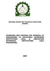 NATIONAL BOARD FOR TECHNICAL EDUCATION, KADUNA STANDARDS AND CRETERIA FOR APPROVAL OF PROGRAMMES IN VOCATIONAL ENTERPRISE INSTITUTIONS (VEIs) & INNOVATION ENTERPRISE INSTITUTIONS (IEIs) PROGRAMMES 2007 1.0 INTRODUCTION Vocational Enterprise Institutions (VEIs) and Innovation Enterprise Institutions (IEIs) are institutions recently approved by the Federal Government to provide an alternative route to higher education, as part of the on-going reform of the Technical and Vocational Education sector. They are private institutions which will offer competency based-skills in vocational, technical or professional education and training at post-basic and post-secondary levels to equip the youth as well as working adults with vocational skills and knowledge to meet the increasing demand for skilled manpower in the various sectors of the nation's economy. Nigeria's ability to realize the 2020 vision of becoming one of the twenty largest economies in the world by the year 2020 is hugely dependent on the capacity to transform its youthful population into highly skilled and competent citizens capable of fully addressing the needs of the growing economy and competing favourably in the global arena. A large part of the responsibility for preparing such citizens rests on higher education institutions, but which are constrained by several challenges including: lack of capacity to accommodate increasing number of applicants; low participation of the private sector in skills training and development; and mismatch between the training provided and needs of employers; These challenges pose serious threats to the attainment of the 2020 vision. To address these and many other challenges Government has approved establishment of the private sector-led Vocational Enterprise Institutions (VEIs) and Innovation Enterprise Institutions (IEIs) with the major aim of widening access to Technical and Vocational Education and Training (TVET) to serve the needs of the industry and selfempowerment of the nation's citizens. This initiative, it is hoped, will bring on board training providers with relevant labour market expertise, resources and diversity of perspectives to skills development. Collaboration between Government and private sector is a powerful way to ensure that the Federal Ministry of Education (FME) and its agencies remain responsive to the national and global economic challenges of the 21st Century 2 Target Groups The VEIs and IEIs are expected to provide credible alternative forms of education that will cater for the needs of: School leavers who wish to acquire demonstrable practical skills to secure employment or generate employment Persons seeking for career paths that do not need university degrees Persons who have not studied for some time and desire to do so Persons without time for full time study but want to enhance their skills Persons wishing to go into self-employment University graduates seeking employable skills and Adults seeking opportunities to re-skill themselves Objectives and Scope The VEIs and IEIs are designed to widen access to vocational education and offer credible alternative to higher education, through the provision of relevant industry-specific employable skills. Citizens are expected to find within this sub-sector an avenue for acquiring competence-based skills that are driven by demands from the industry and employers. They are designed to be principally private sector operated and readily responsive to the demands of the economy. As presently conceived, the institutions have focus on technical knowledge and skills that are relevant but not restricted to the following specific industries: Information & Communication Technology (ICT) Oil & Gas Technology Agriculture Welding & Fabrication Fashion & Clothing Technology 3 Hospitality & Tourism Film & TV production Creative Arts Construction & Engineering Paralegal Studies Telecommunications Manufacturing Professional Development Banking & Finance The VEIs and IEIs are envisaged to fulfil the following specific objectives: i. Increase access to education at Post-Basic levels for all ages thus addressing the 'JAMB bottleneck' by increasing options and absorbing more youth into Higher Education (HE), who may have otherwise been unable to secure admissions. ii. Be principally private sector driven, and readily responsive to labour market demands. iii. Provide the necessary link between education, science, technology, innovation and the labour market. iv. Use 21st Century technology to deliver up-to-date curricula and skills relevant to the needs of employers in the labour market. v. Seek to develop learners' capacity to think creatively, critically and transform knowledge and skills into wealth and a broader economic base. vi. Train and ensure that students understand how their expertise fits into a framework for improving the society and fulfilling national goals. 4 vii. Economically empower the individual and community through poverty alleviation programmes by increasing employability. viii. Set new standards in design and delivery of competency and skills based Education and Training. ix. Contribute technology, capital, industry expertise in TVET – through participation in curriculum development, training, networks, qualified staff and access to production equipment and know how. x. Provide job opportunities through established linkages to industries and recruitment agencies 2.0 PROGRAMMES AND QUALIFICATIONS The Vocational Enterprise Institutions (VEIs) will admit candidates with a minimum of basic education certificate (i.e. post Junior Secondary School) and cover multidisciplinary areas that will prepare learners for jobs in most industries, including, but not limited to those listed under Objectives and Scope above. The Innovation Enterprise Institutions (IEIs) on the other hand will admit students with a minimum of 5 credits at senior secondary certificate (SSSC, NTC, NBC) and are expected to train them to think creatively, crit