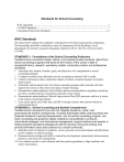 Standards for School Counseling WAC Standards .......................................................................................................................... 1 CACREP Standards .................................................................................................................... 7 Conceptual Framework Standards ............................................................................................ 13 WAC Standards The items below indicate the candidate’s estimated level of achievement and/or competency. The knowledge and skills evaluated are areas of competence for the Residency-Level Benchmarks for School Counselors Standards reflected in WAC 180-78A-270 (a) (5) [Rev. 12/3/04]. STANDARD 1: Foundations of the School Counseling Profession Certified school counselors design, deliver, and evaluate student-centered, data-driven school counseling programs that advance the mission of the school in light of recognized theory, research, exemplary models, community context, and professional standards. 1. Articulates key features, benefits, goals, and objectives of a comprehensive school counseling program; 2. Conducts counselor time utilization activity according to national ASCA model; 3. Collects and analyzes data to determine impact of school counselor program on student achievement; 4. Articulates and documents how the school counseling program and counselor activities support the mission of the school and impact student learning; 5. Demonstrates understanding of school district policies and procedures regarding counseling activities, student behavior, and general operation of the school; 6. Demonstrates understanding of School Improvement Plan (SIP) processes and how it relates to the school counseling program; 7. Uses school report card, other data, and SIP to design systemic interventions based on research and theory. STANDARD 2: School Counseling and Student Competencies Certified school counselors know and can integrate academic, career, and personal/social student competencies, including Washington State Learning Goals and Essential Academic Learning Requirements, into the school counseling program; can teach counseling and guidance related material by using effective curriculum, instructional strategies, and instructional management; support teachers and parents in helping students develop knowledge and skill for learning, living and working; and provide information about best practices to a school community. 8. Identifies needs of students in academic, career, personal, and social domains and determines positive impact on student learning; 9. Demonstrates knowledge and skills in curriculum development, instructional and assessment practices, and classroom management; 10. Uses student records to assist students and their parents/guardians to align academic and career expectations; Standards for School Counseling Page 2 11. Knows and integrates academic, career, and personal/social student competencies, including Washington State Learning Goals, Essential Academic Learning Requirements, and Grade Level Expectations, into the school counseling program; 12. Guides individuals and groups of students through the development of educational and career awareness and/or plans in order to develop knowledge and skills for learning, living, and working; 13. Promotes academic rigor and helps prepare students for successful transitions to the next level of schooling from kindergarten to high school and beyond; 14. Assists teachers with infusing affective skills and career development, e.g., problem solving, goal setting and decisions making; 15. Able to design needs assessment, analyze results, and use data to set priorities. STANDARD 3: Human Growth and Development Certified school counselors apply comprehensive, in-depth knowledge of human growth and development to improve student learning and well being and to enhance resiliency; provide guidance to parents and teachers about developmentally appropriate practices that support students throughout their schooling experience. 16. Demonstrates comprehensive, in-depth knowledge of human growth and development to improve student learning and well-being; 17. Provides guidance to parents and caregivers about developmentally appropriate practices that support students to motivate and nurture growth in academic, career, and personal/social domains; 18. Consults with staff and families about developmental needs of students and increases resiliency of students through development of skills in academic, career, and personal/social domains and enhances personal connections to school, family and community; 19. Applies knowledge of learning theory, including styles, modalities, and multiple intelligences. STANDARD 4: Counseling Theories and Techniques Certified school counselors demonstrate an understanding of established and emerging counseling theories through effective use of individual and group techniques for working with a diverse population. 20. Counsels individual students and small groups of students using appropriate theories and techniques with respect to each diverse learner; 21. Uses counseling strategies to help students so they can be emotionally and socially prepared to maximize their instructional time; 22. Applies career development theory in educational planning; 23. Articulates a personal and professional belief statement and counseling philosophy; 24. Demonstrates a knowledge of mental health disorders, including substance abuse, and knows how and when to make referrals; 25. Uses counseling strategies that maximizes students’ success and instructional time. Standards for School Counseling Page 3 STANDARD 5: Equity, Fairness, and Diversity Certified school counselors value and show respect for all members of the community; demonstrate fairness, equity, and sensitivity to every student, and they advocate for equitable access to instructional programs and activities; use data for designing and implementing plan