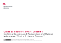Grade 5: Module 4: Unit 1: Lesson 1 Building Background Knowledge and Making Inferences: What is A Natural Disaster? This work is licensed under a Creative Commons Attribution-NonCommercial-ShareAlike 3.0 Unported License. Exempt third-party content is indicated by the footer: © (name of copyright holder). Used by permission and not subject to Creative Commons license. GRADE 5: MODULE 4: UNIT 1: LESSON 1 Building Background Knowledge and Making Inferences: What is A Natural Disaster? Long-Term Targets Addressed (Based on NYSP12 ELA CCLS) I can make inferences using quotes from the text. (RI.5.1) I can accurately synthesize information from multiple texts on the same topic. (RI.5.9) I can effectively engage in discussions with diverse partners about fifth-grade topics and texts. (SL.5.1) Supporting Learning Targets Ongoing Assessment • I can make inferences about natural disasters based on information from texts. • Journal (What Do We Know About Natural Disasters, Hurricanes, and Earthquakes anchor charts, glossaries) • I can draw conclusions about natural disasters following a discussion. Copyright © 2013 by Expeditionary Learning, New York, NY. All Rights Reserved. NYS Common Core ELA Curriculum • G5:M4:U1:L1 • August 2013 • 1 GRADE 5: MODULE 4: UNIT 1: LESSON 1 Building Background Knowledge and Making Inferences: What is A Natural Disaster? Agenda Teaching Notes 1. Opening • Do not define the term natural disasters for students yet. They will build a shared understanding of this phrase throughout today’s lesson. A. Engaging the Reader: What Do We Already Know about Natural Disasters? (7 minutes) B. Introducing Learning Targets (5 minutes) 2. Work Time A. Gallery Walk: Inferring about Natural Disasters (10 minutes) B. World Café: Drawing Conclusions about Natural Disasters (20 minutes) C. Key Vocabulary: What Is a “Natural Disaster?” (5 minutes) 3. Closing and Assessment A. Review Learning Targets(3 minutes) B. Introduce Module Routines: Journals, Vocabulary Glossaries, and Independent Reading (10 minutes) 4. Homework A. Read your independent reading book. Use the evidence flags to note things as you read that you can add to the What Do We Know about Natural Disasters? anchor chart. Be prepared to share these with a partner. • Students will again experience a Gallery Walk protocol to examine images in order to pique curiosity and allow for an informal pre-assessment of their knowledge of earthquakes and hurricanes. This is a familiar protocol for students as they have experienced Gallery Walks in every previous module. They will need only a brief reminder of the process and expectations. • In advance: Prepare the images for the Gallery Walk by either posting them around the room separated enough to give several students room to stand around each one and make observations, or making folders with sets of all images that can be distributed to each table (sets of desks) so every student may examine each one independently. • Students are introduced to a new protocol in this lesson, the World Café. This is a powerful and engaging protocol that allows for quick discussion on a variety of topics as well as the opportunity for movement, discussion with several peers, and practice with a leadership role. In advance, carefully review the process for this protocol so you can visualize it, explain it, and model it for students. There are a lot of transitions, and it is fast-paced. Given that this will likely be students’ first time using this protocol, you may need to allocate more time for this protocol than is indicated in the lesson. • In advance: Prepare the recording charts for the World Café protocol. With a marker, write one of the three World Café prompts (see supporting materials) at the top of a large piece of chart paper. Be sure to prepare as many pieces of chart paper as necessary so that when students are placed in triads each triad has a piece of chart paper with a different question. There will be several pieces of chart paper with the same question (e.g., three or four pieces of chart paper with the same question on it, for a total of about 10 pieces of chart paper). • In advance: Place students in triads and post the triads so that all students can see them; this will save time during the lesson to set up for the World Café. • Review: Gallery Walk, World Café, and Thumb-o-Meter protocols (Appendix 1). • Prepare new anchor charts: What Do We Know about Natural Disasters?, Hurricanes and Earthquakes (see examples in supporting materials). Copyright © 2013 by Expeditionary Learning, New York, NY. All Rights Reserved. NYS Common Core ELA Curriculum • G5:M4:U1:L1 • August 2013 • 2 GRADE 5: MODULE 4: UNIT 1: LESSON 1 Building Background Knowledge and Making Inferences: What is A Natural Disaster? Lesson Vocabulary Materials natural, disaster, inference, draw, conclusion • Journals (one per student) • What Do You Know about Natural Disasters? anchor chart. (new, co-created with students during Work Time A and throughout the unit, see supporting materials) • Observe-Question-Infer note-catcher (one per student and one to display) • Images for Gallery Walk (one of each to display; see suggested links in supporting materials) • World Café charts (new, teacher-created, one per triad, see teaching notes) • Markers (one per triad) • Hurricanes anchor chart (new, co-created with student during Work Time C and throughout the unit, see supporting materials) • Earthquakes anchor chart (new, co-created with student during Work Time C and throughout the unit, see supporting materials) • Books for independent reading (see Unit 1 Recommended Texts list; enough books for every students to choose one) • Evidence flags (five per student) Copyright © 2013 by Expeditionary Learning, New York, NY. All Rights Reserved. NYS Common Core ELA Curriculum • G5:M4:U1:L1 • August 2013 • 3 GRADE 5: MODULE 4: UNIT 1: LESSON 1 Building Backgr