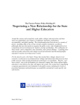 The Futures Project Policy Briefing #1 Negotiating a New Relationship for the State and Higher Education Around the country and around the world, public colleges and universities and their states are negotiating a new balance of regulatory autonomy, performance accountability, and public funding. This transformation has been driven by a variety of factors, including shifts in the revenue streams of public institutions, a political philosophy that uses the market to organize the public sector, and a heightened level of competition between institutions for students, prestige and funding. The combination of these trends—more competition, more autonomy, more private funding— is pushing more and more public universities and colleges toward privatization and threatening higher education’s mission of serving society’s needs. For the last five years, the Futures Project has tracked these changes. Based on our research, we advocate a new framework for colleges and universities that preserves their public missions while meeting demands for performance accountability. The first—and most critical—step is the development of a statewide compact that clearly defines higher education’s role and how the state will support the system. The second step is negotiating a separate agreement for each institution in the public system, outlining new levels of procedural autonomy and performance accountability customized to each specific role and mission. THE FUTURES PROJECT Policy for Higher Education in a Changing World March 2005, Page 1 Stories of Reform: Higher Education Steps into Uncharted Territory All eyes are on Virginia, where the public colleges and universities successfully convinced the legislature to grant them more autonomy in early 2005, including the authority to set tuition. In the summer of 2004, Colorado introduced vouchers into public higher education, directing state funds to students rather than to the institutions, along with changes that increased the flexibility of colleges and universities that signed performance agreements with the state.1 Following the passage of these reforms, governors and lawmakers in several other states, including Minnesota and West Virginia, publicly commented on their interest in pursuing similar changes, illustrating the rapid spread of policy ideas—even if untested—from one state to the next. Political and academic leaders should seek out examples of policy change with enough history to demonstrate results. The Colorado School of Mines is one example of an institution with increased autonomy that has been navigating Colorado’s political and economic realities for several years. In 2001, the state legislature granted Colorado School of Mines “exemplary” status. In return for more autonomy in budgeting, tuition setting, and academic programs, the college leadership signed an agreement that set performance goals for the institution as a highly selective engineering college, including increases in graduation rates, employer satisfaction, and pass rates for the Fundamentals of Engineering examination.2 Early results were positive: applications increased and fundraising reaped strong rewards. Application, enrollment and retention numbers for students of color made impressive gains. Mines also partnered with local industry to quickly create several new Master’s programs—a process that would have taken years under the old system. But there is cause for concern as well. Despite the detailed nature of the performance agreement, it does not hold Mines accountable for maintaining or increasing enrollments of students of color, and the only financial aid goal is a minimum standard. The agreement also tightened admissions standards and gave the board of trustees the authority to recommend tuition increases. The combination results in policies that could make the institution more exclusive absent any incentive or mandate to prevent such an outcome. It is clear that college leaders have tried to keep Mines accessible to underserved students. The college sponsors an array of outreach, bridge and retention programs and has pledged to recycle a percentage of tuition increases into financial aid. In fall of 2003 the enrollment of undergraduate students of color was 378, up from just 192 students in the fall of 1989. But the School has also started an aggressive recruiting plan that is increasing overall enrollments faster than enrollments for students of color. As a result, in 2003-2004 the Diversity Committee warned that without intervention, “our minority student numbers may increase slightly, but our percentage will decrease significantly.”3 March 2005, Page 2 The Colorado School of Mines is a small, specialized institution, but it serves as an insightful case study for all institutional sizes and types. From the Mines case, we see that autonomy in procedural areas has helped the institution to better serve the citizens of Colorado in many ways. But when the institution is not held accountable for meeting public purposes in an area as critical as providing opportunity to underrepresented students, there is room for trouble. At Mines, current leaders have demonstrated their willingness to devote attention to this issue. But, as a whole, can higher education afford to leave public purposes to chance? Why States and their Public Colleges and Universities Need to Craft a New Relationship with Care For the last decade, public colleges and universities have been competing harder than ever before for students and revenue against other traditional public and private institutions and a host of for-profit and corporate universities, online programs and certificate programs. In this market-driven environment, state institutions have been advocating for more flexibility. They argue that because the state’s share of their budgets has steadily shrunk, the state should grant the institutions greater autonomy in operational areas such as tuition-setting and 