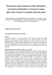 The genome-wide landscape of DNA methylation and hydroxymethylation in response to sleep deprivation impacts on synaptic plasticity genes Renaud MASSART, Marlène FREYBURGER, Matthew SUDERMAN, Jean PAQUET, Janine EL HELOU, Erika BÉLANGER-NELSON, Adeline RACHALSKI, Ouma-Chandrou KOUMAR, Julie CARRIER, Moshe SZYF, Valérie MONGRAIN Supplementary information SUPPLEMENTARY MATERIAL AND METHODS Protocol Mice were purchased from Jackson Laboratories (Bar Harbor, ME, USA) and studied directly (5mC, 5hmC) or after being bred on site (EEG, microarray). Mice were maintained under standard housing conditions (free access to food and water, 12hlight/12h-dark cycle, 22-25oC ambient temperature) for 2 weeks, and then studied in the same conditions between 8 and 16 weeks of age. All experiments were approved by the Ethical Committee for Animal Experimentation of the Hôpital du Sacré-Coeur de Montréal. EEG/EMG electrode implantation surgery and recording Mice were implanted for electroencephalography (EEG) and electromyography (EMG) as detailed previously.1 Briefly, when mice reached 9-10 weeks, surgery was performed under deep Ketamine/Xylazine anesthesia (120/10 mg/kg, intraperitoneal injection). Two gold-plated screws (diameter 1.1mm) were screwed through the skull over the right cerebral hemisphere (anterior: 1.7 mm lateral to midline, 1.5 mm anterior to bregma; posterior: 1.7 mm lateral to midline, 1.0 mm anterior to lambda) to serve as EEG electrodes. A third screw placed 6 mm lateral to midline and 3 mm posterior to bregma served as a reference. Three anchors screws were implanted over the left hemisphere. Two gold wires served as EMG electrodes and were inserted between neck muscles. EEG and EMG electrodes were soldered to a connector and cemented to the skull with the anchor screws. Mice were connected to a swivel contact four days after surgeries, and were habituated for a week before recording. EEG/EMG were amplified (Lamont 1 amplifiers), sampled at 256 Hz and filtered using the software Harmonie (Natus, San Carlos, CA). EEG spectral analysis, Detection of slow waves and statistical analyses Spectral analysis was performed using fast Fourier transform on the bipolar EEG signal of artifact-free NREM sleep epochs. SW detection was performed on the bipolar EEG signal of artifact-free NREM sleep epochs. EEG data were initially band pass filtered between 0.5 and 4.0 Hz using a linear phase FIR filter (-3 dB), and the following criteria were used to detect SW: negative-to-positive peak-to-peak amplitude >120 µV; negative peak amplitude >40 µV; negative phase duration between 0.1-1.0 sec, and positive phase duration <1 sec. The density of SW was calculated (number per minute of NREM sleep) and for each SW these characteristics were derived: peak-to-peak amplitude (difference in voltage between negative and positive peaks of unfiltered signal in µV), slope (velocity of the change between the negative and positive peaks in µV/sec), duration of the negative phase and duration of the positive phase (in sec). Density and characteristics of SW were averaged per 12h light and dark periods during both baseline and recovery. SW properties were also separately averaged for 12 intervals during the light period, for which an equal number of epochs contributed, for 8 intervals during the 6h immediately following SD, and for 6 intervals during the dark periods. One-way analyses of variance (ANOVAs) were used to compare, between genotypes, the power spectra and two-way ANOVAs were used for properties SW per 12h period (Genotype x Day). Time course of SW properties were compared separately for the light and dark periods using two-way repeated-measure ANOVAs with factors Genotype (Nlgn1+/+ vs. Nlgn+/- vs. Nlgn-/-) and Interval. Significant effects were decomposed using planned comparisons and significance levels for repeated measures were adjusted using Huynh-Feldt correction. Statistical analyses were performed using Statistica (StatSoft Inc., Tulsa, OK). Significance threshold was set to 0.05 and data are reported as mean ± SEM. cDNA Microarray and Quantitative PCR After EEG recordings, half of Nlgn-/- mice and their Nlgn1+/+ littermates were submitted to a second 6h SD and were sacrificed at ZT6 together with non-sleep deprived mice (Ctrl). Brains were immediately extracted and frozen on dry ice or liquid nitrogen. RNA extraction and reverse transcription were performed as detailed before.1,2 Briefly, RNA was extracted from the forebrain (excision of the brainstem and cerebellum) 2 using the RNeasy Lipid Tissue Mini kit and was Dnase-treated (QIAgen). Total RNA was quantified using a NanoDrop Spectrophotometer ND-1000 (NanoDrop Technologies, Inc.) and its integrity was assessed using a 2100 Bioanalyzer (Agilent Technologies). Sense-strand cDNA was synthesized from 250ng of total RNA using the Ambion® WT Expression Kit according to the manufacturer’s instructions (Life Technologies, Burlington, ON). The cDNA was fragmented and labeled with the Affymetrix GeneChip® WT Terminal Labeling Kit according to manufacturer’s instructions (Affymetrix). The fragmented and labeled DNA target was hybridized on Mouse Gene 2.0 ST Array (Affymetrix) and incubated at 450C in a Genechip® Hybridization oven 640 (Affymetrix) for 17h at 60 rpm. Arrays were 2 then washed in a GeneChips® Fluidics Station 450 (Affymetrix) using Affymetrix Hybridization Wash and Stain kit according to the manufacturer’s instructions (Affymetrix). The microarrays were finally scanned on a GeneChip® scanner 3000 (Affymetrix). Sense-strand cDNA synthesis, fragmentation, labeling, hybridization and microarray scanning were performed by Genome Quebec (Montreal). Microarrays were analyzed using the GeneSpring GX software (Agilent). In brief, probe intensities were normalized to each other using RMA.3 Expression differences associated with SD and interaction between Genotype and SD were then obtained using two-way ANOVA with type-III sum of 