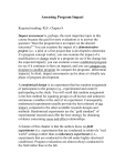 Assessing Program Impact Required reading: RLF, Chapter 8 Impact assessment is, perhaps, the most important topic in this course because the goal for most evaluations is to answer the question “Does the program have an impact on the desired outcomes?” You can examine the impact of a demonstration project (i.e., a pilot or a first project that is developed to determine if a program concept works); you can examine the impact of a modification or change made to a program (to see if the change has the expected impact); you can examine a more established program (to see if it continues to have an impact); and you can compare one program to another program (to compare the programs’ differential impacts). In short, impact assessments can be done at virtually any phase of program development. A randomized design is an experiment that has random assignment of participants to the groups (e.g., experimental and control) participating in the study. You will recall that random assignment is the best method for equating groups on all known and unknown extraneous variables at the start of an experiment. Consequently, randomized experiments usually provide the best estimate of net impact, compared to the other available research designs and methods. Randomized experiments are the “gold standard” of experimental research and offer the best strategy for obtaining evidence concerning cause and effect relationships. A feature of this chapter is that the authors focus on field experiments (i.e. experiments that are conducted in relatively “real world” settings) rather than on laboratory experiments (i.e., experiments that are conducted in the lab under highly structured conditions). Program evaluations are almost always conducted in the field rather than in the lab. I will provide some comments about each of the major sections in this chapter: When is an Impact Assessment Appropriate? Key Concepts in Impact Assessment. Randomized Field Experiments. Limitations on the Use of Randomized Experiments. Please note that I am going to include in this lecture a good deal of additional material that you should already know from taking your research methods class (so, hopefully, it will be review). This course is meant to build on your research methods course; hence, you might need to review some of the material from that course just in case you have forgotten some of it. In the introductory section, RLF made several points to remember: When determining program effect (did the program cause the observed changes) we need an estimate of the counterfactural (i.e., what would have happened if the program had not been implemented?) In education and the social sciences, what we can determine is probabilistic causation; that is, our results and the relationships we describe in our results are probabilistic, not necessary or absolute. We obtain degrees of evidence, not proof of causation. When thinking about causes in the social sciences and education, remember that we live in a multivariate world; that is, we live in a world of multiple causes, typically occurring concurrently; so be careful! I will add to the discussion about causation here that you must always think about the three necessary conditions for cause and effect. So commit these three conditions to memory! Here is Table 11.1 from my (and Larry Christensen’s) research methods textbook: http://www.southalabama.edu/coe/bset/johnson/dr_johnson/o h_master/Ch11/Tab11-01.pdf When is an Impact Assessment Appropriate? An impact assessment is appropriate when you need to know whether a program has a causal impact on certain outcomes. RLF point out that this can be the case for new programs, for pilot demonstration programs, for situations where changes are being made in ongoing programs, for periodic assessment of ongoing programs, and for testing the program theory. Keep in mind however, that before you commit to undertaking an impact assessment, it is wise to conduct an evaluability assessment to make sure the program and its stakeholders are ready for an impact assessment and that it is feasible to conduct an impact assessment. Basically, at least some form of an impact assessment frequently is called for in program evaluation. Also, if you are asked to conduct a benefit-cost assessment of a program, you must have an estimate of the program impacts. Key Concepts in Impact Assessment I’ve already mentioned the counterfactual. Remember, however, that we can only estimate this, because it actually is counter to the fact (the fact is that some people do get the treatment and there is no way to also NOT give these same people the treatment). As you learned in the lecture on the Kirkpatrick model, and you will learn more in this and the following chapters, there are many designs that we use to get estimates of the counterfactual, and some of these designs are more trustworthy than others. Here are a few ways to estimate the counterfactual: establish a baseline with your people and use that as your estimate, find or construct a comparison group that is similar to your treatment group and use them to obtain your estimate, and use random assignment to establish a control group that, in the long run, can be considered to be probabilistically equivalent to your treatment group (this control group can provide the best estimate of the counterfactual). I will review some experimental designs in a moment. RLF make the important distinction between randomized field experiments and quasi-experiments. The former have (by definition) random assignment to groups and are, therefore, the strongest designs for documenting cause and effect in real world settings. The latter (by definition) do not have random assignment and are, generally, moderately good at documenting cause and effect. In impact assessment you want to know if a program has an impact. Another way of saying this is “Did the program have a causal influence on important program outcomes?” Impact assessment 