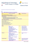 Please note this is a draft version until the course is fully published. AS Unit 1 – PROD1 Materials Components and Application Topic Print Resources (Subheadings) Page Number Electronic Resources Chapter 1 Materials, Components and Application Specification Reference 3.1.1 Section A: Materials and Components Learning Objectives become familiar with the range of materials and components available be able to identify materials and their main characteristics give reasons why material(s) and components have been used for particular applications Chapter 1 Electronic Resources: On your marks: Materials, components and application Revision quiz: Plastics Revision quiz: Metals and woods Revision quiz: Smart and modern materials Answers: Examination-style questions Answers: Product analysis exercises (student book) Answers: Product analysis exercises (online) Images Plastics Elastomers Plastics - Introduction to plastics - What are plastics? - Why are plastics so popular? - Sources of plastics - The main types of plastics (polymers) - General properties of plastics - Improving the properties of plastics: additives - Applications for thermoplastics - Biodegradable plastics - Processing plastics - Applications for thermosetting polymers - Thermoplastic and thermosetting materials 1-14 Case study: Polythene Webquest: Thermoplastics Elastomers - Thermoplastic elastomers (TPE) - Liquid silicon rubber (LSR) - Other thermoplastic and thermosetting materials - Identifying plastics’ processes 14-19 Webquest: Thermosetting plastics 20-28 Webquest: What are composites and what are their applications? Product analysis exercise: Car body kit Product analysis exercise: Biodegradable polymers Animation: Injection moulding Animation: Blow moulding Animation: Rotational moulding Animation: Plastics extrusion Case study 1: Plastics: - Plastics used in detergent packaging: bottled detergents Product analysis exercise 1: Thermoplastics - Plastic drinks bottle Composite materials Composite materials - Types of composite material - Common fibre-reinforced composites - Particle-based composite materials - Sheet-based composites © Nelson Thornes 2008 2 - Products where traditional materials have been replaced by composites Case study 2: Composite materials - Carbon fibres in bicycles Product analysis exercise 2: Glass-reinforced plastics Product analysis exercise: Carbon-fibre product – artificial leg Metals Metals - Types of metal - Sources of metals - Availability of metals - The structure of metals - Ferrous metals: iron and steel - Iron and carbon 29-31 Non-ferrous metals Non-ferrous metals 31-32 Alloys and alloying Alloys and alloying - Benefits of alloying - Alloying steels - Work hardening and heat-treating metals - Processing metals - Wasting processes (relating to metals) - Casting processes - Forging Product analysis exercise 3: Alloys - Pipe fittings, taps and valves Product analysis exercise 4: Non-ferrous metals - Aluminium drinks can 32-53 Webquest:Metals Case Study: Stainless steel Case Study: Mocha express coffee jug Product analysis exercise:Pressformed product – Sweet tin Product analysis exercise: Sand cast product – Wood burning stove Product analysis exercise: Pressure die casting – Utility knife Animation: Press Forming Animation: Cupping & Deep Drawing Animation: Pressure die casting Wood Wood - Sources of wood - Types of wood - The structure of wood 54-56 Veneers, laminates and composites Veneers, laminates and composites - Veneers - Laminates - Wood-based composites (man-made boards) 57-60 Case Study: Formica Case Study: Aalto Product analysis exercise: Wood based composite product Case study 3: Wood - Natural timber and manufactured boards Webquest: Wood – manufactured boards Product analysis exercise 5: Wood and manufactured boards - Laminated dining chair Glass Glass - Glass as a material - Manufacturing with glass - General properties of glass - Glass versus polymers 61-64 Webquest: Glass Ceramics Ceramics - Introduction to ceramics - Engineering ceramics - Manufacturing ceramic products 64-67 Webquest: Ceramics Papers and boards Papers and Boards - Types of paper - Paper properties and uses - Manufacturing with papers and boards - Cards and boards 67-69 Webquest: Papers and Boards Case Study: Paper cup Printing Printing - Printing processes - Electrostatic printing processes 70-75 ‘Smart’ and ‘modern’ materials ‘Smart’ and ‘modern’ materials - Introduction to ‘smart’ materials - Thermochromic pigments - Thermocolour film - Thermometers - Batteries - Phosporescent pigments 76-87 Product analysis exercise: Shape memory alloys 3 - Shape memory alloys - Piezoelectric devices - Smart grease - Smart fluids - Electroluminescent wires - Glowsticks - Smart textiles - Quantum tunnelling composites - Electronic smart glass - Modern materials - Fibre optics - Liquid crystal displays - Engineering timbers - Kevlar - Carbon fibre - Metals - Polymorph - Precious metal clays - Microfibres - Dichroic glass - Man-made boards Product analysis exercise 6: Tefal ‘red spot’ pans Chapter 2 Hand and commercial processing Specification Reference 3.1.3 Section C: Processes and Manufacture Learning Objectives understand how materials and components are processed to create the product from the design understand further processes related to joining, the deterioration of materials, finishes and finishing processes, and testing materials understand the general nature of manufacturing systems used to produce commercial products Chapter 2 Electronic Resources: On your marks: Revision quiz: Joining techniques Revision quiz: Finishes and properties Answers: Examination-style questions Answers: Product analysis exercises (student book) Answers: Product analysis exercises (online) Images Joining processes Joining processes - Introduction - Choosing a joining method - Summary of joining process 88-90 Joining metals Joining metals - Processes involving forming - Processes involving heat 91