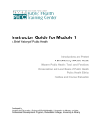 Instructor Guide for Module 1 A Brief History of Public Health Introductions and Pretest A Brief History of Public Health Modern Public Health: Tools and Functions Organization and Legal Basis of Public Health Public Health Ethics Posttest and Course Evaluation Developed by: Continuing Education, School of Public Health, University at Albany and the Professional Development Program, Rockefeller College, University at Albany Instructor’s Guide A Brief History of Public Health Acknowledgements The development of these training materials was made possible by support from the New York State Department of Health and the New York New Jersey Public Health Training Center, which is funded through a grant from the Health Resources and Services Administration (HRSA) of the U.S. Department of Health and Human Services. Project Coordinator Carol Young, PhD, Continuing Education, School of Public Health, University at Albany Content Experts Robert Burhans NYSDOH David O. Carpenter UAlbany Andrew Doniger Monroe Co. (NY) DOH William Leavy UAlbany Patrick Trapp NYSDOH Carol D. Young UAlbany Vicki Zeldin NYSDOH NYNJ Public Health Training Center Team Pennsylvania and Ohio Public Health Training Center Research, Design, and Editing Cheryl Reeves, MS/MLS, Continuing Education, School of Public Health, University at Albany Instructional Technologies Unit, Professional Development Program, Rockefeller College, University at Albany Contact Information New York New Jersey Public Health Training Center http://www.nynj-phtc.org/ Carol Young, PhD School of Public Health, University at Albany One University Place Rensselaer, NY 12144-3456 Phone: (518) 402-0330 Fax: (518) 402-1137 E-mail: cyoung@albany.edu Web: http://www.albany.edu/sph/ page 2 of 26 Instructor’s Guide A Brief History of Public Health How To Use This Guide This Instructor Guide accompanies the MS PowerPoint slides for Module 1: A Brief History of Public Health. It contains the slides, notes, key points, and additional references for the instructor’s presentation of Module 1. Instructors are encouraged to modify the material to suit the specific audience and/or location of instruction. Specific instructions on how to modify PowerPoint presentations can be found in the Course Guide, which should be used in conjunction with each of the Instructor Guides. All materials may be downloaded from the comprehensive curriculum source page at http://www.nynj-phtc.org/intro/. The entire course (Modules 0-4) is intended to be presented in six-hours. Module 1 is designed to take 60 minutes. Before you Begin Read the Course Guide for Instructors, which explains how to o Organize the entire day’s presentation o Create student guides o Use PowerPoint software Teaching tips, preparation checklists, and many other details are also provided. The Course Guide is found under “Other Materials” on the source page. Read the Instructor Guide for each module to become familiar with the content and flow. Look for notes and slides that require examples specific to your own training situation (i.e., audience, health department, location). Determine whether a module’s generic presentation should be modified for your specific audience. Additional slides may be found under “Other Materials” in the file “Additional Slides.” Review all activities in this module. Make sure you have materials to hand out to participants. page 3 of 26 Instructor’s Guide A Brief History of Public Health Module 1: A Brief History of Public Health Slide 1 Slide 2 Key Points: Module 0 established where PH is today o “What is Public Health?” o Multidisciplinary workforce, etc. This module answers o Slide 3 How did we get to this point? Key Points: To understand roots of public health A very fast run-through of history page 4 of 26 Instructor’s Guide A Brief History of Public Health Slide 4 Key Points: Public health is the most ancient of human activities From the beginning of human history, human beings have needed to ensure the survival of the larger community or the tribe Historically focuses beyond the individual to the whole population o Slide 5 EXAMPLE, early tribes understood the need to protect mothers and infants. Ensuring maternal and child health continues to be a major focus of Public Health today. Societies that survive develop “public health measures” -- strong rules/ regulations/ taboos/ powers to protect the community’s health: PH is imbedded in the belief system (religion, superstitions, and in the case of modern public health, science) PH is imposed by the political system. Key Points: Populations must protect conditions related to these requirements for survival: o Air – poor quality can cause sickness or death, often in minutes o Water – poor quality or lack of water can cause sickness or death in days o Food – can sustain or injure; poor quality or lack of food can cause sickness or death in days or weeks o Shelter – must have, at least on a seasonal basis o Care and mutual support – especially around birthing and protecting the new generation All these requirements continue to be essential for group survival and success page 5 of 26 Instructor’s Guide A Brief History of Public Health Slide 6 Key Points: Powerful codes and regulations have existed in multiple cultures, in virtually all civilizations, Eastern and Western Health codes are based on the society’s belief system and the society’s understanding of health/disease Salus populi: suprema lex esta = “Let the welfare of the people be the supreme law” Requirements and prohibitions (tribal rules) are passed on through oral traditions, for example: Slide 7 o Don’t camp in damp, swampy places o Don’t use still or unclear water o Don’t allow animal waste inside shelters o Avoid certain foods, plants or animals o Assist with feeding of infants Oral traditions eventually become part of written codes (e.g., in China, Middle East, North Africa, South and Central America) o EXAMPLE: 