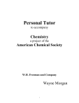Personal Tutor to accompany Chemistry a project of the American Chemical Society W.H. Freeman and Company Wayne Morgan 1 Table of Contents 0.0 Introduction to the Personal Tutor (pg.2) 1.0 Understanding the Uses of Numbers (pg.3) 1.1 1.2 1.3 1.4 1.5 1.6 1.7 1.8 2.0 Measurement and the Metric System (pg. 3) Derived Units (pg. 6) Dimensional Analysis (pg. 8) Precision and Accuracy in Measurement (pg. 10) Percent Error (pg. 12) Significant Figures (pg. 13) Using Significant Figures in Calculations (pg. 16) Scientific Notation (pg. 18) Understanding and Interpreting Graphs and Tables (pg. 20) 2.1 Types of Graphs (pg. 20) 2.1.1 2.1.2 2.1.3 2.1.4 2.1.5 2.2 2.3 3.0 What is a mole? (pg. 35) Molar Mass (pg. 35) MassMole Conversions (pg. 37) VolumeMole Conversions (pg. 40) Understanding Mass Relationships in Chemical Reactions (pg. 42) 4.1 4.2 4.3 4.4 5.0 Basic Graphing Rules (line and x-y graphs) (pg. 31) Interpreting Tables (pg. 32) Understanding the Mole (pg. 35) 3.1 3.2 3.3 3.4 4.0 Pie Charts (pg. 20) Bar Graphs (pg. 21) Multiple Bar Graphs (pg. 22) Line Graphs (pg. 24) x-y Plots/Graphs (pg. 25) Understanding Chemical Equations (pg. 42) Balancing Chemical Equations (pg. 43) Stoichiometry (pg. 45) Limiting Reactants (pg. 46) Understanding Lewis Dot and Structural Formulas (pg. 50) 5.1 5.2 5.3 5.4 Steps in Writing the Lewis Structure (pg. 50) Structural Formulas (pg. 54) Bonding Patterns in Many Hydrocarbon Molecules (pg. 55) Formal Charge (pg. 57) 6.0 Understanding Gas Law Problems (pg. 59) 7.0 Answers, Solutions, and Explanations for the Practice Problems (pg. 67) 2 Introduction A chemistry textbook is a valuable resource. It can help you in developing a deeper understanding of the material you discuss in class. It can illustrate the most common types of problems you will face and give examples of how to approach those problems. The textbook cannot anticipate which students will have difficulty with computations. Even the most comprehensive textbook cannot possibly show every type of problem that might be encountered. The Personal Tutor is a supplement to the textbook to give you more guidance and practice with problems and computations. Using the Personal Tutor is much like visiting the professor during office hours or going to a human tutor. You may need to take advantage of it frequently or you may only need its assistance a few times during the course. The questions can be a good review when preparing for the test even if you are confident that you know how to solve the problems or do the computations. Even the Personal Tutor is not a comprehensive set of problems. However, the types of problems shown here should help you get a good foundation in solving problems. It is important to remember that an examination would not truly test your understanding of concepts and your ability to solve problems if the professor merely put on the problems you had already seen. If you use your textbook, the Personal Tutor, and any other sources available you can be successful in this chemistry course. 3 Understanding the Uses of Numbers Chemists rely on data in order to test theories, solve problems and make decisions. Most of the data is numerical data accumulated from careful measurements in the laboratory. An important part of learning chemistry is learning how to interpret and use numerical data. MEASUREMENT AND THE METRIC SYSTEM Metric units were first introduced in France more than 100 years ago. A modernized form of the metric system was internationally adopted in 1960. The system is called “SI,” which is an abbreviation of its French name, Le Système International d’Unités. SI units are used by scientists in all nations, including the United States. This system has a small number of base units from which all other necessary units are derived. Quantity SI Unit kilogram meter second Kelvin mole ampere Mass Length Time Temperature Amount of substance Electric current Abbreviation kg m s K mol A Figure 1 Fundamental SI Units The limited number of units in Figure 1 is not sufficient for every type of measurement a chemist might need to make. For example, the SI unit of length is the meter (symbolized by m). Most doorways are about two meters high. However, many lengths we may wish to measure are either much larger (distance from the earth to the sun) or much smaller (width of a dime or the size of an atomic nucleus) than a meter. To handle such measurements easily, common metric prefixes are used to change the size of the unit. The distance from the earth to the sun can be expressed in kilometers (km), the width of a dime can be expressed in terms of millimeters (mm) and the size of an atomic nucleus in terms of picometers (pm) . Figure 2 lists the most useful metric prefixes and their meanings. Prefix Abbreviation M mega Meaning 106 kilo k 103 deci d 101 centi c 102 milli m 103 micro- 106 nano n 109 pico p 1012 Example(s) 700 Megabyte = 700,000,000 bytes (storage on a CD-R) 1.6 kilometers = 1600 meters (about 1 mile) 5.91 deciliters = 0.591 liters (soda in a 20 oz. bottle) 2.4 centimeters = .024 meters (diameter of a quarter) 355 milliliters = .355 liters (volume of soda in a 12 oz. can) 25 m = 2.5 X 105 m (size of a cell in your body) 656 nm = 6.56 X 107 m (wavelength of the red line in the hydrogen spectrum) .01 pm = 1 x 1014 m (approximate size of an atomic nucleus) Figure 2 Common Metric Prefixes 4 You may me more familiar with the typical English units of measurement that we use in everyday life. Here are some comparisons that may help you visualize the metric units. 1 kilogram is a little over 2 pounds (1 kilogram = 2.2 lbs) 1 meter is a little over 1 yard (1 meter = 39 inches) 1.6 kilometer is about 1 mile (1600 meters 1 mile) 273 K is the freezing point of water (0 oC or 32 oF) 373 K is the boiling point of water (100 oC or 212 oF) 293 K is about room temperature (20 oC or 68 oF) One advantage of using the metric system is the ease with which you can convert from one prefix to another. 