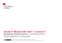Grade 8: Module 2B: Unit 1: Lesson 9 Reading Shakespeare: Understanding Shakespeare’s Language This work is licensed under a Creative Commons Attribution-NonCommercial-ShareAlike 3.0 Unported License. Exempt third-party content is indicated by the footer: © (name of copyright holder). Used by permission and not subject to Creative Commons license. GRADE 8: MODULE 2B: UNIT 1: LESSON 9 Reading Shakespeare: Understanding Shakespeare’s Language Long-Term Targets Addressed (Based on NYSP12 ELA CCLS) I can analyze how specific dialogue or incidents in a plot propel the action, reveal aspects of a character, or provoke a decision. (RL.8.3) I can determine the meaning of words and phrases in literary text (figurative, connotative, and technical meanings). (RL.8.4) Supporting Learning Targets Ongoing Assessment • I can analyze how specific lines of dialogue in A Midsummer Night’s Dream help the play move forward. • Act 1, Scene 1 Written Conversation note-catcher • I can analyze Shakespeare’s use of language in A Midsummer Night’s Dream. • Lesson 9 structured notes Created by Expeditionary Learning, on behalf of Public Consulting Group, Inc. © Public Consulting Group, Inc., with a perpetual license granted to Expeditionary Learning Outward Bound, Inc. NYS Common Core ELA Curriculum • G8:M2B:U1:L9 • June 2014• 1 GRADE 8: MODULE 2B: UNIT 1: LESSON 9 Reading Shakespeare: Understanding Shakespeare’s Language Agenda Teaching Notes 1. Opening • Having built a bit of confidence in reading Shakespeare’s language and a bit of engagement about the humor in the play (during Lesson 8), students now read the play from the beginning. A. Engaging the Reader: Sharing the Gist (3 minutes) B. Reviewing Learning Targets (2 minutes) 2. Work Time A. Drama Circle: Act 1, Scene 1 (25 minutes) B. Written Conversation: Understanding Shakespeare’s Language (10 minutes) 3. Closing and Assessment A. Tips for Reading Shakespeare (4 minutes) B. Previewing Homework (1 minute) 4. Homework A. Reread 1.1.21–129 and complete the structured notes. • As noted in Lesson 8, throughout this module, much of students’ initial reading of the play will occur during an in-class Drama Circle. Students will read the selected lines twice in class, once all the way through without stopping and a second time with guided teacher questions. • Students then will reread the same scene independently for homework, reinforcing the idea that complex texts often require multiple readings. Today, they read part of Act 1, Scene 1 in a Drama Circle so they can continue building confidence with the text with teacher support. • In a classroom with many struggling readers, consider conducting the initial Drama Circle read-aloud yourself (i.e., reading all the parts) so students can hear the scene read fluently before attempting it. • In order to spend more time closely reading and studying other passages, students will skip certain lines of A Midsummer Night’s Dream. The decision to skip certain lines was made by considering opportunities for students to attend to the character and thematic developments over the course of the text. When students skip a portion of the text, you will provides an oral summary and there will also be a written summary in the structured notes. • In this lesson, students skip a portion of the opening scene between Theseus and Hippolyta, in order to jump right into Egeus’s plea to Theseus for help controlling Hermia. (Consider assigning the omitted scenes to strong readers as extension homework.) • In advance: Copy the Tips for Reading Shakespeare bookmark on cardstock and cut into strips, one per student. • Review: Written Conversation protocol (see Appendix). • Post: Learning targets. Created by Expeditionary Learning, on behalf of Public Consulting Group, Inc. © Public Consulting Group, Inc., with a perpetual license granted to Expeditionary Learning Outward Bound, Inc. NYS Common Core ELA Curriculum • G8:M2B:U1:L9 • June 2014• 2 GRADE 8: MODULE 2B: UNIT 1: LESSON 9 Reading Shakespeare: Understanding Shakespeare’s Language Lesson Vocabulary Materials dialogue; vexation (1.1.23), consent (1.1.26), cunning (1.1.37), beseech (1.1.64), relent (1.1.93) • Play Map (from Lesson 8; one per student) • A Midsummer Night’s Dream (book; one per student) • Act 1, Scene 1 Teacher’s Guide, Part 1 (for teacher reference) • Act 1, Scene 1 Written Conversation note-catcher (one per student) • Tips for Reading Shakespeare handout (one per student) • Tips for Reading Shakespeare bookmark (one per student) • A Midsummer Night’s Dream structured notes, 1.1.21–129 (one per student) • A Midsummer Night’s Dream supported structured notes, 1.1.21–129 (optional, for students needing additional support) • A Midsummer Night’s Dream structured notes teacher’s guide, 1.1.21–129 (for teacher reference) Created by Expeditionary Learning, on behalf of Public Consulting Group, Inc. © Public Consulting Group, Inc., with a perpetual license granted to Expeditionary Learning Outward Bound, Inc. NYS Common Core ELA Curriculum • G8:M2B:U1:L9 • June 2014• 3 GRADE 8: MODULE 2B: UNIT 1: LESSON 9 Reading Shakespeare: Understanding Shakespeare’s Language Meeting Students’ Needs Opening A. Engaging the Reader: Sharing the Gist (3 minutes) • Invite students to sit with their New York City discussion partners. • Have them discuss their gist notes about Act 1, Scene 2 from last night’s homework. • After a minute, cold call a pair to share ideas about the most important plot details from Act 1, Scene 2. Listen for students to remember that this scene featured Bottom and the other workmen discussing the play they will perform at Theseus and Hippolyta’s wedding. They should also recall that Bottom emerges as a comically controlling, but ignorant, character. B. Reviewing Learning Targets (2 minutes) • Read the learning targets aloud as students follow along si