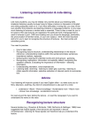 Listening comprehension & note-taking Introduction Like many students, you may be initially very worried about your listening skills. Academic listening usually involves trying to follow a lecture or discussion in English and writing adequate notes on it. If you have difficulties in doing this, you may not be sure whether the problems are listening problems or language problems. In any case, much listening to lectures or similar texts is essential. There is also a need for you to be aware of the way lectures are organised, the particular kind of language that is used in lectures (Lynch, 1983) and making sure you know the language, particularly the pronunciation of familiar words, of your own subject. I think the most important skill is for you to learn to recognise the structure of lectures - the main points and subsidiary points. You need to practise: How to take notes. Recognising lecture structure: understanding relationships in the lecture reference; understanding relations within the sentence/complex sentences; importance markers, signposts. Deducing the meaning of unfamiliar words and word groups - guessing. Recognising implications: information not explicitly stated; recognising the speaker's attitude. Evaluating the importance of information - selecting information. Understanding intonation, voice emphasis etc. Listening skills: skimming - listening to obtain gist; scanning - listening to obtain specific information; selective extraction of relevant points to summarise text. Advice Your listening will improve quickly if you hear English often - so make sure you do films, television, anything. Any kind of comprehension is also part of a circle: understand learn have knowledge understand more have more knowledge understand more etc. learn more So read around the topic before the lecture - or read the newspaper if you want to understand the news on the radio. Recognising lecture structure Several studies (e.g. Chaudron & Richards, 1986; DeCarrico & Nattinger, 1988) have suggested that explicit signals of text structure are important in lecture comprehension. Listening for these signals can therefore help you understand the lecture. Signals The tables below show some of the most common signals used in lectures to indicate structure (Leech & Svartvik, 1975). Listen for them in your lectures. 1. Introducing 2. Giving background information 3. Defining 4. Enumerating/Listing 5. Giving examples 6. Showing importance/Emphasising 7. Clarifying/Explaining/Putting it in other words 8. Moving on/Changing direction 9. Giving further information 10. Giving contrasting information 11. Classifying 12. Digressing 13. Referring to visuals 14. Concluding 1. Introducing At the beginning of a lecture, or a section of a lecture, the lecturer will give you some idea about the structure of the lecture. Listen for these signals as it will help you understand what the lecturer is saying. What I intend to say is What I'd like to do is to discuss What I intend to do is to explain In my talk today, My topic today is Today, I'm going to talk about I'm going to talk to you about My colleagues and I are going to give a short presentation on Today I want to consider In this talk, I would like to concentrate on The subject of this talk is The purpose of this talk is to This talk is designed to … 2. Giving background information Before the new information is given, the lecturer will often summarise what you are expected to know about the subject to be covered. This could refer back to a previous lecture or to some background reading you should have done. As we know As we have already seen … As we have all read It's clear that It goes without saying We all understand It is understood You'll remember 3. Defining In a lecture, it is often necessary to define the terms that will be used. This is important as familiar words can have specific meanings in different subjects. is is called X is known as may be defined as is a type of Y that/which … By X, I mean This term is used generally to mean In the field of Y, the term refers to A type of Y which … is X. 4. Enumerating/Listing The lecturer will often be explicit about the order in which new points will be mentioned. To make the order clear we use various links and connectives. Firstly Secondly Next Then Thirdly Lastly Finally First of all In the first place For one thing To begin with In the second place For another thing The first point I'd like to make is second … next last 5. Giving examples In lectures, it is common to make generalisations. These generalisations are often supported with examples. These signals can help you to understand which generalisations the examples refer to. This … shown is exemplified illustrated by For example, For instance, You only have to think of Remember, shows A key experiment exemplifies illustrates … this. … This is shown by the following examples: The following are examples of this: The following is a case in point: Let me give you a couple of examples: X … is a case in point. Take X … for example for instance such as … 6. Showing importance/Emphasising When you are taking notes, you cannot write down every word. You need to distinguish between important and less important information. The lecturer can use these signals to draw your attention to the important points. I want to stress I want to highlight I'd like to emphasise I'd like to put emphasis on It's important to remember that We should bear in mind that Don't forget that … The crucial point is The essential point is The fundamental point is Furthermore, What's more, This supports my argument that, It follows, therefore, that What (in effect) we are saying is … 7. Clarifying/Explaining/Putting it in other words The lecturer will try to explain the meaning of difficult concepts. To do this he or she may repeat the information using different words. It is important for you to recognise that this is the same information expressed differently and not ne