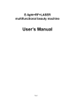 E-light+RF+LASER multifunctional beauty machine User’s Manual Page 1 Page 2 Contents Chapter 1 Product structure ...................................................................................................... 3 Chapter 2 Accessories list ......................................................................................................... 4 Chapter 3 Product informaion ...................................................... Error! Bookmark not defined. Chapter 4 Installation.................................................................................................................. 5 Chapter 5 Operation.................................................................................................................... 7 Chapter 6 Treatment ................................................................................................................. 12 6.1 Principle ............................................................................................................................. 12 6.2 Hand-piece and Application .............................................................................................. 13 6.3 Attentions before the treatment ......................................................................................... 14 6.4 Hair removal .................................................................................................................... 14 6.5 Skin rejuvenation ............................................................................................................... 15 6.6 Pigmentation Therapy ....................................................................................................... 16 6.7 Vascular Therapy............................................................................................................... 17 6.8 Acne Therapy .................................................................................................................... 17 6.9 Wrinkle removal ................................................................................................................. 18 6.10 After Treatment Care ..................................................................................................... 18 Chapter 7 Service manual ........................................................................................................ 19 Chapter 8 Maintenance ............................................................................................................. 20 Page 3 CAUTION 1. When you received the new machine, please open it work one minute (enjoin from the machine working). 2. shut down the machine. 3. Affusion water again 4. Anew Open the machine 5. When the water stream very well, then you can let the machine working. Chapter 1 Product structure 10.4" TFT color touch screen Hand-piece Key switch Emergency stop button CPC connector Page 4 Overflow hole Infusion hole circuit breaker Power plug Remote control Drain hole Chapter 2 Accessories list hand-piece and 5 filters Funnel Protect glass Goggle Key switch laser handle RF handle Power cord RF tips laser tips Chapter 3 Product informaion 3.1 Application E light application: 1. Therapy acne 2. Reduction of vascular lesions 3. Reduction of pigmented lesions Page 5 4. Skin rejuvenation 5. Permanent hair removal 6. Wrinkle removal RF application: 1. Skin lifting, tightening, and whitening 2. New collagen stimulation and production 3. Removes fine lines and wrinkles 4. Facial remodeling and body contouring 5. Visibly minimize pores 6. Circumference and cellulite reduction 7. Body Shaping areas: abdomen, buttocks, thighs, neck, upper arms. Laser application: 1. 1064nm Wavelength: Remove black and dark blue tattoo pigments, such as tattoos, eyebrows, dark color around the eyes, freckle, age spot etc. 2. 532nm Wavelength: Remove red and brown tattoos and red mark. 3.2 Specification: Wavelength 430/530/560/580/640-1200(nm) E light Handpiece 1 piece with 5 filters RF handle 1 piece with 3 tips Laser handle 1 piece with 2 tips(1064 and 532) Cooling system semiconductor+air+water+cooling gel IPL light energy 1-50(J/cm²) Pulse Duration 1-10ms Pulse NO. 1--6 Skin cooling -4°c-10°c Display 10.4"color touch screen Output power 2000W RF frequency 10MHZ Laser energy 1-1500MJ Laser frequency 1-6HZ Voltage 110V,50HZ or 220V,60HZ Weight 72kg Package size 63cm*60cm*111cm Page 6 Chapter 4 Installation 4.1 The process of installation includes: 1. 2. 3. 4. 5. 6. Unpacking the device. Staying the device for one day, in order to avoid destruction by high humidity during long distant transportation. Assembly of its components and ensure that all connections are firmly in place. Fill the water tank with distilled water only. Connect the power supply. Switch on the device and test all functions / parameters of the system. 4.2 Installation 1) Installation treatment handpiece, please follow the figure,Plug the handpiece connector firmly and properly to avoid the water circulation problem. Figure 4.1 2) Unscrew the Infusion hole cap and the overflow hole cap. (According to the following figure) Page 7 Figure 4.2 3) Infuse distilled water until the water overflow the overflow hole. Overflow hole Figure 4.3 4) 5) 6) Ensure that the key is in the off position and that the emergency cut off button is not engaged. If it is engaged, release it by rotating the button towards the direction of the arrow indicator. Attach the power cord . Switch the circuit breaker to the “On” position. Figure 4.4 7) Switch the unit on by inserting the key and turning it in a clockwise direction. At this time water circulation and the cooling system starts automatically. 8) Observe whether water circulation runs well or not. After cooling system runs for at least 1 minute, the water slide into the cooling system and then turn off the power. 9) Then switch on the system. It means you can fully assemble system with handpiece, screw on the infusion cap. 10) According to the following figure chang