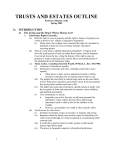 TRUSTS AND ESTATES OUTLINE Professor Melanie Leslie Spring 2005 I) INTRODUCTION A) The Living and the Dead: Whose Money Is it? 1) Inheritance Rights Generally: (a) Both the right to receive property and the right to dispose of property are rooted in positive law, subject to legislative adjustment (i) Many states, for example, have restricted the right of a decedent to disinherit at least one class of family member- decedent’s surviving spouse (b) What if a state tried to abolish inheritance altogether? Congress tried this with small parcels of land on Indian Reservations, but the Supreme Court struck down the law, citing the history of the right to pass on property in Anglo-American times and the likely unconstitutionality of the abolishment of all inheritance rights (c) Mark Ascher, Curtailing Inherited Wealth, 89 Mich, L. Rev. 69 (1990) (i) American is founded on equality (ii) Inheritance is basically just luck- curtailing could lead to more equality Other forms of luck, such as natural born talent or ability, cannot be controlled, but we should control what we can (iii) The people the most likely to inherit large sums are the most likely to have been given education and cultural values from their parents, thus giving them another head start in life. (iv) The author advocates that all property should escheat at death, with the exception of debts and protection for spouses, minor children, and disabled descendents (v) Text commentary on article: Inequality may not be the only social harm generated by inheritance- many express the fear that a future large inheritance leads to sloth in life for the children of the wealthy However, accumulation of wealth is often a family effort (d) Justifications for Inheritance (i) Freedom of testation creates an incentive to industry and saving (ii) Bequests within the family may actually repay the beneficiary for value received (though not value recognized as consideration under common law) (iii) It would be in practice hard to curtail- people would transfer money right before death (iv) The power to bequeath comports with political preferences 1 (v) (e) (f) Allowing people to bequeath encourages industry- if there was no inheritance, people would work less, because there would be less of a reason for them to accumulate property (vi) People might just engage in more consumption if inheritance were curtailed- which might lead to more inequality than inheritance (vii) Part of bundle of p-property rights to have autonomy to decide where your property goes (viii) Handing down property within a family has symbolic meaning (ix) Not having inheritance increases risky and stupid consumption right before you die (x) Why do we trust the federal government to be better at managing this money? Arguments against Inheritance (i) Life Cycle Hypothesis: devises are accidental- the result of risk adversity in the face of uncertainty about one’s future needs and future date of death Policy Concerns (i) Shapiria case (father required his son to marry a Jewish girl in order to inherit) This is really just restricting his right to the land, not the right to marry Parents can disinherit any child, including dependant minor child (unique in US) The son argued that he had a constitutional right to marry, but this is not true- this is a will, not a state argument The son also argued that the state was acting because the court was getting involved with enforcing the provision Court rejects this, saying that just allowing a valid will to stand is not perpetuating the underlying provisions of the will What if the will said that the son had to divorce his current wife? If you carry the arguments to their logical conclusion then a court would have to let this provision stand. However, here public policy concerns would probably outweigh the desires of the testator What if the dad had given him a choice of five women to marry This would probably not be allowed on public policy concerns- too oppressive (ii) Protection of spouses There is spousal property protection in every state Normally in a separate property state the spouse does not get the value of her contribution of all the land is in her husband’s name. However, statutory contributions prevent the husband from willing the land to his mistress 2 2) Murder and Inheritance (a) Ford v. Ford: (MD 1986): P murdered her mother, M. P’s son argues that P may not inherit under M’s will and argues that he should inherit as the alternate beneficiary. However, although the crime was both intentional and felonious, P was not criminally responsible at the time of the crime. She was found guilty of the crime but insane. (i) Rule: A person who kills another in a felonious and intentional manner may not share in decedent’s estate through either will or intestate distribution, nor may such a person benefit under a life insurance policy. (ii) Rule: A person may benefit from a will, etc if the killing is unintentional even if it is the result of gross negligence which would render the killer guilty f involuntary manslaughter. (iii) Rule: Anyone claiming through or under the killer is also not entitled to inherit. (iv) Rule: The slayer’s rule is not applicable when the killer was not criminally responsible at the time he committed the homicide. Reasoning: Based on principles of equity, justice, morality, and on a broad ground of the public policy of the common law Reasoning: A person who has a mental disorder does not act with unfettered will Reasoning: A killing is not felonious unless the killer can be held criminally responsible under the state insanity test. (b) Rationales for slyer laws (i) Deterrent effect Does it make sense to distinguish between voluntary and involuntary manslaughter for deterrent effect? (As MD court does) On the one hand both are manslaughter On the other hand, if the murder is totally accidental, you lose the connection with the outcome anyway (ii) Effectuate intent of dying If we care about intent do we re