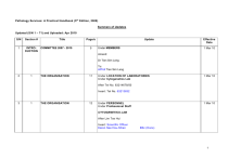 Pathology Services: A Practical Handbook (5 th Edition, 2008) Summary of Updates Updated (S/N 1 – 71) and Uploaded: Apr 2010 S/N Section # 1 INTRODUCTION Title COMMITTEE 2007 - 2010 Page/s 5 Update Under MEMBERS Effective Date 1 Mar 10 Amend: Dr Tien Sim Leng To: A/Prof Tien Sim Leng 2 1 THE ORGANISATION 11 Under LOCATION OF LABORATORIES Under Cytogenetics Lab 1 Mar 10 After Tel No. 63214678/50 Insert: Tel No. 63213632 3 1 THE ORGANISATION 12 Under PERSONNEL Under Professional Staff 1 Mar 10 CYTOGENETICS LAB After Lim Tse Hui Insert: Scientific Officer Karen See Hsu-Shien BSc (Hons) 1 4 1 THE ORGANISATION 14 Under PERSONNEL Under PROFESSIONAL STAFF 1 May 08 MOLECULAR LAB Amend: Head & Consultant Dr Lynette Oon Lin Ean BSc (Hons), MBBS, MRCP, FRCPA Senior Scientific Officer Dr Eileen Chen Xueqin B.Med, PhD Scientific Officer Ms Lim Kun Lee BSc (Hons), MSc To Head & Senior Consultant Dr Lynette Oon Lin Ean BSc (Hons), MBBS, MRCP, FRCPA Principal Scientific Officer Dr Eileen Chen Xueqin B.Med, PhD Senior Scientific Officer Ms Lim Kun Lee BSc (Hons), MSc 2 5 2 LABORATORY POLICIES & SERVICE INFORMATION 23 Under EXTERNAL QUALITY ASSESSMENT PROGRAMMES 1 Jan 2010 Under Molecular Delete : QCMD Toxoplasma gondii 6 2 LABORATORY POLICIES & SERVICE INFORMATION 25 Amend : CAP CMV and EBV Viral Load 2/year To CAP BKV, CMV and EBV Viral Load 2/year Insert: CAP HLA-B27 Typing Survey CAP EGFR CAP KRAS QCMD (JC virus and BK virus) QCMD (B19 virus DNA) QCMD (CMV DNA) QCMD (HHV6 DNA) QCMD (EBV DNA) QCMD (Clostridium difficile DNA) 2/year 2/year 2/year 1/year 1/year 1/year 1/year 1/year 1/year Under OPERATING HOURS 1 Apr 2010 Under OFFICE HOURS Delete Monday to Friday Saturday 8.30am - 5.30pm (Molecular Lab) 8.30am – 1.00pm (Molecular Lab) (The Molecular Laboratory will be following the same opening hours of the Department.) 3 7 4 SAMPLE COLLECTION & HANDLING – SPECIAL INSTRUCTIONS, LABORATORY TESTS, REFERENCE VALUES & TEST RESULTS: Biochemistry 70 Under CALL-BACK VALUES OF CRITICAL ANALYTES 18 Feb 10 Amend: Potassium Sodium Calcium Glucose pH (blood gas) Blood Ketone Digoxin Theophylline Paracetamol Salicylate Lithium <2.5 or <120 or <1.75 or <2.0 or <7.1 or >1.4 >2.5 >25.0 all results all results 2.0 >5.7 >160 >3.25 >25.0 >7.6 To Potassium Sodium Calcium Glucose pH (blood gas) Calcium,Ionic Blood Ketone Digoxin Theophylline Paracetamol Salicylate Lithium <2.5 or <120 or <1.75 or <2.5 or <7.1 or <0.80 or >1.4 >2.5 >25.0 all results all results >2.0 >5.7 >160 >3.25 >25.0 >7.6 >1.60 mmol/L mmol/L mmol/L mmol/L mmol/L mg/L mg/L mg/L mmol/L mmol/L mmol/L mmol/L mmol/L mmol/L mmol/L mmol/L mg/L mg/L mg/L mmol/L mmol/L 4 8 SAMPLE COLLECTION & HANDLING – SPECIAL INSTRUCTIONS, LABORATORY TESTS, REFERENCE VALUES & TEST RESULTS: Biochemistry 72 Under ALPHAFOETO PROTEIN (AFP) FRACTION 3 01 Jan 10 Amend: Reference interval : > 12 years: 0 – 14.9% : > 12 years: <10% To Reference interval 9 SAMPLE COLLECTION & HANDLING – SPECIAL INSTRUCTIONS, LABORATORY TESTS, REFERENCE VALUES & TEST RESULTS: Biochemistry 85 Under EVEROLIMUS, BLOOD 02 Nov 09 Amend: Method : Immunoassay To Method 10 SAMPLE COLLECTION & HANDLING – SPECIAL INSTRUCTIONS, LABORATORY TESTS, REFERENCE VALUES & TEST RESULTS: Biochemistry 88 : Liquid Chromatography/Tandem Mass Spectrometry Under HOMOCYSTEINE,PLASMA 16 Mar 10 Amend: Method : Colorimetry : Immunoassay To Method 5 11 SAMPLE COLLECTION & HANDLING – SPECIAL INSTRUCTIONS, LABORATORY TESTS, REFERENCE VALUES & TEST RESULTS: Biochemistry 94 Under METANEPHRINE,URINE 25 Feb 10 Amend: Reference Interval : : 3 – 8 years: 26-137 nmol/mmol creatinine 9 – 19 years: 18-126 nmol/mmol creatinine : : 3 – 8 years: 27-138 nmol/mmol creatinine 9 – 19 years: 19-126 nmol/mmol creatinine To Reference Interval 12 SAMPLE COLLECTION & HANDLING – SPECIAL INSTRUCTIONS, LABORATORY TESTS, REFERENCE VALUES & TEST RESULTS: Biochemistry 98 Under NORMETANEPHRINE,URINE 25 Feb 10 Amend: Reference Interval : : 3 – 8 years: 38-434 nmol/mmol creatinine 9 – 19 years: 28-359 nmol/mmol creatinine : : 3 – 8 years: 38-435 nmol/mmol creatinine 9 – 19 years: 29-360 nmol/mmol creatinine To Reference Interval 6 13 4 SAMPLE COLLECTION & HANDLING – SPECIAL INSTRUCTIONS, LABORATORY TESTS, REFERENCE VALUES & TEST RESULTS: Cytogenetics 122 After ‘CHROMOSOME ANALYSIS OF SOLID TUMOURS’ 1 Mar 10 [effect is to move the entry from pg 130-131 to pg122] Insert: RAPID PRENATAL ANEUPLOIDY SCREENING, DOWN SYNDROME SCREENING AND SEX CHROMOSOME DETERMINATION WITH FLUORESCENCE IN SITU HYBRIDIZATION TEST Common indications : Advanced maternal age (≥ 35 years at EDD), Abnormal ultrasound findings, Positive maternal serum screening, Previous history of chromosome abnormality, Family history of Down syndrome, Parental anxiety Special instructions : This FISH test is usually requested in conjunction with conventional cytogenetic studies. Sample required : Amniotic fluid (3 mL), chorionic villi (5 mg), or fetal cord blood/neonate blood (0.5 mL) Method : Chromosome analysis as with Amniotic Fluid/Chorionic Villi or Fetal Cord Blood/Neonate Blood FISH assay using LSI 13 and 21, and CEP X, Y, and 18 DNA probes labelled with fluorophores are analysed under fluorescence microscopy. Test results : Normal or Abnormal, with the abnormalities listed. Findings are reported in accordance to the InternationalSystem for Human Cytogenetic Nomenclature (ISCN, 2009). Reference values : Individuals with a trisomy will show three signals of a particular DNA probe. Normal individuals will show two signals of each DNA probe. Females will show two signals of the X probe, males one signal of the X and Y probe each. Turnaround time : Within 3 days Day(s) test set up : Monday – Friday (office hours) 7 14 4 SAMPLE COLLECTION & HANDLING – SPECIAL INSTRUCTIONS, LABORATORY TESTS, REFERENCE VALUES & TEST RESULTS: Cytogenetics 122 After RAPID PRENATAL ANEUPLOIDY SCREENING, DOWN SYNDROME SCREENING AND SEX CHROMOSOME DETERMINATION WITH FLUORESCENCE IN SITU 