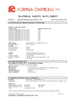 MATERIAL SAFETY DATA SHEET PRODUCT: SODIUM HYDROXIDE SOLUTIONS 20 - 60% Date of Issue: December 2010 1. IDENTIFICATION OF CHEMICAL PRODUCT AND SUPPLIER PRODUCT IDENTIFICATION: Product Names: SODIUM HYDROXIDE 20% W/W SOLN SODIUM HYDROXIDE 25% W/W SOLN SODIUM HYDROXIDE 30% W/W SOLN SODIUM HYDROXIDE 40% W/W SOLN SODIUM HYDROXIDE 42% W/W SOLN SODIUM HYDROXIDE 46% W/W SOLN SODIUM HYDROXIDE 50% W/W SOLN SODIUM HYDROXIDE 60% W/V SOLN Supplier’s Product Code 2507 2506 2505 2504 2503 2502 2501 2509 Other Names: Recommended Use: Formula: Molecular formula Structural formula Chemical family Liquid Caustic soda, Sodium hydrate, Lye General chemical Supplier: Address: Telephone Number: Emergency Telephone: ACN: Formula Chemicals (N.S.W.) Pty Ltd 86 Hermitage Rd West Ryde NSW 2114 (02) 9807 4266 (02) 9807 4266 or Poisons Information 131126 001 129 406 H-Na-O NaOH Alkali hydroxide 2. HAZARDS IDENTIFICATION HAZARDOUS SUBSTANCE. DANGEROUS GOODS Classified as hazardous according to the criteria of NOHSC. C+ Very corrosive, Hazard Category: R35 Causes severe burns, R41 Risk of Serious damage to eyes Risk phrases: S2 Keep out of reach of children S26 Safety phrases: Schedule 6 SUSDP Classification: Class 8 Corrosive ADG Classification: 3. COMPOSITION/INFORMATION ON INGREDIENTS Synonyms: Caustic soda, Sodium hydrate, Lye Appearance: Water white, slightly hazy solution. More concentrated solutions are slightly viscous. Ingredients: Chemical Name, CAS No Sodium hydroxide 1310-73-2 Water Proportion 20 - 60 % to make total of 100% Risk Phrases R35, R41 All the constituents of this material are listed on the Australian Inventory of Chemical Substances (AICS) SECTION: QAP 501 ISSUE: A REV: 1 FORMULA CHEMICALS(NSW) PTY LTD Page 1 of 5 FORMULA CHEMICALS(NSW) PTY LTD SODIUM HYDROXIDE SOLUTIONS 20 - 60% Date of Issue: December 2010 4. FIRST AID MEASURES Poison Information Centres in each state can provide additional assistance for scheduled poisons. Phone 131126 from anywhere in Australia Ingestion: Never give anything by mouth if victim is rapidly losing consciousness, or is unconscious or convulsing. Rinse mouth thoroughly with water. Do not induce vomiting. If victim can swallow, have him/her drink 250 to 300 mL of water to dilute material in stomach. If vomiting occurs naturally, have victim lean forward to reduce risk of aspiration. Repeat administration of water. Obtain medical attention immediately. Eye Contact: Immediately flush the contaminated eye(s) with lukewarm, gently flowing water for 30 minutes, by the clock, holding the eyelid(s) open. Take care not to rinse contaminated water into the non-affected eye. If irritation persists, repeat flushing. If available, a neutral saline solution may be used to flush the contaminated eye(s) an additional 30 minutes. Obtain medical attention immediately. Skin Contact: First aiders avoid direct contact with this chemical. As quickly as possible, flush contaminated area with lukewarm, gently running water for at least 30 minutes, by the clock. Under running water, remove contaminated clothing, shoes, and leather goods (e.g. watchbands, belts). If irritation persists, repeat flushing. Obtain medical attention immediately. Completely decontaminate clothing, shoes and leather goods before re-use or discard. Inhalation: Remove source of contamination or move victim to fresh air. Obtain medical advice immediately. Other First Aid: Provide general supportive measures (comfort, warmth, rest). Consult a physician and/or the nearest Poison Control Centre for all exposures except minor instances of inhalation contact. Notes to physician: Treat symptomatically as for strong alkalis. 5. FIRE FIGHTING MEASURES Specific hazards: Non-combustible material Fire fighting further advice: Not combustible. Can react with some metals generating flammable hydrogen gas. Contact with some organic chemicals can produce violent or explosive conditions. Suitable Extinguishing media: Water fog (or if unavailable fine water mist or spray), foam, dry agent (carbon dioxide, dry chemical powder) 6. ACCIDENTAL RELEASE MEASURES Small Spills: Wear personal protective equipment. Contain using sand or diatomaceous earth. Collect and seal in properly labeled drums. Wash remaining area with large volumes of water. Large Spills: PRECAUTIONS Restrict access to area. Clear area of unprotected personnel. Provide adequate protective equipment and ventilation. Remove chemicals which can react with the spilled material. Spills are slippery. CLEANUP Contain spill or leak. Do not allow entry into sewers or waterways. Neutralise the final traces and flush area with water. Spilled solutions should be contained by dyking with inert material, such as sand or earth. Solutions can be recovered or carefully diluted with water and cautiously neutralised with acids such as acetic acid or hydrochloric acid. DISPOSAL Federal, state and local regulations should be reviewed prior to disposal. May be possible to neutralise, dilute and flush the material into a sewer. May be possible to atomise dilute solutions in an approved combustion chamber. Harmful to aquatic life in high concentrations. 7. HANDLING AND STORAGE HANDLING Avoid generating mist or spray. When diluting solution, add sodium hydroxide to water in small amounts. Label containers. Keep containers closed when not in use. Empty containers may contain residues which are SECTION: QAP 501 ISSUE: A REV: 1 FORMULA CHEMICALS(NSW) PTY LTD Page 2 of 5 FORMULA CHEMICALS(NSW) PTY LTD SODIUM HYDROXIDE SOLUTIONS 20 - 60% Date of Issue: December 2010 hazardous. Use smallest possible amounts in designated areas with adequate ventilation. Have emergency equipment (for fires, spills, leaks, etc.) readily available. STORAGE CONDITIONS Materials that react violently with sodium hydroxide should not be stored in the same area. Use corrosion-resistant structural materials and lighting and ventilation systems in the storage area. Store in suitable labelled containers. Keep containers tig