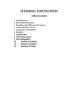 AP Chemistry: Total Notes Review Table of Contents 1. Stoichiometry 2. Electronic Structure 3. Bonding and Molecular Structure 4. Intermolecular Forces 5. Properties of Solutions 6. Kinetics 7. Equilibrium 8. Thermodynamics 9. Electrochemistry 10. Nuclear Chemistry 11. Organic Chemistry 12. Reaction Writing #1: STOICHIOMETRY o Found in Chapters 3 and 4 of the textbook o Limiting Reactants: divide # moles by whole number coefficients – the smallest is the limiter (use that to find the resulting moles of product) o 4 basic steps: 1: write the balanced chemical equation 2: convert to moles 3: use the mole: mole ratio 4: convert to asked for units But that’s for easy stuff like, “determine the number of [moles/grams/liters/etc.] in [substance] for [number and units] of [element] according to the equation below” If you want to get to the really hard-core stuff, look at” Empirical Formulas and Analyses This stuff tells you what the empirical formula of a reactant is based on its products. For example: “Ascorbic Acid contains 40.92% H and 54.50% O by mass. What is the empirical formula of ascorbic acid?” How to Solve: 1. Assume that there’s a 100g sample of the substance (that means that the percents equal their mass) 2. convert samples to moles 3. divide each by the smallest number of moles 4. make a ratio 5. use the ratio to write the equation Take a Look: Sometimes with analysis, you have to find the molecular formula. That’s like the empirical formula, but it’s not in its lowest ratio. For example: “Mesitylene, a hydrocarbon that occurs in small amounts in crude oil, has an empirical formula of C3H4. The experimentally determined molecular weight of this substance in 121 amu. What is the molecular formula of mesitylene?” How to Solve: 1. find the empirical formula weight (use the formula given in the question) 2. put numbers into the equation whole # multiple = molecular mass / empirical mass 3. solve 4. multiply subscripts by whole numbers Take a Look: It’s important to remember that chemistry doesn’t always do the problems the way examples show them. Most of the time you have to manipulate equations and whatnot using the techniques you learn from the examples. Look out for questions that combine these two concepts or otherwise flip them around. Combustion Analysis This is a lot like the two things above, but it’s different at the same time (that’s chem. For you). Okay, here’s what it is: the question will tell you the products of the combustion of usually a hydrocarbon (there are about a million different kinds, so be prepared. Oh, and look at the organic chem. Chapter if you don’t believe me). For example: “Isopropyl alcohol, a substance sold as rubbing alcohol, is composed of C, H, and O. Combustion of 0.255g of isopropyl alcohol produces 0.561g of CO2 and 0.306g of H2O. Determine the empirical formula of isopropyl alcohol.” How to Solve: 1. Find the mass of C and H in the substance: i. convert CO2 and H2O to moles ii. use mol: mol ratios to isolate C and H iii. change moles to grams 2. subtract the mass of C and H from the total mass to find the mass of O 3. convert grams to moles 4. divide by the smallest Take a Look: Limiting Reactants Might as well do one of these so you don’t screw it up on the test. These have a reactant that limits the amount of product produced because one of the reactants runs out. For example: “A 55.8g sample of pure iron is submerged in a solution containing 339.0g of silver nitrate. Fe(NO3)3 and solid silver are the products. a) write the balanced chemical equation b) determine the limiting reactant c) determine the moles of each product produced d) determine the mass of excess reactant remaining” How to Solve: 1. write the balanced chemical equation 2. convert reactants to moles 3. find the limiter (divide # of moles by the coefficient and the smallest is the limiter) 4. use the limiter in an I.C.E. table to find the moles of products and excess reactant remaining 5. convert to units Take a Look: Theoretical Yeilds The quantity of product that is calculated to form when all of the limiting reactant reacts is the theoretical yield. The amount that actually reacts is the actual yield. Percent yield = actual amount / theoretical yield x 100 It’s not too hard, so we won’t do an example. Solution Stoichiometry (AKA: titrations) Use this to determine how much (volume or concentration) of a particular ion there is in a solution. Equivalence point: pretty much the most important part of a titration, it’s when the moles of “A” equal the moles of “B.” It’s also called the “neutralizing point.” Use the same steps as every other stoich. problem to solve these (they just look scarier). For example: “A sample of iron ore is dissolved in acid, and the iron is converted to Fe+2 . The sample is titrated with 47.20 mL of 0.02240 M MnO4- solution. The oxidation-reduction reaction that occurs during the titration is as follows: a) b) c) d) how many moles of MnO4- were added to the solution? How many moles of Fe+2 were in the solution? How many grams of iron were in the sample? If the sample had a mass of 0.8890g, what is the percentage of iron in the sample? How to Solve: Use the basics: 1. use the balanced equation 2. convert to moles (MnO4-) 3. use mol to mol ratio (Fe+2) 4. convert to units Take a Look: #2: ELECTRONIC STRUCTURE o chapters 6: Electronic Structure of Atoms Terms to Know: o Electromagnetic Radiation (radiant energy): moves through a vacuum at the speed of light (c = 3 x 108) Includes: Gamma rays, X rays, Ultraviolet, visible light, infrared, microwaves, and radio frequency o Electronic structure: describes the energies and arrangements of electrons around an atom Electrons behave as both particles and waves (wavicles) o Wave characteristics described with wavelength (λ) and frequency (ν) λxν=c o Photon: wavicle o h = Planck’s constant (6.62 E -34 J/s) o quantum theory: energy is quantize