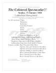 The Pinto Horse Association of NSW Inc Proudly Presents The Coloured Spectacular!! Sunday, 31 January 2010 Luddenham Showground Coloured Rings and Beginner / Intermediate Rings commence at 8:30am. Open Hack ring to commence at 10am. For all registered: Pintos Palominos Buckskins Cremellos/Perlinos Roans Paints Appaloosas Palouse Coloured Ponies ne 10.2h Including Open Pony, Galloway and Hacks Show Hunter Pony/Galloway /Hacks Beginners Ring open to all breeds of horses Intermediate Ring Open to all breeds of horses Features include: Best Presented of the Show Supreme Jnr Led Coloured of the Show Supreme Snr Led Coloured of the Show Supreme Ridden Coloured of Show Best Coloured Broodmare of the Show Best Coloured Foal of the Show Best Coloured Novice of the Show Gate Fee $5 per Vehicle For more information contact: $3.50 per class Julie Arapa 0432598301 info@pintonsw.com 1 Rules & Regulations 1) Exhibits entered in breed classes must be registered with the relevant breed society and produce proof of registration on request. Pintos must be registered with Pinto Horse Association of NSW Inc., Buckskins must be registered with Buckskin Horse Association of NSW. 2) The decision of the judge is final. No discussion will be entered into. 3) Stallions may compete in Pony- Galloway and Hack rings and Show Hunter Classes, however must be ridden or handled by a person 18 years of age or over at all times. Under no circumstances will a Stallion be permitted in the Beginner or Intermediate Ring. 4) Pony, Galloway, Hack, Intermediate and Beginner classes are open to all horses, not only those registered with a coloured breed society. 5) A Novice Horse, is a horse who while competing singularly, has not won at an Agricultural Show. A Novice Pinto is a horse which has not won a 1st place at an “A” class Show. 6) An Intermediate Horse, is a horse who while competing singularly, has not placed 1st, 2nd or 3rd in a similar class at any Royal Show. 7) Ponies / Galloways / Hacks may only compete in one of the following: Childs Pony/ Galloway/ Hack or Adults Pony / Galloway/ Hack. 8) Hacks can only compete as a Hack and are not permitted to go in the Show hunter classes. 9) Show Hunters can only compete as a Show Hunter and are not permitted to compete as a hack. 10) Horses entered in the Coloured hack classes must be registered with the relevant colour breed society, ie. Pintos, Palominos, Buckskins etc. 11) Riders and Handlers competing in the Beginner and Intermediate Ring are ineligible to compete in any other ring. Horses used in the Beginner Ring may also compete in another ring provided that they are not handled or ridden by a person competing in the Beginner or Intermediate Ring. 12) All riders and handlers MUST sign an indemnity waiver and wear the armband provided at all times while competing. If not insured under the EFA or its affiliates a fee of $20 will apply. Proof of membership will be required. 11) All riders must wear boots and regulation approved safety helmets in all classes including novelty, beginner and handler classes. 2 All Coloured Rings to commence at 8:30am 26 27 Ring One Pintos (must be registered Pinto Horse 28 Association of NSW Inc) A Class points 29 01 02 03 04 05 06 07 08 09 10 11 12 13 14 15 16 17 18 19 20 21 22 23 24 25 Best Presented Pinto (winner eligible for best presented of show) Best Marked Pinto Led Yearling Colt Led Colt 2 yrs Led Colt 3 yrs Champ & Reserve Jnr Colt Led Yearling Filly Led Filly 2 yrs Led Filly 3 yrs Champ & Reserve Jnr Filly Led Yearling Gelding Led Gelding 2 yrs Led Gelding 3 yrs Champ & Reserve Jnr Gelding Supreme Jnr Horse (winner eligible to compete for Supreme Jnr of Show) Led Stallion 4yrs & under 6yrs Led Stallion 6 yrs & over, not exceeding 14h Led Stallion 6yrs & over, over 14h Champ & Reserve Snr Stallion Led Mare 4yrs & under 6yrs Led Mare 6 yrs & over not exceeding 14h Led Mare 6yrs & over, over 14h Champ & Reserve Snr Mare Led Broodmare (winner eligible for Best Broodmare of the show) Led Foal any sex (winner eligible for Best Foal of the show) 30 31 32 33 34 35 36 37 Led Gelding 4 yrs & under 6yrs Led Gelding 6yrs & over, not exceeding 14h Led Gelding 6 yrs & over, over 14h Champ & Reserve Snr Gelding Supreme Snr Horse (winner eligible to compete for Supreme Snr of Show) Novice Ridden Pinto (winner eligible to compete for best ridden novice) Ridden Stallion Ridden Mare ne 14h Ridden Mare over 14h Ridden Gelding ne 14h Ridden Gelding over 14h Champ & Reserve Ridden Pinto (winner eligible for Supreme ridden Coloured) Ring 2 Palominos & Coloured Horse / Ponies ne 10.2h Palominos 38 Best Presented Palomino (winner eligible for Best Presented of Show) 39 Best Mane and Tail 40 Best Coat Colour 41 Led Yearling Colt 42 Led Colt 2 yrs 43 Led Colt 3 yrs 44 Champ & Reserve Jnr Colt 45 Led Yearling Filly 46 Led Filly 2yrs 47 Led Filly 3 yrs 48 Champ & Res Jnr Filly 49 Led Yearling Gelding 50 Led Gelding 2 yrs 51 Led Gelding 3 Yrs 52 Champ & Reserve Jnr Gelding 3 53 54 55 56 57 58 59 60 61 62 63 64 65 66 67 68 69 70 71 72 Supreme Jnr Horse (winner is eligible for Supreme Jnr of Show) Led Stallion 4yrs & under 6yrs Led Stallion 6yrs & over not exceeding 14h Led Stallion6yrs & over, over 14h Champ Led Snr Stallion Led Mare 4yrs & under 6yrs Led Mare 6yrs & over, not exceeding 14h Led Mare 6yrs & over, over 14h Champ & Res Snr Mare Led Broodmare (winner eligible for Best Broodmare of the show) Led Gelding 4yrs & under 6 yrs Led Gelding 6 yrs & over, not exceeding 14h Led Gelding 6yrs & over, over 14h Champ & Res Snr Palomino Supreme Led Palomino (winner eligible to compete for Supreme Snr Horse of Show) Novice Ridden Palomino (winner eligible to compete for best ridden novice of the show) Ridden Stallion Ridden Mare Ridden Gelding Champ & Reserve Ridden Palomino (winner eligible for Supreme Ridden Coloured of the Show) Coloured Ponies ne 10.2h 73 Best Presented Coloured Pony ne 10.2h (winner eligible for Best Presented of the show) 74 Led Coloured 