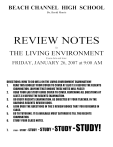 BEACH CHANNEL HIGH SCHOOL Dr. David Morris REVIEW NOTES for THE LIVING ENVIRONMENT Exam date and time: FRIDAY, JANUARY 26, 2007 at 9:00 AM DIRECTIONS: HOW TO DO WELL ON THE LIVING ENVIRONMENT EXAMINATION! 1. READ THIS BOOKLET FROM COVER TO COVER AT LEAST 3 X BEFORE THE REGENTS EXAMINATION. (ANYONE THAT KNOWS THESE NOTES WILL PASS!) 2. READ YOUR LAB STUDY GUIDE COVER TO COVER, REVIEWING ALL QUESTIONS AT LEAST 3 X BEFORE THE REGENTS EXAMINATION. 3. DO EVERY REGENTS EXAMINATION, AS DIRECTED BY YOUR TEACHER, IN THE BARRONS REGENTS REVIEW BOOK. 4. LOOK OVER THE QUESTIONS IN THE 3 REVIEW BOOKS THAT YOU REVIEWED IN CLASS. 5. GO TO TUTORING. IT IS AVAILABLE MOST SATURDAYS TILL THE REGENTS EXAMINATION. 6. STUDY YOUR CLASS NOTES. 7. STUDY - STUDY - STUDY - STUDY - STUDY - STUDY! Topic 1A Characteristics of Life Areas Stressed On Past Regents Exams A. All living things have similar characteristics which we use to define life. Living things • are made up of cells (basic unit of structure and function of all organisms). • have a metabolism (all chemical activity in the body). • maintain homeostasis (Internal environment stays within limits even when external environment changes). • reproduce (Make more like themselves). Topic 1B Cells and Organelles Areas Stressed On Past Regents Exams A. All cells have smaller structures called organelles. The main organelles are: Organelle Function Important information Nucleus (N) Contains DNA which is used during cell reproduction (mitosis) and protein synthesis. When the cells undergoes mitosis, the DNA makes an exact copy of itself so each daughter cell has identical DNA. Messenger molecules made in the nucleus carry instructions to the ribosomes directing them to make specific proteins. Ribosome (R) Site of protein synthesis They are very small, often represented by dots. Amino acid molecules are combined to make proteins. Mitochondria (M) Sites of cellular respiration (production of ATP). It contains respiratory enzymes. Can be identified easily by looking for the internal walls which increases surface area for enzyme action. Cells that have a high energy requirement, such as muscle cells, have many mitochondria. Chloroplasts (C) Site of Photosynthesis. Only in plants and other autotrophic organisms (can make own food). Vacuoles (Three types) Storage (SV) Stores materials. Food (FV) Food digestion by enzyme action. Contractile (CV) Removes excess water. Cell Membrane (CM) Separates cell from external environment. Helps regulate what comes into and out of the cell. It is made up of a double lipid layer with scattered embedded protein molecules. It contains receptors which allows cells to communicate by molecules. Cell Wall (CW) Strong structure which protects and gives support to plant cells Not really an organelle because no chemical activity occurs here. Found in plants and fungi. ©2006 Gregory Arnold - Study Guide Notes Page: 2 B. The cell organelles need one another to function properly. Examples how they function together include: Food vacuoles break down food into small molecules such as amino acids and glucose, a simple sugar. The ribosomes use the amino acids to synthesize new proteins and the mitochondria break down the sugar molecules to make ATP, a high energy molecule. The cell membrane allows the movement of Carbon dioxide (CO2), water (H2O) and oxygen (O2) into the plant cell. In the presence of sunlight, the chloroplast uses the CO2 and H2O to make glucose (C6H12O6). The mitochondria uses the glucose and oxygen to make ATP. The nucleus controls the production of proteins by sending a messenger molecule to the ribosome which causes the ribosome to assemble the amino acids in a specific sequence to make the new protein. The mitochondria produces ATP, the form of energy necessary for living things. This ATP allows the movement of molecules through the cell membrane by active transport. ATP is also used by the contractile vacuole to pump excess water from a fresh water protozoan. Topic 1C The Cell Membrane Areas Stressed On Past Regents Exams A. Substances or molecules must be able to move through membranes: The rate the molecules can move through the membrane is determined by: • Surface area of the membrane. The greater the surface area, the greater the quantity of substances can pass through the membrane at the same time. • The size of the molecule. Small molecules - move fast through cell membrane Medium molecules - move slower through membrane Large molecules usually are unable to move through the cell membrane Water H2O Oxygen O2 Carbon Dioxide CO2 Minerals (I, Fe, Na, Cl, K etc.) Glucose (C6H12O6 ) Amino acids Proteins Starches DNA • Method of transport Diffusion - Requires no energy - molecules move from a region of greater concentration to a region of lower concentration. Water is moving into the fresh water ameba pictured below. Note: this is the way most molecules move through membranes. Active Transport - Energy in the form of ATP is used to move molecules from areas of low concentration to regions of greater concentration. To prevent the ameba below from exploding, excess water is "pumped out" by the contractile vacuole. ©2006 Gregory Arnold - Study Guide Notes Page: 3 - Note: On the regents, the concentration of a substance is often represented by the number of dots or molecular formulas. The greater the number, the greater the concentration. In this example, the substance represented by the dots could only move into the cell by active transport. If the substance is a small molecule, it could move out of the cell by diffusion. (If it is a large molecule, the cell membrane would prevent it from moving out of the cell by diffusion.) - In this example, the substances are represented by the molecular formulas. Carbon dioxide (CO2) would move outside the cell by diffusion and oxygen (O2) would move into the cell by diffusion. • Plasmolysis, a special case of diffusion that occurs when a living thing that does not normally l