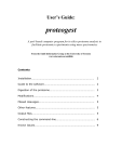 User’s Guide: proteogest A perl-based computer program for in silico proteome analysis to facilitate proteomics experiments using mass spectrometry From the Emili Informatics Group at the University of Toronto www.utoronto.ca/emililab Contents Installation…………………………………………………………………………………… 2 Guide to the software………………………………………………………………….. 2 Digestion of the proteome…………………………………………………………… 3 Modifications…………………………………………………………………………....... 4 Missed cleavages…………………………………………………………………………. 5 Other features…………………………………………………………………………..... 5 Output files…………………………………………………………………………………… 5 Constructing the command-line…………………………………………………… 6 Known Issues………………………………………………………………………………… 9 2 Installation proteogest is designed to work on both the Windows and the Unix platforms. In order to run proteogest, you must install Perl. downloaded from www.activestate.com. www.perl.org Perl can be or Install proteogest in the same directory as Perl. Your output files will also appear in the same directory. Your input file will be the proteome of the particular species of interest and it must be in FASTA format. If your file is not in FASTA format, you can convert it to FASTA using various proteomics tools available on the web. Your FASTA input file must be in the same directory as proteogest . Guide to the Software proteogest is designed for use in science laboratories, more specifically in proteomics, bioinformatics, and genomics research. This software allows the analysis of an entire proteome of a species. It provides insight on three levels: the proteome, the proteins, and the peptides of the species. Various statistics are provided for all three levels. proteogest takes every protein of the specified proteome, one by one, and digests the proteins at the specified cleavage criteria (amino acids or sequences of amino acids specified by the user) into peptides. Various options are available to the user for specifying digestion, missed cleavages, wildcards, modifications, length, and redundancy. 3 Digestion of a proteome In order to run proteogest on the proteome (fasta file) of your choice, the command line arguments must be correctly provided by the user. The user can choose to digest the proteome using one or a combination of enzymes. The user may also specify a particular pattern of digestion desired in the text box at the bottom of the left column. proteogest is very flexible in digesting the proteome. Any pattern can be specified, as long as the program can understand and read it correctly. It is important that you place an “X” where you want the digestion to take place. This quality provides another level of flexibility because the proteome can be digested before or after a certain pattern i.e. XST vs. STX. Different patterns i.e. XST, XGGK specified for the digestion of the proteome, must be separated by commas, ensure that you do not leave any spaces between different patterns. Trypsin digestion can be carried out by using the word ‘trypsin’ for the digestion criteria (i.e. –c trypsin). Another added feature for digestion is the use of wildcards indicated by the letter ‘Z’. When you make use of this feature, every amino acid will be substituted in place of the Z for digestion. For example if you wish to digest at AZ, (Z being the wildcard) proteogest will digest your proteome at AA, AC, … , AY. You can include several wildcards into your digestion sequence(s). i.e. RK, AZ, KZM If you decide to specify a string of amino acids for digestion, the correct format must be followed, or the program will not understand your instructions, and you will get an error. Here are the two rules that must be followed when specifying the cleavage criteria: 1) Place “X” where you want the proteins to be digested. i.e. XK 2) Separate patterns with commas, if you choose to digest the proteome at more that one pattern of amino acids. i.e. XK,RX – this will digest the proteins before every K and after every R. You may want to digest your proteome at a specific location in a sequence of amino acids, in which case the same rules apply. i.e. FAX,XRE – this will digest the proteins after every ‘FA’ and before every ‘RE’. 4 Modifications Modifications to the proteome can be specified. of modifications: There are four types 1) Phosphorylation on serines, or threonines, or tyrosines, or all of them together. Phosphorylation will add 80.00 to the isotopic and average masses of the peptides that have the respective amino acids. 2) An ICAT modication adds pairs of masses (415.5 and 423.5 a.m.u.; diff. 8 amu/pair) to the molecular weight of cysteines. 3) An MCAT modification adds 42.00 to the molecular weight of lysine residues. 4) Custom modifications: Here the user may choose the desired modification. The user must specify the amino acid(s) to be modified and the modification (weight differential) to be used. Proteogest will modify the specified amino acid(s) according to the weight specified. These modifications can be carried out in two ways, one is ‘complete’ and the other is ‘incomplete’. If you choose ‘complete’, then all of the amino acid(s) you requested will be modified. For example if you choose ‘phosphorylation on serine’, then all of the serines in the proteome will have the 80.00 added to their average and isotopic masses. However if you choose ‘incomplete’, then every peptide containing your specified amino acid(s) will be kept and used for the analysis. There will be X+1 copies o