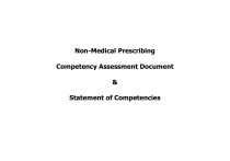 Non-Medical Prescribing Competency Assessment Document & Statement of Competencies Achieving prescribing competencies Read each of the domains and competencies on the following pages and score yourself in relation to your current prescribing knowledge at the start of the module (Start score) using the table below. This should be completed within the first week of starting the module. Scores of 1 and 2 will form the focus for your learning and Personal Development Plan whilst on the module (complete the PDP template provided at the back of this Portfolio of Evidence). You should take this with you to your meetings with your Practice DMP so that you can demonstrate your progress and he/she can help you to plan further activities/experiences to meet your learning needs whilst in practice. In the last week of the module you are required to score yourself again (End score) to demonstrate your achievement as a competent (level 3) non-medical prescriber in your own field of practice within the areas outlined in the introduction to your Portfolio of Evidence. (please submit a signed paper copy) You are required to achieve at least level 3 for each competency statement on completion of the module. Taxonomy Novice Advanced beginner Competent Proficient Expert Score 1 2 3 4 5 (Taken from Benner (1984) From novice to expert: excellence and power in clinical nursing practice. London: Addison-Wesley) Domain A: The consultation NPC competency 1: Knowledge Has up-to-date clinical, pharmacological and pharmaceutical knowledge relevant to own area of practice. Programme learning outcomes: 4, and 6 Competence Start score 1-5 End score 1-5 Start score 1-5 End score 1-5 1. Understands the conditions being treated, their natural progress and how to assess their severity. 2. Understands different non-pharmacological and pharmacological approaches to modifying disease and promoting health, identifies and assesses the desirable outcomes of treatment. 3. Understands the mode of action and pharmacokinetics of medicines and how these mechanisms may be altered (e.g. by age, renal impairment), and how this affects treatment decisions. 4. Understands the potential for adverse effects and how to avoid/minimise, recognise and manage them. 5. Uses up-to-date information about relevant products (e.g. formulations, pack sizes, storage conditions, costs). 6. Applies the principles of evidence-based practice, including clinical and cost-effectiveness. 7. Aware of how medicines are licensed, sourced and supplied, and the implications for own prescribing. 8. Knows how to detect and report suspected adverse drug reactions. Competence 9. Understands the public health issues related to medicines and their use. 10. Appreciates the potential for misuse of medicines. 11. Understands antimicrobial resistance and the roles of infection prevention, control and antimicrobial stewardship1 measures. Initial Formative Assessment Mid point Formative Assessment Final Summative Assessment DMP Signature: …………………............................ DMP Signature: …………………............................ DMP Signature: …………………............................ Student Signature: ...…………............................. Student Signature: .…………............................. Student Signature: ..…………............................. Date: ……………………........................................ Date: ……………………........................................ Date: ……………………........................................ DMP Comment: Date: ………………………………………. Student comment: Date: ……………………………………… 1 Antimicrobial stewardship - Advisory Committee on Antimicrobial Resistance and Healthcare Associated Infection (ARHAI) NPC competency 2: Options Makes or reviews a diagnosis, generates management options for the patient and follows up management. Programme learning outcomes: 1, 2, 6 and 8 Competence 12. Takes an appropriate medical history and medication history which includes both current and previously prescribed and non-prescribed medicines, supplements and complementary remedies, and allergies and intolerances. 13. Undertakes an appropriate clinical assessment using relevant equipment and techniques. 14. Accesses and interprets relevant patient records to ensure knowledge of the patient's management. 15. Makes, or understands, the working or final diagnosis by considering and systematically deciding between the various possibilities (differential diagnosis). 16. Requests and interprets relevant investigations. 17. Considers all treatment options including no treatment, non-pharmacological interventions and medicines usage. 18. Assesses the effect of multiple pathologies, existing medication, allergies and contraindications on management options. 19. Assesses the risks and benefits to the patient of taking or, not taking a medicine or treatment. 20. Where a medicine is appropriate, identifies the different options. 21. Establishes and maintains a plan for reviewing the therapeutic objective, discharge or end point of treatment. 22. Ensures that the effectiveness of treatment and potential unwanted effects are monitored. 23. Makes changes to treatment plan in light of on-going monitoring and patient's condition and preferences. Start score 1-5 End score 1-5 Programme learning outcome : 10 NPC competencies – supplementary prescribing Competence Start score 1-5 End score 1-5 24. Communicates information about medicines and what they are being used for when sharing or transferring prescribing responsibilities/information. 25. Reviews diagnosis and generates management options for the patient within the clinical management plan. Always follows up management. 26. Reviews medical history and medication history which includes both current and previously prescribed and non-prescribed medicines, supplements and complementary remedies, and alle