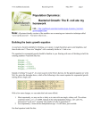 www.mathbench.umd.edu Bacterial growth May 2010 page 1 Population Dynamics: Bacterial Growth: The E. coli ate my homework URL: http://mathbench.umd.edu/modules/popn-dynamics_bacterialgrowth/page01.htm Note: All printer-friendly versions of the modules use an amazing new interactive technique called “cover up the answers”. You know what to do… Building the basic growth equation As you know, bacteria multiply by dividing, so to speak. A single bacterium grows and lengthens, and then divides into 2. Those two "daughter" cells eventually divide in 2. And so on. The equation for exponential growth should be familiar to you. Starting with one cell dividing in half, the resulting numbers would look like this: # in gen0 → 1 # in gen1 → 1*2 # in gen2 → 1*2*2 # in gen3 → 1*2*2*2 # in gen4 → 1*2*2*2*2 Instead of writing "# in gen 4", it is more usual to write N(4). Likewise, for the general equation we write N(t). So, given the formulas above, which of the following is the correct equation for exponential growth starting from a single cell? N(t) = t * 2t N(t) = 1 * 2t N(t) = 1 * 2t N(t) = 1 * t2 no -- otherwise N(3) = 3 * 2*2*2 = 24 no -- otherwise N(3) = 1 * 2*3 = 6 yes -- for example, N(3) = 1 * 2*2*2 = 8 no -- otherwise N(3) = 1 * 3*3 = 9 With a few more changes, we can make this look more official. 1. Most importantly, we may not be so lucky as to start with one single, solitary cell. The culture could start with 2, or 7, or 10,000. Instead of the initial population being 1, let's call it N0, pronounced "n sub zero", meaning "the number of cells in generation 0". 2. Less importantly, I removed the multiplication sign - it's still there, just invisible. Our final equation looks like this: www.mathbench.umd.edu Bacterial growth May 2010 page 2 What does exponential growth look like? Hopefully at this point in your career as a biology student, you have seen a graph of exponential growth. The online version of this module contains an interactive applet which allows you to draw and compare exponential curves. To find this applet got to: http://www.mathbench.umd.edu/modules/popndynamics_bacterial-growth/page02.htm If you take the log of an exponential growth curve, the graph "unbends" itself and turns into a straight line. This kind of graph is called "log-transformed." What happens is a series of numbers that are evenly spaced on a linear scale get spaced differently on a log scale: specifically, on a log scale, the largest numbers get squished together, while the smallest numbers get stretched apart. The online version of this module contains an interactive applet which allows you to log transform the graph of exponential growth and then transform it “back” to a normal graph. To find this applet go to: http://www.mathbench.umd.edu/modules/popndynamics_bacterial-growth/page02.htm Why does log-transformation unbend the plot of exponential growth? Log transformation is a very powerful tool in biology, even if it cannot transform 18-wheelers or pickups trucks into sentient beings. What you do when you log-transform data is change the scale of the data. Normal everyday data is usually expressed on a graph with a linear scale. Linear means that each tickmark on the axis increases the number by the same amount -- for example, the tickmarks might stand for 0, 5, 10, 15, etc. However, our bacterial population is not increasing by the same amount in each timestep. Starting with 1 cell, in the first timestep we add 1 more, in the second timestep we add 2 more, in the third timestep we add 4 more, and so on. The graph does not look like a straight line. When you transform data, you are putting it on a log scale, which is also called a multiplicative scale. The tickmarks on a multiplicative scale represent numbers that differ by the same FACTOR, or www.mathbench.umd.edu Bacterial growth May 2010 page 3 multiplier. And in fact our bacterial populations also differ by the same factor at each timestep -- they double, or increase by a factor of 2. So when you use a log scale, populations separated by the same factor will line up in a straight line. The slope of that line will depend on how big the multiplying factor is, which we'll talk about in a few screens. But the crucial point is: ANY population that grows or shrinks by a constant factor will appear as a straight line when logtransformed. Do ALL curves get "unbent" by taking the log? The only curves that get straightened after log transformation are the ones generated by functions that include "some number to the power of the x variable". Why is that? Recall: ANY population that grows or shrinks by a constant factor will appear as a straight line when logtransformed. All of the other functions involve some sort of change in which the factor of change is NOT constant. Let's take the parabola, for example: y = x2 1 x 1 y factor 2 4 4 3 9 2.25 4 16 1.78 5 25 1.56 6 36 1.44 The factor by which y is increasing starts at 4, then drops to 2.25, then 1.78, and so on. Although we might think that a parabola grows "pretty fast", it is in fact "slow" compared to exponential growth that starts with the same factor. As a general guideline: if growth factors are increasing, then growth is proceeding faster than exponential, and that part of the log-transformed curve will have a relatively steep slope. if growth factors are decreasing, then growth is proceeding slower than exponential, and that part of the log-transformed curve will have a relatively gentle slope. Only constant growth factors (exponential growth) leads to a straight-line when the graph is log-transformed. But how long is a generation? Imagine a single bacterial cell. You might think a cell that is not actively dividing is sitting around, twiddling its non-opposable thumbs or knitting or something. However, this is not actually true. For a while (anywhere from 20 minutes to a few days) the cell spends its time gathering nutrients and synthesizing extra cellular structures. Once that is don