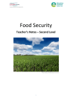 Food Security Teacher’s Notes – Second Level Photo: Nichols_T/FlickR Creative Commons 1 What is food security? Food security is about people having a dependable supply of food in order to survive. A lack of food security can result in malnutrition, disease and death. Many factors affect food security around the world. These include changing weather patterns, crop diseases and also the natural biodiversity of plants from which we choose our crops. Food security can also be affected by decisions about types of agriculture, the way in which agriculture is supported, methods of food distribution or bio-fuel production. Learning experiences Learning should involve activities to process new material, linking it to what a learner already knows. Initial assessment of prior learning should take place and chosen activities to support second level Experiences and Outcomes should take into account how best to ‘undo’ misconceptions’ and build on what is known already avoiding repetition. Tasks should be authentic: set in a meaningful context, and related to the real world. They should not just involve repeating back facts as this causes ‘surface’ learning. Learners need to process information given to them through activities which require them to make personal sense of the material and so construct their own meanings, which improves recall. Learning this way may involve errors so tasks should offer opportunities for self-assessment, correction, peer discussion, teacher feedback and other ‘reality checks’. For this approach higher order thinking skills should be integrated or taught along with content, not separately, to avoid superficial rote learning. Evaluation is integral to most activities, whether through plenary sessions or drawing conclusions and suggesting modifications or improvements with self-assessment, peer assessment or teacher feedback. Learners should, from early on, be reminded to review what they have done and consider what they have learned, what they think worked or didn’t work, or what they could improve upon. 2 Learning Journey 1 Biodiversity and energy flows in ecosystems The food security context at Level 2 should build upon learners’ experiences and exploration of a variety of foods (the beginnings of the idea of biodiversity at species level) and a basic understanding of where they are sourced and how they are packaged for distribution and sale. Learners should have an understanding of simple food chains, and be able to suggest possible consequences of eliminating an organism in a food chain. They should have investigated simple plant structure, be able to use simple plant nomenclature and have basic knowledge of the conditions required for healthy plant growth. Level 2 will apply previous learning to understand and develop the concept of biodiversity and develop the realisation that a biodiverse ecosystem is a healthy and sustainable system important to food security. Biodiversity policing A decree is made that all foods that are of plant origin will be banned in an attempt to reduce the loss of plant biodiversity. The teacher reads out a letter from e.g. the head teacher, the local council, or the government as follows: Regarding plant biodiversity protection: In an attempt to reduce the loss of plant biodiversity, it has been decided that we shall ban the consumption off all foods that are of plant origin. I hope that you will work with us in our attempt to achieve this. Learners analyse different foods and discuss which they won’t be able to eat and why (saying how they think a food item links to plants). Only water should be left. Learners express their understanding to each other of food connection with plants. They may not yet be aware of the term biodiversity and its significance, but this is excellent for raising their awareness of our dependence on plants for food. Books ”The Man Who Planted Trees” by Jean Giono; Pub. Peter Owen Publishers: ISBN 0-7206-0739-6. “The Global Garden” by Kate Petty & Jennie Maizels; Pub. Eden Project Books: ISBN 978-1-90391916-3. Video Legends & Tales - Johnny Appleseed - http://www.youtube.com/watch?v=sfyvL_HV2rw Resources Energy in food Video of burning peanut http://www.youtube.com/watch?v=uz6201OJ1Qo http://blogs.tc.columbia.edu/cfe/education/nutrition-curriculum/c3/c3-supplementalresources/energy-burn/ 3 Written information on how to burn foods for their energy http://www.nuffieldfoundation.org/practical-biology/how-much-energy-there-food Biodiversity • Visit a botanic garden or large garden centre • Survey wild land near the school, photograph different plants • Plant biodiversity poster pack for schools: Pack of 20 posters by Royal Botanic Garden Edinburgh. Contact Tel. 0131 248 1040 Video clips • Kew views: Why does plant diversity matter? - http://bit.ly/1ayn2nk • Filming plants: Discovery Channel - http://dsc.discovery.com/tv-shows/life/videos/filmingplants.htm • Kingdom of Plants 3D with David Attenborough http://www.youtube.com/watch?v=hcKuq9W7IPg • The Secret World of the Plants (55mins) - http://www.youtube.com/watch?v=8QSWP56J8DA Eco-columns Learners research and follow instructions to construct an eco-column or a food-chain model. The websites below make numerous suggestions of how a column can be modified and used for extended investigations to elaborate on both construction techniques and on the biology of the food chain. Bottle Biology from http://www.bottlebiology.org/ SAPS (Science and Plants for Schools) – http://ww.saps.org.uk/ Energy in food Using nutritional labels: http://kids.niehs.nih.gov/explore/hliving/food3_foodlabels.htm Energy flow Selection of energy flow diagrams for compare/contrast: Heat/energy loss: http://utahscience.oremjr.alpine.k12.ut.us/sciber99/8th/energy/sciber/ecosys.htm The flow of solar energy: www.cd3wd.com Energy flow in a biosphere: www.tutorvista.com Mineral cycling and energy flow: www.fisherycrisis.com Energy flow: www.iteachbio.com Con