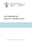 DIAGNOSTIC ACCREDITATION PROGRAM College of Physicians and Surgeons of British Columbia 300-669 Howe Street Vancouver BC V6C 0B4 www.dap.org Telephone: 604-733-7758 Toll Free: 1-800-461-3008 (in BC) Fax: 604-733-3503 DAP SPIROMETRY QUALITY CONTROL PLAN Enhancing public safety through excellence in diagnostic medicine accreditation. Page 2 of 20 Revised: 23 Aug 2012 DAP SPIROMETRY QUALITY CONTROL PLAN Spirometry is a useful diagnostic test commonly performed in a variety of settings; however accurate results are dependent on careful technique, and proper equipment calibration and maintenance. The American Thoracic Society (ATS) and European Respiratory Society (ERS) have recommended a number of procedures to reduce variability including the weekly testing of flow volume measurements. Under the College of Physicians & Surgeons of British Columbia, Diagnostic Accreditation Program (DAP) Spirometry Quality Control Program, facility personnel at each site will perform quality control procedures according to the DAP protocol. Only one set of data is required from each spirometer. If the spirometer is used in more than one site, the patient data submitted should be representative of this. Results are submitted to the DAP twice a year and will give an indication if any areas of concern exist with the spirometer or performance of the tests. An individual report with recommendations will be sent to the facility at the end of each reporting cycle. Level 1 and Level 2 (formerly known as Category IIA and IIB) facilities and private clinics performing spirometry require participation in the DAP Spirometry Quality Control Program as part of their accreditation. Continuing accreditation is based upon the satisfactory review of quality assurance and control data submitted to the DAP. Exemption: If the spirometer used exclusively is the COPD-6 spirometer, as approved by the Medical Services Commission for case finding, DAP accreditation is not required. The DAP Spirometry QC Program follows the recommendations of the American Thoracic Society and European Respiratory Society Task Force: “Standardisation of Lung Function Testing: Standardisation of spirometry”(2005)1. Page 3 of 20 Revised: 23 Aug 2012 SPIROMETRY DEFINITIONS AND REQUIREMENTS Calibration/ Calibration Check: “Calibration” is the procedure for establishing the relationship between sensor-determined values of flow or volume, and the actual flow or volume, using a validated 3-L calibration syringe. Current ambient conditions are entered prior to calibration and the injection rates are varied according to equipment manufacturer’s recommendations to adjust the output with a known input volume. “Calibration Check” is different in that it does not adjust the spirometer; rather it verifies that the spirometer is within calibration limits. As the validated QC syringe may lose accuracy over time, re-validation is performed according to manufacturer’s recommendations. Proof of re-validation is submitted to the DAP annually. Linearity Testing: A spirometer is considered linear if its output is directly proportional to its input, regardless of the flow rate. Loss of linearity is a primary problem with flow sensing spirometers, therefore syringe flow volume loops are performed on a weekly basis to ensure system linearity. The therapist injects the full volume of the validated 3-L syringe into the spirometer at various rates and records the reported volumes. The peak flow rates include one injection at a rate of less than 2 liters per second, one injection at a rate of 4 to 6 liters per second, and one injection at a rate of greater than 8 liters per second. The FVC results must be within the acceptable ranges and the maximum difference between the reported volumes should be less than .105 liters (105 mL) to document that the equipment is within control limits. Enter one set of linearity data per month on the DAP worksheets provided, and include the graphical printout. Data is submitted twice per year, on or before January 15th and July 15th. Biologic Controls (BioQC): A healthy non-smoking individual will perform spirometry testing monthly to assess the overall operational status of the spirometry system. Results are monitored to assess changes in equipment performance that may be undetected in routine calibration. A second BioQC subject should be identified and able to fill in if the primary BioQC subject cannot perform this function due to absence or illness. Enter one set of BioQC data per month on the DAP worksheets provided. Data is submitted twice per year, on or before January 15 th and July 15th. Page 4 of 20 Revised: 23 Aug 2012 Spirometry Requirements: The spirometer must be able to accumulate volume for greater than 15 seconds and measure a volume of greater than 8 liters (BTPS) with an accuracy of ± 3% of reading or ± 0.05 liters, whichever is greater. The facility must have a room thermometer with an accuracy of ± 10C. If room temperature changes by more than 20C, then another calibration must be performed prior to patient testing. Measure height of patients and BioQC subjects accurately. Calibration or calibration checks are performed daily or prior to patient testing. Linearity checks (flow volume loops) should be performed weekly and after equipment repairs, maintenance or software changes. A biologic control (BioQC) should be performed monthly and after equipment repairs, maintenance or software changes. A log of all relevant testing data, service, repairs or software changes, should be maintained. Page 5 of 20 Revised: 23 Aug 2012 SPIROMETRY QUALITY CONTROL PLAN The term “quality control” can be defined as the process of monitoring the accuracy and reproducibility of a test procedure but it also takes into account a number of aspects, any one of which may impact patient results. These include the components that make up the pre-test, test, and post-test: Patient education and preparation Procedure Equipment Reportin