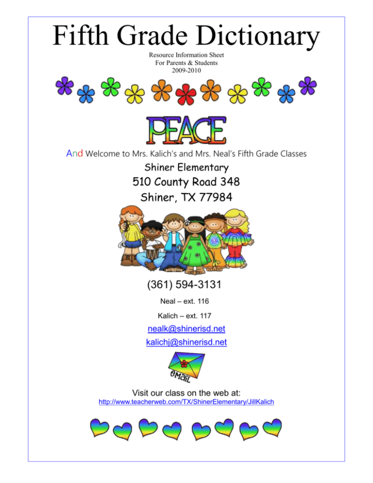 Fifth Grade Dictionary Resource Information Sheet For Parents & Students 2009-2010 And Welcome to Mrs. Kalich’s and Mrs. Neal’s Fifth Grade Classes Shiner Elementary 510 County Road 348 Shiner, TX 77984 (361) 594-3131 Neal – ext. 116 Kalich – ext. 117 nealk@shinerisd.net kalichj@shinerisd.net Visit our class on the web at: http://www.teacherweb.com/TX/ShinerElementary/JillKalich FYI – For Your Information. . . A Attendance: It is essential that your child keep good attendance in school to prepare for testing and future grade levels. Please view school as a priority and see to it that your child attends everyday except in cases of illness or emergency. B Book Orders: Book orders will be sent home several times a year. This is a great resource for purchasing books inexpensively. Please send checks made payable to Scholastic. Birthdays: You may send a treat to celebrate your child’s birthday. These will be usually be served during the last period of the day. Send invitations to school if all children are invited. C Curriculum: Neal – Math/Science; Kalich – Reading/English/Spelling/Social Studies. D Dismissal: School ends at 3:25. All children should be picked up promptly or ride the bus. You must send a note if your child is to go home a different way than his/her normal schedule. E Emergencies: Please make sure we have emergency numbers and information on file for your child. F Field Trips: Our class will participate in field trips this year. Permission slips must be returned for your child to attend. G Grading Scale: The following grading scale is used in 5th grade: A=90-100, B=80- 89, C=70-79, F=69 & below. All graded work will be sent home in a take-home folder on Friday. Sign & return Monday. H Homework: We try to keep homework to a minimum. Spelling packets are assigned every Monday. Math assignments not completed in class will be finished at home. I Internet: Your child will use the Internet to conduct research this year and participate in learning activities. In order to do this, we must have your permission. The teacher will guide all Internet searches. J Journals: Your child will write in a journal throughout the school year. Sometimes this will be an arrival activity other times this may be a reflection activity. K Kindness: Students will demonstrate kindness and respect each day. Remember the Golden Rule! Treat others as you wish to be treated! Page 2 L M Lunch: Time – 12:05 PM until 12:25 PM; Cost – Lunch $1.50 & Breakfast $1.00. Monday: Students will need to bring signed planners and homework folders to school each Monday. N Newsletters: A newsletter will be sent home every Monday to keep parents informed of the learning activities & content, upcoming events, and student achievements. O Organization: Good organization is important to your child’s success! Help your child periodically clean out folders and his/her backpack. P Planners: Your child will be expected to write assignments, tests, and special notes in their planners. Parents/Guardians will need to look these over on Friday and sign. Return Monday. Q Quiet: Quiet classrooms create an atmosphere that is conducive to learning. All students will be expected to respect learning time. R Reading: Reading instruction will be taught through author studies and genre studies in our room. This will challenge all readers and broaden their knowledge of literature. Students will be required to earn 5 Accelerated Reader (AR) points per six week period for a grade. S Scientist of the Week: Every Friday one student from each class will conduct a science experiment for the class. T Tardies: Students should be in the classroom by 7:50 AM. Arriving after this time causes students to lose instructional time. U United States Capitals: Students will be learning the names of the 50 states and capitals this year. V Vocabulary: Vocabulary and spelling words should be studied throughout each week. Students will also need to study prefixes, suffixes, or root words that are assigned weekly. These will be tested on Fridays. W Website: For additional information check out our website. Water: Your child may bring a water bottle to keep at his/her desk as long as it has a lid to prevent spills. XYZ We are extra thrilled to teach your student this year! Page 3 Online Dictionaries for Kids: From: http://familyinternet.about.com/od/websites/tp/kidsdictionaries.htm There are plenty of online dictionaries, but only a few cater to kids. Are you looking for an online dictionary for kids to have age-appropriate definitions and language? Here are some to help your children with their homework, research, and curiosity: Yahoo! Kids Online Dictionary The Yahoo! Kids dictionary is an online edition of the American Heritage Dictionary by Houghton Mifflin. A search with Yahoo! Kids provides a list of possible words meeting the query. For example, the word "earthquake" returns results for both "earthquake" and "earthquake engineer." The dictionary provides suggestions for misspelled words. Click on the word of interest and you will receive an in-depth result, including a sound file with the word pronunciation, multiple definitions (when appropriate), and the etymology (word origin). This is a great dictionary for kids. http://kids.yahoo.com/reference/dictionary/english Word Central Student Dictionary Word Central uses the Merriam-Webster dictionary to provide results. If a user misspells a word, the dictionary will provide suggestions for the correct spelling. It also provides suggestions for words that may have multiple interpretations. For example, a search for "Scientist" offers a number of options including "earth scientist," "social scientist" and "political science." Each definition includes a sound file for pronunciation. It is a nice dictionary for kids. http://www.wordcentral.com/ Little Explorers Picture Dictionary This dictionary is geared towards very young learners and is designed to be browsed, rather than searched. It behaves mor