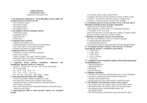 English Phonetics A Theoretical Course Competence-Assessment Test 1. The functional component of sound phenomena (speech sounds and prosodic features) is concerned with 1 thе articulatory aspect. 2 the acoustic aspect. 3 thе auditory aspect. 4 the linguistic aspect. 2. The phonetic system of a language contains 1 elementary sounds. 2 grammatical forms. 3 segmental units. 4 lexical units. 3. Segmental units constitute 1 syllables and rhythmic units. 2 different positions and movements of speech organs. 3 the vocalic and the consonantal subsystems. 4 intensity and duration of speech sounds. 4. Segmental units serve to form 1 morphemes, words, word-forms, utterances. 2 pitch, stress, rhythm. 3 quality, loudness, the length of speech sounds. 4 vibrations of the vocal cords, the amplitude of vibrations, the acoustic effect of vibrations. 5. Segmental sounds perform constitutive, distinctive and identificatory functions which are realized in 1 dreamer – dreamy, pen – ten, ask – asks. He was heard badly. – He was hurt badly. 2 [b – p], [d – t], [g – k], [v – f]. 3 [: – ı], [u: – u], [: – ], [e –æ]. 4 tie – die, seat – seed, said – says, sleeper – sleepy. 6. Suprasegmental (prosodic) units comprise 1 vowels, consonants, syllables, morphemes, words. 2 the subsystems of pitch, stress, rhythm, tempo, pauses. 3 segmental sounds, prosodic phenomena, intonation patterns, pitch changes, utterances. 4 the vocalic subsystem, the consonantal subsystem, intonation groups, pitch levels and ranges. 7. Suprasegmental units in which prosodic features are actualized include 1 tone-groups, tempo, pauses, speech timbre. 2 syntagms, directions and rate of pitch movement, loudness, tempo. 3 sentences, lexical units, intonation contours, accentual units. 4 utterances, intonation groups, rhythmic units, syllables. 8. An intonation pattern (on the perceptive level) is the basic unit of intonation consisting of three prosodic components: 1 pitch movement, loudness, duration. 2 pitch variations, speech melody, the fundamental frequency of vibrations of the vocal cords. 3 pitch with the nucleus (a pitch-and-stress complex), loudness, tempo. 4 stressed syllables, unstressed syllables, rhythm. 9. Phonetics as a linguistic science is concerned with 1 the study of the phonetic system of a concrete language. 2 a sound-production phenomenon. 3 a sound-perception process. 4 the functional aspect of segmental sounds and prosodic phenomena. 10. An adequate prosodic structure of the utterance “Well done” expressing the speaker's evaluation is generated by 1 “ `Well ′done?” 2 “ 'Well `done!” 3 “ 'Well ^done.” 4 – It was 'well done. – 'Well 'done? 11. A linguistic branch of phonetics dealing with functional distinctions of sound phenomena is 1 theoretical phonetics. 2 applied phonetics. 3 phonology. 4 general phonetics. 12. Phonology establishes 1 the types of vowels and consonants that exist in various languages, 2 the systems of phonemes and prosodemes (intonemes). 3 rhythmic units and utterances. 4 speech sounds and their modifications in connected speech. 13. The definition of the phoneme embraces three aspects: 1 the acoustic aspect, the auditory aspect, the articulatory aspect. 2 the material aspect, the abstract aspect, the functional aspect. 3 the linguistic aspect, the physiological aspect, the psychologicalaspect. 4 the functional aspect, the phonetic aspect, the physical aspect. 14. The phonetic contexts in which subsidiary allophones of a phoneme (as opposed to principal ones) occur are represented by 1 light, like, take it, tape it. 2 breed, breeze, port, court. 3 let them, not quite, nightmare, twice. 4 door, daughter, darn, dark. 15. The meaningful function of the English phonemes is realized through their distinctive articulatory features, such as 1 lip position, tenseness, the character of the vowel end (relating to vowel qualities). 2 the dark [ ł ] as in ‘pill’ the clear [ 1 ] as in ‘lip’, the post-alveolar [t] as in ‘try’. 3 occlusive, forelingual, lenis characteristics of [d]. 4 aspiration, labialization, vowel length (relating to consonant and vowel qualities). 16. The conditions for a variety of English pronunciation to be accepted as the orthoepic norm are 1 acknowledgement of a single variety of pronunciation (RP);recognition of the fact that RP has the “prestige accent”; the presence of factors that encourage standardization of pronunciation. 2 registering/recording the well-established variants of pronunciation by the pronouncing dictionaries; the use of the standard pronunciation adopted by the educated people; deviations from the norm viewed as unacceptable in any circumstances. 3 wide currency, conformity to the main phonetic tendencies, social acceptability. 4 intolerance of dialectal pronunciation and variants of non-standard pronunciation; a non-regional character of pronunciation. 17. The most striking of the changes which have affected the pronunciation of British English (RP) in recent times is 1 the assimilation of the following sounds: [ sj ] > [ ], [ zj ] > [ ], [ tj ] > [ ], [ dj ] > [ ] (e.g. ‘issue’, . ‘crozier’, ‘situation’, ‘education’. 2 the centering of former [ou] to [зu] (e.g. ‘home’ [houm] > [hзum]). 3 monophthongization of [aı] and [аu] when followed by [ә] (e.g. ‘tower’ ['tauә] > ['taә], ‘fire’ [faıә] > ['faә]. 4 diphthongization of RP [i:] and [u:] which in a final position are often pronounced with a glide (e.g. ‘see’ [sıj], ‘who’ [huu]. 18. Reduction dealing with stylistic sound modifications in informal speech is found in 1 this year ['ðıjıә], second term [ sekәntз:m]. 2 great burden [ greıp bз:dn], that man [ ðæp mæn]. 3 next to Liverpool ['neksttlvәpu:l]; it's paid well [ts ' pad wel]. 4 it seems to be [ t simz tә b], a new aspect [ә 'nju spekt]. 19. The variants of pronunciation [ kәz] for ‘because’ [k wz] for ‘I think he was’ are co