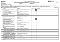 HAP-Gen Page 1 of 12 Infection Prevention Quality Improvement Tools Clinical Practice Process Improvement Tool : Hand Hygiene Environment Functional Area: Start Date: Page 1 of 12 Overall Auditors: Module: Hand Hygiene Environment Date: Auditors: Standard: The environment is designed and managed effectively to minimise reservoirs for micro organisms and reduce the risk of cross infection to patients, staff and visitors. Question Set: Hand Hygiene Environment - Environment Observation: 1 Question Guidance 1 Are hand hygiene policies accessible near to the point of care? ‘Near’ means accessible to all staff during a span of duty . 2 Are alcohol based hand rub bottles available at the point of care? (55, 90) Check it is within reach, this may be a personal Are alcohol based hand rub dispensers visibly clean? (90) Check there is no build up on the nozzle. The dispenser should be functioning with enough solution 3 Yes No N/A Comment dispenser . in the dispenser for the next two uses. 4 Are alcohol-based handrub pocket bottles carried by staff? Select a random selection of staff in the clinical 5 Are alcohol-based handrub bottles available on clinical procedure trolleys? Check procedure trolleys. 6 Are alcohol-based handrub bottles wall mounted in treatment rooms? (90) Check all treatment rooms. 7 Are there dedicated hand wash basins available? (15, 53, 80, 82, 90) Dedicated means for hand washing only. Check for hand wash basin. 8 Is the hand wash basin accessible? (53, 80, 90) Check for obstructions e.g. equipment. 9 Are hand wash basins free from extraneous items? (53) e.g. mugs, medicine pots etc. 10 Is the hand wash basin overflow free? (15) Check the hand wash basin does NOT have an setting (Pocket bottles may be described as personal dispensers) . overflow. 11 Is the waste offset so the water does not flow directly into it? (15) Check the water from the tap does NOT flow directly 12 Are elbow/sensor taps available? (15) Visually check. 13 If no elbow or sensor taps, are staff aware of how to turn off the taps with a paper towel? (15) Observe practice or ask a member of staff to 14 Are mixer taps or thermostatically controlled water available? (15) Test water temperature. 15 Is the hand wash basin in a good state of repair? (15) Check there are no cracks or chips. into the plug hole. describe procedure. Page 1 of 12 HAP-Gen Page 2 of 12 Infection Prevention Quality Improvement Tools Clinical Practice Process Improvement Tool : Hand Hygiene Environment Question Set: Hand Hygiene Environment - Environment Observation: 1 Question Guidance Is the hand wash basin visibly clean? (52, 84) Check plugholes and overflows for cleanliness & 17 Is the soap dispensed from a single use cartridge? (53, 80, 90, 92, 94) Check cartridge, there should be enough soap for the next two uses. 18 Is the liquid soap dispenser wall mounted? Check that the soap dispenser is wall mounted. 19 Is the soap dispenser visibly clean? Check the nozzle for build up of soap and debris. 20 Are paper towels available from an enclosed dispenser? (53, 80, 90) Paper towels should be soft tissue with enough in the dispenser for the next two washes. 21 Is the paper towel dispenser visibly clean? Check underside of dispenser. 22 Is there a hands-free domestic waste bin available for the disposal of paper towels? (53, 56, 80) Visually check. 23 Is the foot pedal of the domestic waste bin in good working order? (53, 80) Check the foot pedal opens the lid. 24 Is the domestic waste bin visibly clean, including lid and pedal? (23, 85, 86) Check bins are clean externally and internally. 25 Is the domestic waste bin in good condition? (23, 85, 86) Check for rust i.e. underneath lid. 26 Are hand care lotion dispensers available in staff changing rooms? (53) Visually check. 27 Are hand hygiene compliance results available? (90) Check for on general wall or in staff room that is Are action plans available to address hand hygiene compliance failures? (90) Action plan with specific time limited actions available where all staff can access it readily, e.g. not in a 16 28 Page 2 of 12 Yes No N/A Comment build up of limescale. accessed by all disciplines. Date of last results presented should be within previous 6 months. locked drawer or office. 29 Are hand hygiene promotional posters displayed at hand wash basins? Check all basins. 30 Are hand hygiene promotional posters displayed in general clinical areas? Check treatment room, clinic, sluice, laundry, domestic room and kitchen. 31 Is a hand hygiene training programme, including behaviour change strategies, conducted at least annually? (90) Check for evidence of complete programme featuring Can staff correctly answer a complete, standard list of knowledge questions on hand hygiene? Ask 5 members of staff of various disciplines to answer standard hand hygiene questions. WHO 32 staff numbers, details and dates. knowledge questions are recommended. Page 2 of 12 HAP-Gen Page 3 of 12 Infection Prevention Quality Improvement Tools Clinical Practice Process Improvement Tool : Hand Hygiene Environment Question Set: Hand Hygiene Environment - Environment 33 Page 3 of 12 Observation: 1 Question Guidance Is there data available on staff tolerance and acceptability to products? (90) Alcohol-based handrub products and soap products Yes No N/A Comment tolerance and acceptability survey results available. WHO survey for tolerance and acceptability recommended. The data may be held by infection prevention or occupational health. Question Set Comments/Recommendations for Hand Hygiene Environment - Environment Question Set: Hand Hygiene Environment - Environment Observation: 2 Question Guidance 1 Are hand hygiene policies accessible near to the point of care? ‘Near’ means accessible to all staff during a span of duty . 2 Are alcohol based hand rub bottles available at the point of care? (55, 90) Check it is within reach, this may be a personal Are alcohol based hand rub dispensers visibly clean? (90) Chec