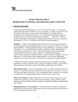 Section 504 Procedures Identification, Evaluation, and Education under Section 504 A. Definition of Disability Section 504 of the Rehabilitation Act of 1973 (“Section 504”) reads: “No otherwise qualified individual with a disability in the United States, as defined in Section 705 (20) of this title, shall, solely by reason of her or his disability, be excluded from the participation in, be denied the benefits of, or be subjected to discrimination under any program or activity receiving Federal financial assistance. . . .” (29 U.S.C. § 794(a).) Identified individuals with disabilities will be placed in the least restrictive educational environment. (34 C.F.R. § 104.34(a); IUSD Parent Notifications page 9). Disability: A student with a disability under Section 504 is one who has a physical or mental impairment that substantially limits one or more major life activities, a record of such impairment, or being regarded as having such an impairment. A physical or mental impairment is: (1) any physiological disorder or condition, cosmetic disfigurement, or anatomical loss affecting one or more of the following body systems: neurological; musculoskeletal; special sense organs; respiratory, including speech organs; cardiovascular; reproductive; digestive, genitor- urinary; hemic and lymphatic; skin; and endocrine; or (2) any mental or psychological disorder, such as mental retardation, organic brain syndrome, emotional or mental illness, and specific learning disabilities. Examples of physical or mental impairments include, but are not limited to: mobility impairments, medical conditions such as epilepsy, hemophilia, diabetes, AIDS, arthritis, allergies/asthma, tuberculosis, cancer, spina bifida, cerebral palsy, and ADHD. Substantially Limits: The term “substantially limits” is not defined under Section 504. However, an impairment that substantially limits one major life activity does not have to also limit other major life activities. Also, an impairment that is episodic or in remission is a disability if it would substantially limit a major life activity when active. Major Life Activities: Major life activities are functions such as caring for one’s self, performing manual tasks, seeing, hearing, eating, sleeping, walking, standing, lifting, bending, speaking, breathing, learning, reading, concentrating, thinking, communicating, and working. Mitigating Measures Not Considered: The determination of whether an impairment substantially limits a major life activity must be made without regard to the ameliorative effects of mitigating measures such as: -1- 1. Medication, medical supplies, equipment, or appliances, low-vision devices (which do not include ordinary eye glasses or contact lenses), prosthetics including limbs and devices, hearing aids and cochlear implants or other implantable hearing devices, mobility devices, mobility devices, or oxygen therapy equipment and supplies; 2. Use of assistive technology; 3. Reasonable accommodations or auxiliary aids or services; or 4. Learned behavioral or adaptive neurological modifications. The term “auxiliary aides and services” includes: 1. Qualified interpreters or other effective methods of making aurally delivered materials available to individuals with hearing impairments; 2. Qualified readers, taped texts, or other effective methods of making visually delivered materials available to individuals with visual impairments; 3. Acquisition or modification of equipment or devices; and 4. Other similar services and actions. Mitigating Measures Considered: Conversely, the ameliorative effects of the mitigating measures of ordinary eyeglasses or contact lenses must be considered in determining whether an impairment substantially limits a major life activity. Thus, if a student’s vision while using ordinary eyeglasses or contact lenses is not substantially limited, he or she would not qualify as a student with a disability under Section 504 on that basis. B. Referral, Assessment, and Evaluation Procedures 1. The District will evaluate any student who it suspects has a disability that would result eligibility under Section 504. 2. Each school shall designate a Section 504 school site coordinator to be responsible for implementing referral, assessment, and evaluation procedures. 3. A student may be referred by anyone, including a parent/guardian, teacher, other school employee, or community agency, for consideration as to whether the student should be assessed to determine if he or she qualifies as a student with a disability under Section 504. This referral should be made to the Section 504 school site coordinator. Any requests made to another District employee will be forwarded to the Section 504 school site coordinator -2- 4. The District has the responsibility to ensure that students are evaluated if there is reason to suspect that they may qualify under Section 504. Therefore, it is important that students who are or may be disabled are referred to the Section 504 school site coordinator so that the assessment process may be initiated as appropriate. Some examples of students who should be considered for referral include the following: Students with medical conditions such as severe asthma, diabetes, AIDS, or heart disease. A student who uses a wheelchair or other mobility device. A student with a degenerative neurological disorder, a student who is missing a limb, or a student with other impaired manual skills. A student with poor or failing grades over a lengthy period of time. A student with frequent referrals for behavioral problems. 5. The Section 504 Team shall promptly consider the referral and determine what assessments are needed in all suspected areas of disability to evaluate whether the student is a student with a disability under Section 504 and what special needs the student may have. The decision regarding what assessments shall be undertaken shall be based on a review of the student’s school records (including aca
