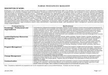 HUMAN RESOURCES MAN AGER DESCRIPTION OF WORK: Employees in this banded class provide leadership and supervision to professional/technical staff in the delivery of a contemporary human resources program(s) that advance the university’s strategic goals and objectives. Employees perform the full-range of managerial duties with emphasis on hiring, retaining and engaging staff accountable for exemplary customer service. Employees understand the organization’s key business drivers in order to function as business partners with university leadership. Employees build trust and respect for the HR program and gain the confidence of others at all levels in the organization. Employees creatively apply professional knowledge, skills and abilities to strategize and plan, coordinate and administer program(s) that: 1) identify and proactively respond to trends and their impact on the organization’s long term goals; 2) manage change efforts that encourage and engage staff at all levels in the improvement process and 3) help constructively shape the organization’s culture. Program areas include: benefits administration; career planning; classification; compensation; employee retention and organizational culture enhancement; employee relations; employment; environment, safety and health; equal employment opportunity; HR Information Systems; international employment; legal compliance; payroll; policy administration; organizational design; staff development; talent management; workforce planning and/or closely related programs. Competency Knowledge – Professional and Organizational Leadership/Human Resources Management Program Management Change Management Communication Definition Comprehensive professional knowledge of principles, theories and best practices in human resource program development for area(s) of specialization and knowledge of the related business context, developed through a combination of formal training and practical experience, and the ability to creatively apply both to generate relevant solutions to emerging trends and to assure exemplary customer service. Stays current with emerging program and technology developments and trends in HR, related organizational and political events, and business disciplines and strategies. Is committed to the principles of continuous improvement and authentic leadership. At the Advanced Level, employees link all human resources knowledge to the university strategic plan, incorporating measures of success. Determines staffing needs and directly supervises (recruits, selects, develops, coaches, mentors, counsels, disciplines, and evaluates the performance of) employees to employ and retain a professionally skilled, diverse workforce actively engaged in providing exemplary customer service with integrity and backbone. Assures staff members have the contacts, training, guidance, resources and work environment necessary to be successful in accomplishing their work. Leads by example and coaches staff to be accountable for their actions and their professional development. Acts as an authentic leader enhancing collaboration among individuals and groups (internal and external); respecting diverse and divergent opinions; building consensus when dealing with opposing points of view and resolving competing or complex issues; promoting a high level of integrity and building trust among all in the organization. Leads one or more programs and all related activities, serving as the program’s credible activist and advocate. Analyzes the entirety of the situation despite pressure, ambiguity, risk and unknown outcomes. Delivers results with integrity; advocates and shares knowledge and critical thinking process to achieve consensus. Evaluates the relationships and interrelationships of all the issues across organizational boundaries (as needed). Takes appropriate risks, provides candid observations and advocates and promotes best practices for the program(s). Is committed to accomplish work in an ethical and efficient manner and is accountable for achieving mutually beneficial results, for ensuring fair and consistent application of program policies and procedures and for the program(s) fiscal accountability. Constructively and collaboratively challenges the status quo to improve performance and enhance the organization’s culture; implements change initiatives with commitment and drive. Understands potential barriers to change and develops people strategies that support the change agenda. Supports staff and all affected in the organization to accept and overcome challenges to change. Clearly conveys information (verbal and written) with and to individuals or groups to ensure information is shared and that messages are understood. Demonstrates effective use of listening and questioning skills and displays openness to other people's ideas and thoughts. Gains credibility by fostering respect for all individuals and points of view. Note: Competency statements are progressive and not all competencies apply to every position/employee. Evaluate only those that apply. January 2008 Page 1 of 7 Knowledge – Professional and Organizational Comprehensive professional knowledge of principles, theories and best practices in human resource program development for area(s) of specialization and knowledge of the related business context, developed through a combination of formal training and practical experience, and the ability to creatively apply both to generate relevant solutions to emerging trends and to assure exemplary customer service. Stays current with emerging program and technology developments and trends in HR, related organizational and political events, and business disciplines and strategies. Is committed to the principles of continuous improvement and authentic leadership. At the Advanced Level, employees link all human resources knowledge to the university strategic plan, incorporating measures of success. Contributing Journey Advanced 1. Knowledge of HR progr