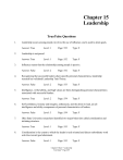 Chapter 15 Leadership True/False Questions 1. Leadership occurs among people, involves the use of influence, and is used to attain goals. Answer: True 2. Level: 2 Page: 552 Type: F Level: 2 Page: 553 Type: F Level: 2 Page: 554 Type: F Level: 3 Page: 554 Type: F Ohio State University researchers identified two major behaviors called consideration and initiating structure. Answer: True 8. Type: F Self-confidence, honesty and integrity, enthusiasm, and the desire to lead, are all intelligence and ability components of personal characteristics of leaders. Answer: False 7. Page: 552 Intelligence, verbal ability, and high values are three distinguishing personal characteristics associated with successful leaders. Answer: True 6. Level: 1 Recognizing that successful leaders share specific personal characteristics, leadership research has validated Leadership Trait Theory. Answer: False 5. Type: F Influence means that the relationship among people is passive. Answer: False 4. Page: 552 Leadership is reciprocal. Answer: True 3. Level: 1 Level: 1 Page: 555 Type: F Consideration is the extent to which the leader is task oriented and directs subordinate work activities toward goal attainment. Answer: False Level: 1 Page: 555 Chapter Fifteen * Leadership Test Bank * Page 409 Type: F 9. Initiating structure is the extent to which the leader is mindful of subordinates, respects their ideas and feelings, and establishes mutual trust. Answer: False 10. Level: 2 Page: 557 Type: F Level: 3 Page: 557 Type: F Level: 2 Page: 558 Type: F Level: 2 Page: 559 Type: F Level: 2 Page: 559 Type: F According to Fiedler, the task-oriented leader excels in the favorable situation whereas relationship-oriented leaders are most effective in situations of moderate favorability. Answer: True 18. Level: 2 Task Structure refers to the extent to which the leader has formal authority over subordinates. Answer: False 17. Type: F According to Fiedler, leader-member relations, task structure and task consideration are the three factors that combine to determine the leadership situation. Answer: False 16. Page: 556 To match the leader's style with the situation by changing factors in the situation to achieve the best match is the basic idea with Fiedler's contingency theory. Answer: True 15. Type: F The country club management style (1,9) stresses high service and concern for guests or customers, sometimes to the detriment of employees of the firm. Answer: False 14. Page: 556 Job-centered leaders are those leaders that establish high performance goals and display supportive behavior toward subordinates. Answer: False 13. Type: F The leaderhsip grid suggests a two-dimensional leadership theory that measures a leader's concern for people and concern for production. Answer: True Level: 3 12. Page: 556 Ohio State's "high-high" style is not always the best, according to new research. Answer: True 11. Level: 1 Level: 2 Page: 560 Type: F Hersey and Blanchard's situational theory focuses a great deal of attention on the characteristics of employees in determining appropriate leadership behavior. Chapter Fifteen * Leadership Test Bank * Page 410 Answer: True 19. Type: F Level: 2 Page: 564 Type: F Level: 2 Page: 564 Type: F Level: 1 Page: 565 Type: F Level: 2 Page: 567 Type: F Level: 2 Page: 567 Type: F A transactional leader is an inspirational leader who has the ability to motivate subordinates, through personal transactions, to transcend their normal performance. Answer: False 27. Page: 563 A neutralizer is a situational variable that counteracts a leadership style and prevents the leader from displaying certain behaviors. Answer: False 26. Level: 2 A substitute counteracts the leadership style and prevents the leader from displaying certain behaviors. Answer: False 25. Type: F The work environment contingencies, according to the Path-Goal theory, include the degree of task structure, the nature of the formal authority system, and the work group itself. Answer: True 24. Page: 563 If someone believes in telling their subordinates exactly what they are supposed to do, then they are exercising a supportive leader behavior, according to the Path-Goal theory. Answer: False 23. Level: 2 The leader can increase employee motivation, according to the Path-Goal theory, by either (1) clarifying the employee's path to accomplish goals, or (2) maximizing the value of the rewards available to successful employees. Answer: True 22. Type: F According to Hersey and Blanchard, the telling style is appropriate for followers with moderate readiness. Answer: False 21. Page: 562 Situational theory model is easier to understand than Fiedler’s model, but it incorporates only the characteristics of followers, not those of the situation. Answer: True 20. Level: 2 Level: 2 Page: 568 Type: F A transformational leader is a leader distinguished by a special ability to bring about innovation and change. Chapter Fifteen * Leadership Test Bank * Page 411 Answer: True 28. Level: 1 Page: 572 Type: F Level: 2 Page: 572 Type: F Level: 2 Page: 572 Type: A Level: 2 Page: 572 Type: F Level: 1 Page: 572 Type: F Level: 1 Page: 573 Type: F Empowering employees works because total power in the organization seems to increase. Answer: True 37. Type: F Referent power is the type of power that results from political referrals. Answer: False 36. Page: 572 Two types of personal powers are expert and reward powers. Answer: False 35. Level: 1 The powers most likely to generate resistance from employees are legitimate and reward powers. Answer: False 34. Type: F When Bob shouts at Tara in public for not finishing her work and suspends her for two days, he is using his coercive power. Answer: True 33. Page: 571 The type of power that results from the leader's legitimate authority, based upon his or her position within the organization, is called coercive power. Answer: False 32. Level: 1 Legitimate, reward, and expert powers are all forms of position power. Answer: False 31. Type: F Mechan