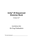 Unity® 45 Sequenced Grammar Book Vantage Lite™ Verda McGraw, M.Ed. Go Frog Publications This book belongs to: ______________________________ 2 Minspeak and Unity are registered trademarks of Semantic Compaction Systems. Vanguard and Vantage are registered trademarks for products made by the Prentke Romich Company. ©2001 Go Frog Publications. All Rights Reserved. A Minspeak® System derivative work, made under license of Semantic Compaction Systems. All Rights Reserved. Prentke Romich Company web site: www@prentrom.com Unity 45 Sequenced Grammar Book - Vanguard / Vantage Plus/Vantage Lite Prentke Romich © 2008 3 Unity 45 Sequenced Grammar Book Contents Interjections …………………………………………….. 4 Nouns …………………………………………...………. 7 Plural nouns …………………………...…………. 13 Proper nouns ………………………...………….. 20 Possessive nouns ……………………………….. 21 Verbs ……………………………………………………… 42 Verb tenses ……………………………………….. 49 Linking verbs ……………………………………… 53 Pronoun + Verb phrases ………………………………. 57 Adjectives ………………………………………………… 62 Prepositions ……………………………………………… 78 Adverbs …………………………………………………… 81 Unity 45 Sequenced Grammar Book - Vanguard / Vantage Plus/Vantage Lite Prentke Romich © 2008 4 Interjections An Interjection is a little word that "pops up" in conversation just like fireworks over a city. Many interjections are social words and phrases that help you be polite. All interjections begin with the INTERJ icon. Match the following interjections with the correct sequence. please thank you sorry awesome congratulations good morning hi good-bye Unity 45 Sequenced Grammar Book - Vanguard / Vantage Plus/Vantage Lite Prentke Romich © 2008 5 Teachers' Cheat Sheet After you select the INTERJ icon , your Vanguard / Vantage screen looks like this: Tool Tip To correct for unwanted double hits, or "bouncing" impulsively on the keys, go to the Selection Technique Menu in the toolbox. Increase the Accept Time one increment at a time. Unity 45 Sequenced Grammar Book - Vanguard / Vantage Plus/Vantage Lite Prentke Romich © 2008 6 Happy Holidays! Select the INTERJ icon and the GOD icon Vantage screen looks like this: . Your Vanguard/ Practice: Select Clear Display and Choose Activity to start over. Then say: 1. 3. 5. 7. 9. Happy Birthday Happy Mothers' Day Happy Halloween Happy Fathers' Day Happy Hanukkah 2. Merry Christmas 4. Happy Valentines Day 6. Happy New Year 8. Happy Holidays 10. Happy Thanksgiving Unity 45 Sequenced Grammar Book - Vanguard / Vantage Plus/Vantage Lite Prentke Romich © 2008 7 NOUNS are Names A Noun is the name of a person, place, or thing. Many Nouns appear in the activity row of your Vanguard/ Vantage. Some nouns tell the name of a category. These nouns appear highlighted in orange where the STOP icon is. Nouns that name people -- Let's begin with some FAMILY names. Select the FAMILY icon Vantage screen looks like this: . Your Vanguard/ Use the MORE key at the end of the activity row to see more family names. Unity 45 Sequenced Grammar Book - Vanguard / Vantage Plus/Vantage Lite Prentke Romich © 2008 8 NOUN Practice Find these pictures in your FAMILY activity row. Say the noun. Write the correct noun under each picture. ____________ ____________ Tool Tip Tool Tip ____________ _ ____________ To change the pictures in your Family activity row, use the Setup Key. Select the icon you want to change. Select Change Icon. Follow the prompts on your screen. Unity 45 Sequenced Grammar Book - Vanguard / Vantage Plus/Vantage Lite Prentke Romich © 2008 9 More People Nouns Different kinds of people begin with the WANTED icon Say these nouns. Write the nouns under the pictures. ____________ ____________ _________ _________ _ _____________ _______________ ________________ _______________ _____________ _____________ Unity 45 Sequenced Grammar Book - Vanguard / Vantage Plus/Vantage Lite Prentke Romich © 2008 10 Teachers' Cheat Sheet for PEOPLE nouns After you select the WANTED icon, your Vanguard/ Vantage looks like this: Use the MORE key at the end of the activity row to see more people nouns. Unity 45 Sequenced Grammar Book - Vanguard / Vantage Plus/Vantage Lite Prentke Romich © 2008 11 Nouns in Sentences Fill in the blanks with the best noun. Say the nouns with your Vanguard/ Vantage. Score 10 points for each correct answer. 1. Your ____________________ is a boy. sister aunt brother 2. My sister is a ___________________. brother girl grandpa 3. My grandmother was a ______________a long time ago. girl boy sister 4. Your mother or your father is also called your ____________. brother parent kid 5. If you are a girl, you are your grandmother's _____________. aunt parent granddaughter 6. If you are a boy, you are your grandmother's ____________. neighbor grandson father 7. Your parents are your mother and your ________________. son daughter father 8. A mother and a father have some _____________________. children wife boy Unity 45 Sequenced Grammar Book - Vanguard / Vantage Plus/Vantage Lite Prentke Romich © 2008 12 9. When you are a _____________, you should obey your parents. grandparent neighbor child 10. Our dog is a part of our ___________________. baby family sister 11.Grandparents like to give presents to their ___________. mom grandchildren kid 12.Your mother's son is your ________________. parent brother grandpa 13.You are your grandmother's _____________________. grandson baby grandaughter 14.Your grandfather was a ________ when he was younger. visitor boy sister 15.Your mother's mother is your____________________. aunt neighbor grandmother My Score:____________________Date_________________ Tool Tip If your Vanguard/ Vantage is not