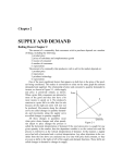 Chapter 2 SUPPLY AND DEMAND Boiling Down Chapter 2 The amount of a commodity that consumers wish to purchase depends on a number of things, including the following: 1. product price 2. prices of substitute and complementary goods 3. income of consumer 4. number of consumers 5. expectations The amount of a commodity that producers wish to sell in the market depends on: 1. product price 2. input prices 3. producer technology 4. expectations One of the most significant factors that appears on both lists is the price of the product being considered. This makes it convenient to relate on the same graph the amount demanded and supplied. The relationship of price and consumer’s quantity demanded is inverse, as shown in Figure 2-1, while supply and price is positively related, as shown. Price When a price falls, consumers are attracted to more of the good and they also have a bit S more money to spend on it. The producer's reaction to a price fall is to offer less for sale because all the high-cost units will now not be produced. Movements along the demand curve are called changes in quantity demanded, and movements along the supply curve D are called changes in quantity supplied. All these changes in quantities occur Quantity when price alone changes and when quantiFigure 2-1 ties adjust to price changes the process is called the horizontal interpretation of demand. If the reservation price is sought for any given quantity in the market, then the dependent variable is on the vertical axis and the process is referred to as the vertical interpretation of demand. In like manner, a supply curve has both a horizontal and a vertical interpretation. Any other alterations in the variables from the lists above are analyzed one at a time with price held constant, so they are seen as shifts to the right or left of the supply and demand functions. These shifts are called changes in demand or changes in supply. 2 CHAPTER 2: Supply and Demand Once the market model is understood and modeled, the model can be used to explore the effects of all kinds of events and policies. It is important to keep in mind that, as one changes the variables in the model, only one should be changed at a time. Otherwise, too much will happen at once and the cause of the changes cannot be identified. Market equilibrium is the place where supply and demand intersect. At that point all sellers who want to sell at that price can find buyers and all buyers who want to buy at that price can find a purchase. Another way to see the desirability of equilibrium is to recognize that the demand curve measures the extra benefit received from each additional item bought, and the supply curve measures the cost of each additional item produced. Any point to the left of equilibrium means that, for that item, the benefit exceeds the cost. Likewise, for all points to the right of equilibrium, the costs are greater than the benefits. Chapter 1 showed why when B > C the action is taken. (In this case, the item is bought.) Also when C > B the action is rejected. (In this case, the item is not purchased.) Thus where supply equals demand, the purchasing stops and equilibrium is reached. The sum of the net benefits of each participant in the market is maximized at this point, and therefore equilibrium is the standard against which other outcomes are measured. Using this framework, it is easy to see why intrusions into the market that prevent equilibrium from being reached also limit the amount of satisfaction that the market can generate. Too many seats sold in an airplane, rent controls on apartments, or price supports for agricultural goods are all cases in which the equilibrium quantity is either not reached or is exceeded because of the policy intrusion. (Appendix) Sales taxes on the buyer reduce the benefit from the purchase because of the tax. Likewise, a tax on the seller for each unit sold increases the cost of each product to the seller. This effect on the benefit and cost functions will move the market outcome away from the pre-tax equilibrium and reduce overall welfare to society. Chapter Outline 1. Supply and demand analysis is the basic tool for analyzing markets. a. The law of demand shows that quantities purchased in a market are inverse functions of price. b. Supply in a market is a direct function of price. c. When quantity is the dependent variable and price the independent variable, a horizontal interpretation of supply or demand is involved. When the variables are reversed and price is the dependent variable the interpretation is vertical. (Be aware that, in contrast to standard procedure, in market analysis the independent variable is on the vertical axis rather than on the horizontal axis.) d. When put together these functions show an equilibrium price and output as well as the surpluses and shortages that will come from disequilibrium prices. 2. An equilibrium price brings maximum welfare to the system. 3. Equilibrium in markets does not guarantee fairness for all. 4. Tampering with the market price leads to inefficiency. a. Allocation using a first-come-first-served method reduces consumer welfare. b. Price fixing results in disequilibrium outcomes. 5. Supply and demand are complex functions influenced by many factors. CHAPTER 2: Supply and demand 3 a. Demand for a good varies with the size of the population and with consumers' income, tastes, expectations, and response to other goods' price changes. b. Supply of a good depends upon existing technology, factor prices, the number of suppliers, and their expectations. 6. Shifts in the market curves are called changes in demand or supply, respectively. 7. Movements along the supply or demand curves that are induced by shifts in the opposite curve are called changes in quantity supplied or demanded, respectively. 8. (Appendix)Public policy, such as a sales tax, affects equilibrium outcomes in the same way, regardless of whether the tax is levied directly on the consumer or the produc