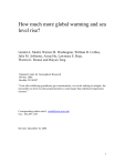 How much more global warming and sea level rise? Gerald A. Meehl, Warren M. Washington, William D. Collins, Julie M. Arblaster, Aixue Hu, Lawrence E. Buja, Warren G. Strand, and Haiyan Teng National Center for Atmospheric Research PO Box 3000 Boulder CO 80307 “Even after stabilizing greenhouse gas concentrations, we can do nothing to mitigate the inexorable sea level rise that proportionately is much larger than stabilized temperature increase.” Corresponding author email: meehl@ncar.ucar.edu Fax: 303-497-1333 Revised December 10, 2004 1 Climate change simulations with two global coupled climate models show that even if the concentrations of all greenhouse gases (GHGs) had been stabilized in the year 2000, average global surface temperature would still rise by about several tenths of a degree centrigrade by the end of the 21st century. Sea level also would continue to rise about twice as much as that which occurred during the 20th century from thermal expansion of sea water alone. Several tenths of a degree additional warming occurs in the models for the next 200 years after stabilization in the year 2100, but again with twice as much sea level rise after 100 years, and another doubling in the next 100 years to 2300. The range of temperature responses of the models for a given scenario for most of the next century is smaller than the range of the equilibrium climate sensitivities of the models. Weakening of the meridional overturning circulation in the North Atlantic projected in these scenarios does not lead to a net cooling in Europe. At any given point in time, there is a commitment to further climate changes even if concentrations are stabilized, implying that the climate changes to come will be greater than those we have already observed. It has long been known that increases of greenhouse gases produce a positive radiative forcing of the climate system, and a consequent warming of surface temperatures and sea level rise from thermal expansion of the warmer sea water in addition to melting glaciers and ice sheets (1,2). If concentrations of GHGs could be stabilized at some level, it is 2 also well-known that the thermal inertia of the climate system would result in further increases in temperatures, and sea level would continue to rise (2, 3, 4, 5, 6). That is, at any given point in time, due to the prior increases in GHGs, even if we could stabilize GHG concentrations we are committed to further anthropogenic climate change that we can do nothing about (7), and sea level rise is likely to be greater over time than temperature increase (2, 8, 9). Simulations are performed here to address these concepts using two global coupled three dimensional climate models with multi-member ensembles to quantify how much more global warming and sea level rise (from thermal expansion) we could experience under several different scenarios with two different global coupled climate models. The Parallel Climate Model (PCM) has been used extensively for climate change experiments (10, 11, 12, 13, 14, 15). This model has a relatively low climate sensitivity compared to other models, with an equilibrium climate sensitivity of 2.1C and a transient climate response (TCR, the globally averaged surface air temperature change at the time of CO2 doubling in a 1% CO2 increase experiment) of 1.3C. The former is indicative of likely atmospheric feedbacks in the model, and the latter includes ocean heat uptake and provides an indication of the transient response of the coupled climate system (6, 12). A second global coupled climate model is the newly developed Community Climate System Model version 3 (CCSM3) with higher horizontal resolution (atmospheric gridpoints roughly every 1.4 compared to the PCM with gridpoints about every 2.8) and improved parameterizations in all components of atmosphere, ocean, sea ice and land surface (16). Both have about 1 ocean resolution with 0.5 in the equatorial 3 tropics, with dynamical sea ice and land surface schemes. These models are run for 4 and 8 member ensembles for PCM and CCSM3, respectively, for each scenario (except for the CCSM3 with four members for the 20th century stabilization and five members for A2). The considerable computational burden required for these runs was spread between supercomputer centers in the U.S. (National Center for Atmospheric Research, Oak Ridge National Laboratory, National Energy Research Scientific Computing Center, and Los Alamos National Laboratory) and supplemented by additional runs of CCSM3 on the Earth Simulator in Japan. The CCSM3 has somewhat higher sensitivity, with an equilibrium climate sensitivity of 2.7C and TCR of 1.5C. Additionally, the meridional overturning maximum in the North Atlantic, indicative of the thermohaline circulation in the ocean, is stronger in the pre-industrial simulation in PCM (32.1 Sv) compared to the CCSM3 (21.9 Sv) with the latter closer to observed estimates that range from 13 to 20 Sv (17, 18, 19). This will turn out to be important since the mean strength of the meridional overturning and its changes are an indication of ocean ventilation and contribute to ocean heat uptake and consequent timescales of temperature response in the climate system (12, 20). The 20th century simulations for both models include time-evolving changes in forcing from solar, volcanoes, GHGs, tropospheric and stratospheric ozone, and the direct effect of sulfate aerosols (14, 21). Additionally, the CCSM3 includes black carbon distributions scaled by population over the 20th century, with those values scaled by sulfur emissions for the rest of the future climate simulations. The CCSM3 also uses a different solar 4 forcing dataset for the 20th century (22). These 20th century forcing differences between CCSM3 and PCM are not thought to cause large differences in response in the climate change simulations that use the same forcings in both models beyond the year 2000. The warming in both the PCM and CCSM3 is close to the ob